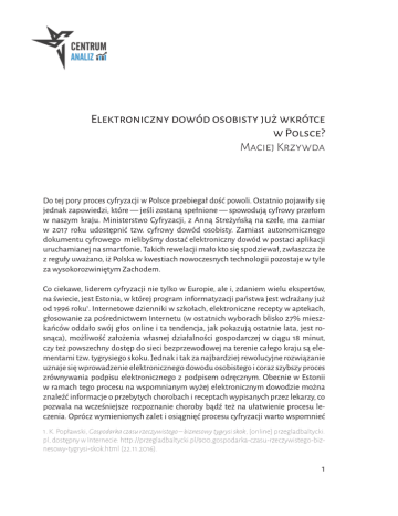 Mikołaj kukliński Podatek samochodowy Elektroniczny dowód osobisty już wkrótce w Polsce? nowym podatkiem, który miałby obowiązywać właścicieli samochodów niespełniająMaciej Krzywda W mediach niedawno pojawiła się informacja, że Ministerstwo Finansów pracuje nad cych normy emisji spalin „Euro 4”, czyli wyprodukowanych przed 2006 rokiem. Szczegóły mają zostać opublikowane we wrześniu bieżącego roku. Aktualne informacje udzielane przez Ministerstwo są dość skąpe. Zgodnie z nimi nowy podatek nie ma na celu budżetu, ma jedynie utrzymać je na tym samym Do tejzwiększenia pory proces dochodów cyfryzacji wdo Polsce przebiegał dość powoli. Ostatnio pojawiły się poziojednak zapowiedzi, które — jeśli zostaną spełnione — spowodują cyfrowy mie1. Nie ma możliwości wprowadzenia dodatkowego podatku, który przełom współistniałby w naszym kraju. Ministerstwo Cyfryzacji, z Anną Streżyńską na czele, ma zamiar akcyzowym. To cyfrowy sugeruje,dowód że w grę wchodziZamiast przede wszystkim modyfikacja wz podatkiem 2017 roku udostępnić tzw. osobisty. autonomicznego dokumentu cyfrowego dostać elektroniczny dowód obecnego stanu rzeczy,mielibyśmy który przedstawia się następująco. w postaci aplikacji uruchamianej na smartfonie. Takich rewelacji mało kto się spodziewał, zwłaszcza że Podatek akcyzowy 3,1% od wartości pojazdu w przypadku z reguły uważano, iż Polskawynosi w kwestiach nowoczesnych technologii pozostajesamochodów w tyle za wysokorozwiniętym Zachodem. wyposażonych w silniki o pojemności skokowej do 2000 cm3 oraz 18,6% powyżej tej pojemności (Tab. 1). Mimo nie że jego to sugerować, podatek ten nie Co ciekawe, liderem cyfryzacji tylkokryterium w Europie, może ale i, zdaniem wielu ekspertów, na Estonia, w której informatyzacji państwa jest wdrażany maświecie, na celujest zmniejszenia emisjiprogram szkodliwych substancji. Ta zresztą nie zależyjuż tylko od od 1996 roku1. Internetowe dzienniki w szkołach, elektroniczne recepty w aptekach, pojemnościzasilnika, lecz także od wieku zastosowanych fabrycznie głosowanie pośrednictwem Internetu (wkonstrukcji, ostatnich wyborach blisko 27% miesz- systekańców oddało swój głosspaliny onlineiistanu ta tendencja, jak pokazują ostatnie lata, jest romów oczyszczających technicznego samochodu. W praktyce dochody snąca), możliwość założenia własnej działalności gospodarczej w ciągu 18 minut, z akcyzy zasilają bezpośrednio państwa, nie więc żadnego konkretnego czy też powszechny dostęp do siecibudżet bezprzewodowej na mają terenie całego kraju są elementami tzw. tygrysiego skoku. Jednak i tak za najbardziej rewolucyjne rozwiązanie przeznaczenia. uznaje się wprowadzenie elektronicznego dowodu osobistego i coraz szybszy proces Tab. 1 zrównywania podpisu elektronicznego z podpisem odręcznym. Obecnie w Estonii Stawka akcyzyna wspomnianym wyżej elektronicznym dowodzie można w ramach tego procesu Pojemność skokowa wartości pojazdu znaleźć informacje o%przebytych chorobach i receptach wypisanych przez lekarzy, co 3 < 2000 cm 3,1 pozwala na wcześniejsze rozpoznanie choroby bądź też na ułatwienie procesu le> 2000Oprócz cm3 18,6 czenia. wymienionych zalet i osiągnięć procesu cyfryzacji warto wspomnieć Źródło: http://www.finanse.mf.gov.pl/documents/766655/927897/stawki_akcyzy_2016.pdf 1. K. Popławski, Gospodarka czasu rzeczywistego – biznesowy tygrysi skok, [online] przegladbaltycki. pl, dostępny w Internecie: http://przegladbaltycki.pl/900,gospodarka-czasu-rzeczywistego-biznesowy-tygrysi-skok.html (22.11.2016). 1 P. Kozłowski, 7 na 10 kierowców zapłaci nowy podatek?, [online] moto.pl, dostępny w Internecie: http://moto.pl/ MotoPL/1,88389,20415652,7-na-10-kierowcow-zaplaci-nowy-podatek.html (dostęp: 15.08.2016). 1 1 o zagrożeniach. Ostatni i do tej pory jedyny atak hakerski, z którym musiała zmierzyć się „e-Estonia”, wydarzył się blisko 9 lat temu. Od tamtej pory Estonia kładzie jeszcze większy nacisk na bezpieczeństwo infrastruktury informatycznej kraju, bazując na własnych doświadczeniach oraz korzystając ze wsparcia międzynarodowego. Jeżeli chodzi o większe kraje niż Estonia, to swoje strategie dotyczące spraw cyfryzacji i informatyzacji przygotowały takie państwa i organizacje jak: Stany Zjednoczone, Norwegia, Wielka Brytania, Organizacja Narodów Zjednoczonych oraz Unia Europejska. Strategia cyfryzacji Zjednoczonego Królestwa Wielkiej Brytanii i Irlandii Północnej opiera się na zwiększonej przejrzystości oraz otwartym dostępie do Open Data. Mając na uwadze tę ostatnią inicjatywę, władze Wielkiej Brytanii opublikowały już dwa plany działania — jeden w 2011 roku, a drugi dwa lata później. Ich celem jest powołanie ogólnodostępnego centralnego rejestru informacji, w tym pierwszego na świecie spisu prawdziwych właścicieli brytyjskich przedsiębiorstw, zwiększenie przejrzystości zawierania kontraktów sektora publicznego z biznesem oraz informacji na temat przepływu kapitału. To ostatnie powinno zainteresować zwłaszcza zwolenników kapitałów narodowych. W Polsce wychodzi na jaw dużo afer związanych z dotychczas przeprowadzaną cyfryzacją, w tym sposobem, w jaki zostały zmarnowane pieniądze na sprzęt, którego nie użył nawet jeden urzędnik. Nie wystarczy tylko pozytywna deklaracja polityków rządzących państwem — należy pamiętać o tym, że do sukcesu rewolucji cyfrowej potrzebne są odpowiednie regulacje prawne, współpraca przedstawicieli władz lokalnych z władzą centralną, branżą informatyczną, teleinformatyczną i komunikacyjną — na bardzo wysokim poziomie. Co może dać nam taki elektroniczny dowód? Otóż będziemy posiadać wszystkie dokumenty w jednym urządzeniu – już nikt nie będzie musiał nosić jednocześnie prawa jazdy, dowodu osobistego, karty bibliotecznej, czy też kart stałego klienta. Co więcej, pozwoli nam to oszczęd