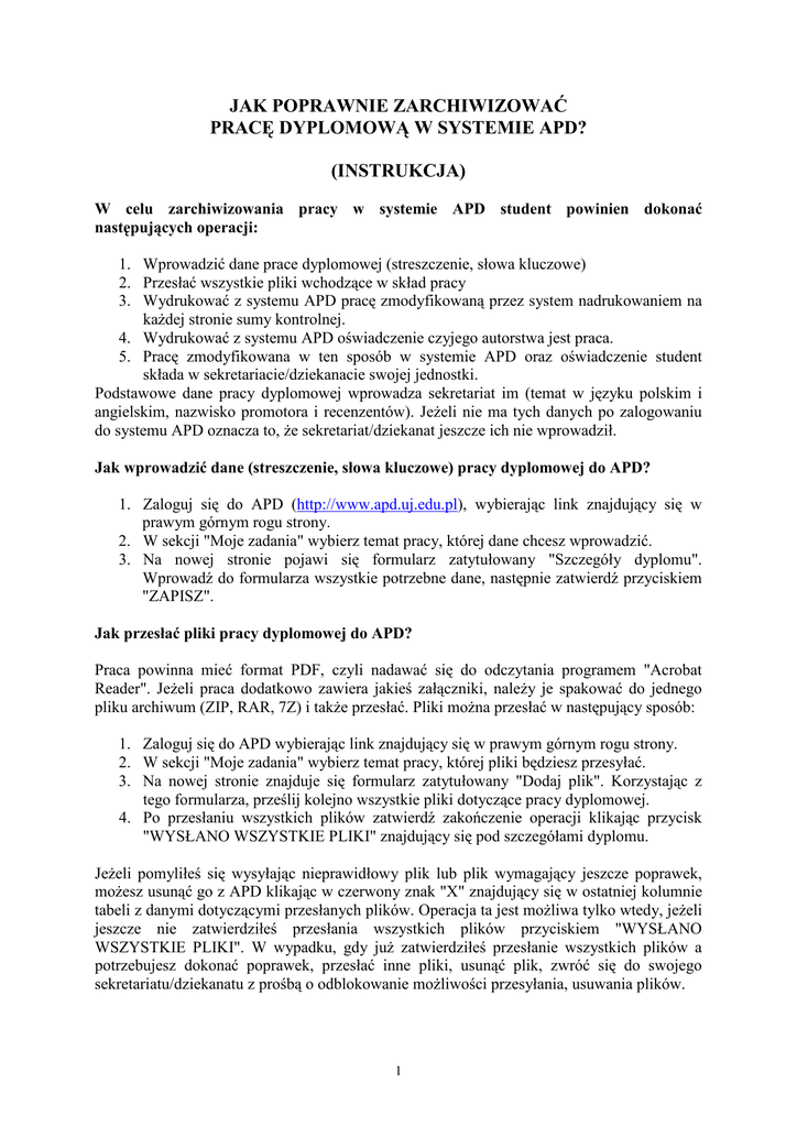 JAK POPRAWNIE ZARCHIWIZOWAĆ PRACĘ DYPLOMOWĄ W SYSTEMIE APD? (INSTRUKCJA) W celu zarchiwizowania pracy w systemie APD student powinien dokonać następujących operacji: 1. Wprowadzić dane prace dyplomowej (streszczenie, słowa kluczowe) 2. Przesłać wszystkie pliki wchodzące w skład pracy 3. Wydrukować z systemu APD pracę zmodyfikowaną przez system nadrukowaniem na każdej stronie sumy kontrolnej. 4. Wydrukować z systemu APD oświadczenie czyjego autorstwa jest praca. 5. Pracę zmodyfikowana w ten sposób w systemie APD oraz oświadczenie student składa w sekretariacie/dziekanacie swojej jednostki. Podstawowe dane pracy dyplomowej wprowadza sekretariat im (temat w języku polskim i angielskim, nazwisko promotora i recenzentów). Jeżeli nie ma tych danych po zalogowaniu do systemu APD oznacza to, że sekretariat/dziekanat jeszcze ich nie wprowadził. Jak wprowadzić dane (streszczenie, słowa kluczowe) pracy dyplomowej do APD? 1. Zaloguj się do APD (http://www.apd.uj.edu.pl), wybierając link znajdujący się w prawym górnym rogu strony. 2. W sekcji "Moje zadania" wybierz temat pracy, której dane chcesz wprowadzić. 3. Na nowej stronie pojawi się formularz zatytułowany "Szczegóły dyplomu". Wprowadź do formularza wszystkie potrzebne dane, następnie zatwierdź przyciskiem "ZAPISZ". Jak przesłać pliki pracy dyplomowej do APD? Praca powinna mieć format PDF, czyli nadawać się do odczytania programem "Acrobat Reader". Jeżeli praca dodatkowo zawiera jakieś załączniki, należy je spakować do jednego pliku archiwum (ZIP, RAR, 7Z) i także przesłać. Pliki można przesłać w następujący sposób: 1. Zaloguj się do APD wybierając link znajdujący się w prawym górnym rogu strony. 2. W sekcji "Moje zadania" wybierz temat pracy, której pliki będziesz przesyłać. 3. Na nowej stronie znajduje się formularz zatytułowany "Dodaj plik". Korzystając z tego formularza, prześlij kolejno wszystkie pliki dotyczące pracy dyplomowej. 4. Po przesłaniu wszystkich plików zatwierdź zakończenie operacji klikając przycisk "WYSŁANO WSZYSTKIE PLIKI" znajdujący się pod szczegółami dyplomu. Jeżeli pomyliłeś się wysyłając nieprawidłowy plik lub plik wymagający jeszcze poprawek, możesz usunąć go z APD klikając w czerwony znak "X" znajdujący się w ostatniej kolumnie tabeli z danymi dotyczącymi przesłanych plików. Operacja ta jest możliwa tylko wtedy, jeżeli jeszcze nie zatwierdziłeś przesłania wszystkich plików przyciskiem "WYSŁANO WSZYSTKIE PLIKI". W wypadku, gdy już zatwierdziłeś przesłanie wszystkich plików a potrzebujesz dokonać poprawek, przesłać inne pliki, usunąć plik, zwróć się do swojego sekretariatu/dziekanatu z prośbą o odblokowanie możliwości przesyłania, usuwania plików. 1 Jak wydrukować pracę dyplomową z APD? 1. Zaloguj się do APD wybierając link znajdujący się w prawym górnym rogu strony. 2. W sekcji "Moje zadania" wybierz temat pracy, którą chcesz wydrukować. 3. Na nowej stronie w tabeli "Załączone pliki" wybierz nazwę pliku, który chcesz wydrukować. Jak wydrukować z APD oświadczenie czyjego autorstwa jest praca? 1. Zaloguj się do APD wybierając link znajdujący się w prawym górnym rogu strony. 2. W sekcji "Moje zadania" wybierz temat pracy, dla której chcesz wydrukować oświadczenie. 3. Na nowej stronie pojawi się tabela zatytułowana "Szczegóły dyplomu". W tabeli obok imienia i nazwiska autora pracy znajduje się ikonka oświadczenia - po kliknięciu ikonki pojawi się oświadczenie. 2