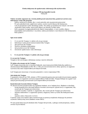 Ulotka dołączona do opakowania: informacja dla użytkownika Tasigna 150 mg kapsułki twarde Nilotynib Należy uważnie zapoznać się z treścią ulotki przed zażyciem leku, ponieważ zawiera ona informacje ważne dla pacjenta. Należy zachować tę ulotkę, aby w razie potrzeby móc ją ponownie przeczytać. W razie jakichkolwiek wątpliwości należy zwrócić się do lekarza lub farmaceuty. Lek ten przepisano ściśle określonej osobie. Nie należy go przekazywać innym. Lek może zaszkodzić innej osobie, nawet jeśli objawy jej choroby są takie same. Jeśli u pacjenta wystąpią jakiekolwiek objawy niepożądane, w tym wszelkie objawy niepożądane niewymienione w tej ulotce, należy powiedzieć o tym lekarzowi lub farmaceucie. Patrz punkt 4. Spis treści ulotki 1. 2. 3. 4. 5. 6. Co to jest lek Tasigna i w jakim celu się go stosuje Informacje ważne przed zastosowaniem leku Tasigna Jak stosować lek Tasigna Możliwe działania niepożądane Jak przechowywać lek Tasigna Zawartość opakowania i inne informacje 1. Co to jest lek Tasigna i w jakim celu się go stosuje Co to jest lek Tasigna Tasigna to lek zawierający substancję czynną o nazwie nilotynib. W jakim celu stosuje się lek Tasigna Lek Tasigna stosowany jest w leczeniu białaczki, nazywanej przewlekłą białaczką szpikową z chromosomem Philadelphia (CML Ph+). CML jest nowotworem krwi, który sprawia, że organizm wytwarza zbyt dużo nieprawidłowych białych krwinek. Lek Tasigna jest stosowany w leczeniu pacjentów z nowo rozpoznaną CML. Jak działa lek Tasigna U pacjentów chorych na CML zmiana w DNA (materiał genetyczny) prowadzi do powstania sygnału, który sprawia, że organizm wytwarza nieprawidłowe białe krwinki. Tasigna blokuje ten sygnał i tym samym powstrzymuje powstawanie tych nieprawidłowych komórek. Kontrolowanie leczenia lekiem Tasigna W okresie leczenia przeprowadza się regularnie badania, m.in. badania krwi. Badania te określają: liczbę komórek krwi (krwinek białych, krwinek czerwonych i płytek krwi) w organizmie, aby ocenić jak lek Tasigna jest tolerowany. czynność trzustki i wątroby w organizmie, aby ocenić jak lek Tasigna jest tolerowany. stężenie elektrolitów w organizmie (potasu, magnezu), które są ważne dla funkcjonowania serca. stężenie cukru i tłuszczów we krwi. Częstość rytmu serca będzie także monitorowana za pomocą urządzenia służącego do pomiaru czynności elektrycznej serca (badanie zwane EKG). W razie pytań dotyczących działania leku Tasigna lub powodu, z jakiego został przepisany, należy zwrócić się do lekarza. 1 2. Informacje ważne przed zastosowaniem leku Tasigna Należy ściśle przestrzegać zaleceń lekarza. Mogą one różnić się od ogólnych informacji zawartych w tej ulotce. Kiedy nie stosować leku Tasigna jeśli pacjent ma uczulenie na nilotynib lub którykolwiek z pozostałych składników tego leku (wymienionych w punkcie 6). Jesli pacjent podejrzewa, że może być uczulony, powinien powiedzieć o tym lekarzowi przed rozpoczęciem stosowania leku Tasigna. Ostrzeżenia i środki ostrożności Przed rozpoczęciem przyjmowania leku Tasigna należy omówić to z lekarzem lub farmaceutą: jeśli u pacjenta wcześniej występowały takie działania dotyczące układu sercowonaczyniowego, jak zawał serca, ból w klatce piersiowej (dławica), zaburzenia ukrwienia mózgu (udar) lub utrudniony dopływ krwi do nóg (chromanie) lub jeśli u pacjenta występują czynniki ryzyka choroby układu sercowo-naczyniowego, takie jak wysokie ciśnienie krwi (nadciśnienie), cukrzyca lub zaburzenia stężenia tłuszczów we krwi (zaburzenia lipidowe); jeśli u pacjenta występują zaburzenia serca, takie jak nieprawidłowa aktywność elektryczna nazywana „wydłużeniem odstępu QT”; jeśli pacjent stosuje leki, które wpływają na pracę serca (leki przeciwarytmiczne) lub wątroby (patrz Inne leki i Tasigna); jeśli u pacjenta występuje niedobór potasu lub magnezu; jeśli u pacjenta występują zaburzenia wątroby lub trzustki; jeśli u pacjenta występują objawy, takie jak łatwe powstawanie siniaków, uczucie zmęczenia lub duszność lub pojawiają się nawracające zakażenia; jeśli pacjent przeszedł operację polegającą na usunięciu całego żołądka (całkowite wycięcie żołądka). jeśli pacjent miał kiedykolwiek lub może teraz mieć zakażenie wirusem zapalenia wątroby typu B; wynika to stąd, że lek Tasigna może powodować ponowną aktywację wirusowego zapalenia wątroby typu B, co może w niektórych przypadkach być śmiertelne; pacjenci będą poddawani dokładnej kontroli przez lekarza pod kątem objawów tego zakażenia przed rozpoczęciem leczenia. Należy poinformować lekarza, jeżeli któryś z powyższych punktów dotyczy pacjenta. W czasie leczenia lekiem Tasigna jeśli w czasie stosowania leku Tasigna u pacjenta nastąpi utrata przytomności (omdlenie) lub nieregularna praca serca, należy natychmiast powiedzieć o tym lekarzowi, gdyż może być to objaw ciężkiej choroby serca. Wydłużenie odstępu QT lub nieregularna praca serca może prowadzić do nagłego zgonu. U pacjentów przyjmujących lek Tasigna niezbyt często notowano przypadki nagłego zgonu. jeśli u pacjenta wystąpią: nagłe kołatanie serca, ciężkie osłabienie lub porażenie mięśni, drgawki lub nagłe zmiany myślenia lub zdolności koncentracji, należy natychmiast powiedzieć o tym lekarzowi, ponieważ to mogą być objawy spowodowane szybkim rozpadem komórek rakowych, zwanym zespołem rozpadu guza; rzadko zgłaszano wystąpienie zespołu rozpadu guza u pacjentów leczonych lekiem Tasigna. jeśli u pacjenta wystąpi ból lub dyskomfort w klatce piersiowej, drętwienie lub osłabienie, problemy z chodzeniem lub mową, ból, przebarwienie lub uczucie zimna w kończynie, należy natychmiast powiedzieć o tym lekarzowi, ponieważ mogą to być objawy działań dotyczących układu sercowo-naczyniowego. U pacjentów przyjmuj