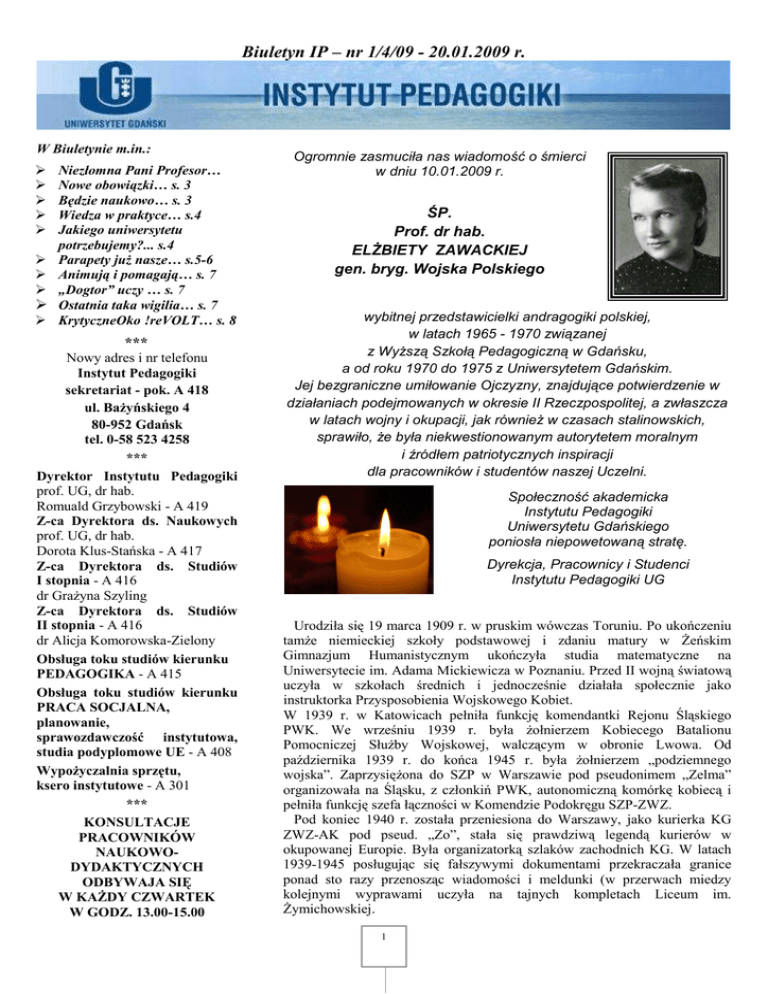Biuletyn IP – nr 1/4/09 - 20.01.2009 r. wykładowców str. *** *** W Biuletynie m.in.: Niezłomna Pani Profesor… Nowe obowiązki… s. 3 Będzie naukowo… s. 3 Wiedza w praktyce… s.4 Jakiego uniwersytetu potrzebujemy?... s.4 Parapety juŜ nasze… s.5-6 Animują i pomagają… s. 7 „Dogtor” uczy … s. 7 Ostatnia taka wigilia… s. 7 KrytyczneOko !reVOLT… s. 8 *** Nowy adres i nr telefonu Instytut Pedagogiki sekretariat - pok. A 418 ul. BaŜyńskiego 4 80-952 Gdańsk tel. 0-58 523 4258 *** Dyrektor Instytutu Pedagogiki prof. UG, dr hab. Romuald Grzybowski - A 419 Z-ca Dyrektora ds. Naukowych prof. UG, dr hab. Dorota Klus-Stańska - A 417 Z-ca Dyrektora ds. Studiów I stopnia - A 416 dr GraŜyna Szyling Z-ca Dyrektora ds. Studiów II stopnia - A 416 dr Alicja Komorowska-Zielony Obsługa toku studiów kierunku PEDAGOGIKA - A 415 Obsługa toku studiów kierunku PRACA SOCJALNA, planowanie, sprawozdawczość instytutowa, studia podyplomowe UE - A 408 WypoŜyczalnia sprzętu, ksero instytutowe - A 301 *** KONSULTACJE PRACOWNIKÓW NAUKOWODYDAKTYCZNYCH ODBYWAJA SIĘ W KAśDY CZWARTEK W GODZ. 13.00-15.00 Ogromnie zasmuciła nas wiadomość o śmierci w dniu 10.01.2009 r. ŚP. Prof. dr hab. ELśBIETY ZAWACKIEJ gen. bryg. Wojska Polskiego wybitnej przedstawicielki andragogiki polskiej, w latach 1965 - 1970 związanej z WyŜszą Szkołą Pedagogiczną w Gdańsku, a od roku 1970 do 1975 z Uniwersytetem Gdańskim. Jej bezgraniczne umiłowanie Ojczyzny, znajdujące potwierdzenie w działaniach podejmowanych w okresie II Rzeczpospolitej, a zwłaszcza w latach wojny i okupacji, jak równieŜ w czasach stalinowskich, sprawiło, Ŝe była niekwestionowanym autorytetem moralnym i źródłem patriotycznych inspiracji dla pracowników i studentów naszej Uczelni. Społeczność akademicka Instytutu Pedagogiki Uniwersytetu Gdańskiego poniosła niepowetowaną stratę. Dyrekcja, Pracownicy i Studenci Instytutu Pedagogiki UG Urodziła się 19 marca 1909 r. w pruskim wówczas Toruniu. Po ukończeniu tamŜe niemieckiej szkoły podstawowej i zdaniu matury w śeńskim Gimnazjum Humanistycznym ukończyła studia matematyczne na Uniwersytecie im. Adama Mickiewicza w Poznaniu. Przed II wojną światową uczyła w szkołach średnich i jednocześnie działała społecznie jako instruktorka Przysposobienia Wojskowego Kobiet. W 1939 r. w Katowicach pełniła funkcję komendantki Rejonu Śląskiego PWK. We wrześniu 1939 r. była Ŝołnierzem Kobiecego Batalionu Pomocniczej SłuŜby Wojskowej, walczącym w obronie Lwowa. Od października 1939 r. do końca 1945 r. była Ŝołnierzem „podziemnego wojska”. ZaprzysięŜona do SZP w Warszawie pod pseudonimem „Zelma” organizowała na Śląsku, z członkiń PWK, autonomiczną komórkę kobiecą i pełniła funkcję szefa łączności w Komendzie Podokręgu SZP-ZWZ. Pod koniec 1940 r. została przeniesiona do Warszawy, jako kurierka KG ZWZ-AK pod pseud. „Zo”, stała się prawdziwą legendą kurierów w okupowanej Europie. Była organizatorką szlaków zachodnich KG. W latach 1939-1945 posługując się fałszywymi dokumentami przekraczała granice ponad sto razy przenosząc wiadomości i meldunki (w przerwach miedzy kolejnymi wyprawami uczyła na tajnych kompletach Liceum im. śymichowskiej. 1 Biuletyn IP – nr 1/4/09 - 20.01.2009 r. Pokoje wykładowców Zakład Diagnostyki Kierownik Zakładu: prof. UG, dr hab. Krzysztof Jakubiak - A 507 dr Maria Groenwald - A 407 dr Michał Daszkiewicz - A 414 dr GraŜyna Szyling - A 414 Zakład Dydaktyki Kierownik Zakładu: prof. UG, dr hab. Teresa Bauman - A 406 dr Jan Frankowski - A 405 dr Alicja Jurgiel - A 405 dr Piotr Zamojski - A 405 dr Ewa Zalewska - A 404 dr Jolanta Dyrda - A 404 dr Adam Jagiełło-Rusiłowski - A 403 dr Anna Malenda - A 403 mgr Katarzyna Młyńska - A 403 dr Zdzisław Aleksander - A 402 dr Jolanta Kruk - A 402 prof. UG, dr hab. Kazimierz Kossak-Główczewski - A 401 Zakład Filozofii Wychowania i Studiów Kulturowych Kierownik Zakładu: prof. dr hab. Tomasz Szkudlarek - S 510 prof. UG, dr hab. Lucyna Kopciewicz - S 509 dr Małgorzata Cackowska - S 508 dr Piotr Stańczyk - S 508 Zakład Pedagogiki Specjalnej Kierownik Zakładu: prof. UG, dr hab. Amadeusz Krause - A 504 dr Joanna Belzyt-Sobczuk - A 505 mgr Alicja Sadownik - A 505 mgr Karolina Tersa - A 505 dr Danuta Grzybowska - A 506 dr Krystyna Rzedzicka - A 506 dr Jolanta Rzeźnicka - Krupa - A 515 dr Agnieszka Woynarowska - A 515 mgr Joanna Szymula - A 515 dr Dorota Krzemińska - A 516 dr Iwona Lindyberg - A 516 dr Katarzyna Kampert - A 516 prof. UG, dr hab. S. Sadowska - A 517 dr Anna Kobylańska - A 517 dr Katarzyna Materny - A 517 W lutym 1943 r. wyruszyła jako emisariuszka Komendanta Głównego AK przez Niemcy, Francję, Andorrę, Hiszpanię i Gibraltar do Sztabu Naczelnego Wodza w Londynie. Miała dwie misje: lepsze koordynowanie wędrówek poczt krajowych, przerzucanych przez bazy łączności Sztabu NW, funkcjonujące w krajach neutralnych oraz referowanie Ŝądań gen. Roweckiego, dotyczących uprawnień słuŜby Ŝołnierzy-kobiet AK. Z Londynu powróciła 10. września 1943 r. skokiem spadochronowym. ZagroŜona w marcu 1944 r. aresztowaniem przeszła, po kwarantannie, do słuŜby w Szefostwie Wojskowej SłuŜby Kobiet (WSK) KG AK. W ramach WSK uczestniczyła w Powstaniu. Po kapitulacji kierowała nadal, z Krakowa, szlakami zachodnimi prowadzącymi do bazy szwajcarskiej. Zdemobilizoawna, po powrocie przez front z Wiednia, w lutym 1945 r. była czynna przez rok w II konspiracji, w dziale łączności i kolportaŜu Okręgu Zachodniego. W 1948 r., po 2 latach pracy w odtworzonym Państwowym Urzędzie WFiPW przy Ministerstwie Obrony Narodowej, powróciła do pracy nauczycielskiej ucząc w Łodzi, Toruniu i Olsztynie. Aresztowana przez UB 5 września 1951 r., przebywała z 10-letnim wyrokiem w więzieniach do 24 lutego 1955 r. Powróciła, wciąŜ dyskryminowana, do pracy w szkole w Sierpcu i Toruniu. Po uzyskaniu doktoratu nauk humanist