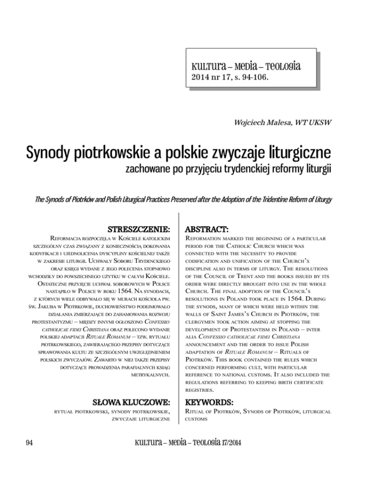 Kultura – Media – Teologia 2014 nr 17, s. 94-106. Wojciech Malesa, WT UKSW Synody piotrkowskie a polskie zwyczaje liturgiczne zachowane po przyjęciu trydenckiej reformy liturgii The Synods of Piotrków and Polish Liturgical Practices Preserved after the Adoption of the Tridentine Reform of Liturgy STRESZCZENIE: REFORMACJA ROZPOCZĘŁA W KOŚCIELE KATOLICKIM SZCZEGÓLNY CZAS ZWIĄZANY Z KONIECZNOŚCIĄ DOKONANIA KODYFIKACJI I UJEDNOLICENIA DYSCYPLINY KOŚCIELNEJ TAKŻE ABSTRACT: REFORMATION MARKED THE BEGINNING OF A PARTICULAR PERIOD FOR THE CATHOLIC CHURCH WHICH WAS CONNECTED WITH THE NECESSITY TO PROVIDE W ZAKRESIE LITURGII. UCHWAŁY SOBORU TRYDENCKIEGO CODIFICATION AND UNIFICATION OF THE ORAZ KSIĘGI WYDANE Z JEGO POLECENIA STOPNIOWO DISCIPLINE ALSO IN TERMS OF LITURGY. CHURCH’S THE RESOLUTIONS WCHODZIŁY DO POWSZECHNEGO UŻYTKU W CAŁYM KOŚCIELE. OF THE OSTATECZNE PRZYJĘCIE UCHWAŁ SOBOROWYCH W POLSCE NASTĄPIŁO W POLSCE W ROKU 1564. NA SYNODACH, Z KTÓRYCH WIELE ODBYWAŁO SIĘ W MURACH KOŚCIOŁA PW. ŚW. JAKUBA W PIOTRKOWIE, DUCHOWIEŃSTWO PODEJMOWAŁO ORDER WERE DIRECTLY BROUGHT INTO USE IN THE WHOLE DZIAŁANIA ZMIERZAJĄCE DO ZAHAMOWANIA ROZWOJU PROTESTANTYZMU – MIĘDZY INNYMI OGŁOSZONO CONFESSIO CATHOLICAE FIDEI CHRISTIANA ORAZ POLECONO WYDANIE POLSKIEJ ADAPTACJI RITUALE ROMANUM – TZW. RYTUAŁU PIOTRKOWSKIEGO, ZAWIERAJĄCEGO PRZEPISY DOTYCZĄCE SPRAWOWANIA KULTU ZE SZCZEGÓLNYM UWZGLĘDNIENIEM POLSKICH ZWYCZAJÓW. ZAWARTO W NIEJ TAKŻE PRZEPISY DOTYCZĄCE PROWADZENIA PARAFIALNYCH KSIĄG METRYKALNYCH. COUNCIL OF TRENT AND THE BOOKS ISSUED BY ITS CHURCH. THE FINAL ADOPTION OF THE COUNCIL’S RESOLUTIONS IN POLAND TOOK PLACE IN 1564. DURING THE SYNODS, MANY OF WHICH WERE HELD WITHIN THE WALLS OF SAINT JAMES’S CHURCH IN PIOTRKÓW, THE CLERGYMEN TOOK ACTION AIMING AT STOPPING THE PROTESTANTISM IN POLAND – INTER CONFESSIO CATHOLICAE FIDEI CHRISTIANA ANNOUNCEMENT AND THE ORDER TO ISSUE POLISH ADAPTATION OF RITUALE ROMANUM – RITUALS OF PIOTRKÓW. THIS BOOK CONTAINED THE RULES WHICH CONCERNED PERFORMING CULT, WITH PARTICULAR REFERENCE TO NATIONAL CUSTOMS. IT ALSO INCLUDED THE DEVELOPMENT OF ALIA REGULATIONS REFERRING TO KEEPING BIRTH CERTIFICATE REGISTRIES. SŁOWA KLUCZOWE: RYTUAŁ PIOTRKOWSKI, SYNODY PIOTRKOWSKIE, ZWYCZAJE LITURGICZNE 94 KEYWORDS: RITUAL OF PIOTRKÓW, SYNODS OF PIOTRKÓW, LITURGICAL CUSTOMS Kultura – Media – Teologia 17/2014 W. Malesa, Synody piotrkowskie a polskie zwyczaje liturgiczne... S ynody duchowieństwa diecezji polskich z XVI i XVII wieku odegrały znaczącą rolę w procesie kontrreformacji. W czasie ich trwania wprowadzono wiele przepisów normujących kwestie wiary czy dyscypliny kościelnej. Do najistotniejszych z punktu widzenia liturgii Kościoła katolickiego należy publikacja tak zwanego rytuału piotrkowskiego, który obowiązywał aż do Soboru Watykańskiego II. Księga ta, wzorowana na oficjalnym Rituale Romanum, zawierała także opis typowo polskich celebracji. Jej zawartość została już omówiona w dziełach z przełomu XIX i XX w. Brak jednak w literaturze porównania zapisów rytuału piotrkowskiego z posoborowymi zwyczajami liturgicznymi. Celem niniejszego tekstu jest przedstawienie krótkiego tła historycznego synodów piotrkowskich oraz ksiąg powstałych z ich inicjatywy, omówienie ich zawartości i porównanie jej z wydaniami rzymskimi oraz zarys diachronicznego zestawienia księgi potrydenckiej i współczesnej. Źródłami opracowania będą przede wszystkim najstarsze dostępne egzemplarze ksiąg liturgicznych czy zapisów synodalnych oraz dostępne ich opracowania. Wielorakie tradycje liturgiczne, związane ze specyfiką danego narodu, z czasem znaleźć mogą swoje usankcjonowanie w oficjalnych księgach czy innego rodzaju dokumentach kościelnych. Ich różnorodność jest wynikiem dążeń społeczności lokalnych do wyrażenia wiary w sposób najwłaściwszy dla danej kultury. Śledząc pierwotne zwyczaje religijne widać ich korelację z późniejszymi adaptacjami liturgicznymi obecnymi w liturgii Kościoła łacińskiego. Dla przykładu wskazać tu można polski zwyczaj przeniesienia Najświętszego Sakramentu do grobu, które odbywa się na zakończenie wielkopiątkowej celebracji1. Po Soborze Watykańskim II na sankcjonowanie wielu zwyczajów liturgicznych duży wpływ miały konferencje episkopatów, do których należało dokonanie pewnych adaptacji przy przygotowaniu przekładów narodowych ksiąg liturgicznych, ostatecznie podlegających zatwierdzeniu Stolicy Apostolskiej. W tradycji polskiej wiele zwyczajów związanych zarówno z celebracją sakramentów i sakramentaliów, jak i nabożeństw, pojawiło się w księgach liturgicznych już po Soborze Trydenckim. Wiek XVI w historii Kościoła był czasem bardzo burzliwym. Reformacja zapoczątkowana przez Marcina Lutra, za której początek przyjmuje się rok 1517, rozwój renesansu w sztuce, kolonizacja Ameryki i rozwój misji, walki o wpływy polityczne oraz działania określane w historii mianem kontrreformacji, zapoczątkowane przez Sobór Trydencki (1545-1563), zbiegły się niemal w czasie stawiając przed Kościołem ogrom zadań, po części stanowiących nowe nieznane dotąd wyzwania. Największy wpływ na kwestie liturgiczne istotne dla obranego tematu miały wydarzenia związane z reformacją i kontrreformacją. Teologia głoszona przez Marcina Lutra zawierała w sobie wiele błędów natury dogmatycznej. W konsekwencji wystąpienia reformatora doprowadziły do zakwestionowania nauki o czyśćcu, odpustach, transsubstancjacji, sakramentach i innych elementach doktryny katolickiej. Wobec głoszenia herezji oraz włączania ich do tworzonej przez Lutra liturgii, hierarchowie Kościoła katolickiego zmuszeni byli do podjęcia pewnych kroków gwarantujących czystość niezmiennej 1 Por. F. Małaczyński, Bizantyjskie i łacińskie wpływy na liturgię Bożego Grobu, „Ruch Biblijny i Liturgiczny” nr 2-6 (1992), s. 91-92. Kultura – 