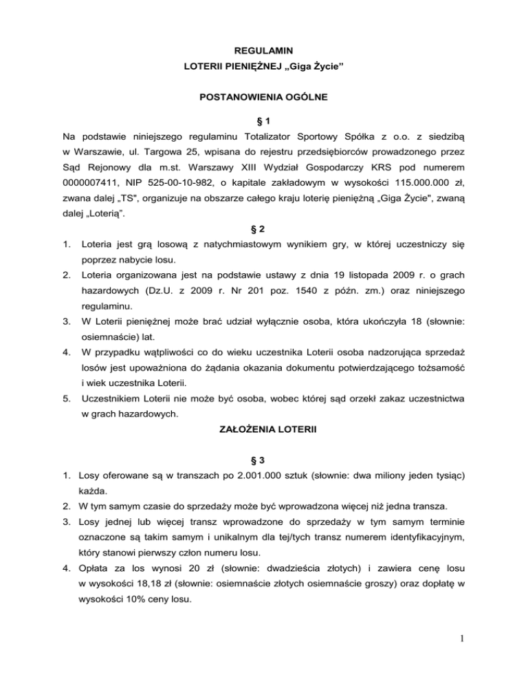 REGULAMIN LOTERII PIENIĘŻNEJ „Giga Życie” POSTANOWIENIA OGÓLNE §1 Na podstawie niniejszego regulaminu Totalizator Sportowy Spółka z o.o. z siedzibą w Warszawie, ul. Targowa 25, wpisana do rejestru przedsiębiorców prowadzonego przez Sąd Rejonowy dla m.st. Warszawy XIII Wydział Gospodarczy KRS pod numerem 0000007411, NIP 525-00-10-982, o kapitale zakładowym w wysokości 115.000.000 zł, zwana dalej „TS", organizuje na obszarze całego kraju loterię pieniężną „Giga Życie", zwaną dalej „Loterią”. §2 1. Loteria jest grą losową z natychmiastowym wynikiem gry, w której uczestniczy się poprzez nabycie losu. 2. Loteria organizowana jest na podstawie ustawy z dnia 19 listopada 2009 r. o grach hazardowych (Dz.U. z 2009 r. Nr 201 poz. 1540 z późn. zm.) oraz niniejszego regulaminu. 3. W Loterii pieniężnej może brać udział wyłącznie osoba, która ukończyła 18 (słownie: osiemnaście) lat. 4. W przypadku wątpliwości co do wieku uczestnika Loterii osoba nadzorująca sprzedaż losów jest upoważniona do żądania okazania dokumentu potwierdzającego tożsamość i wiek uczestnika Loterii. 5. Uczestnikiem Loterii nie może być osoba, wobec której sąd orzekł zakaz uczestnictwa w grach hazardowych. ZAŁOŻENIA LOTERII §3 1. Losy oferowane są w transzach po 2.001.000 sztuk (słownie: dwa miliony jeden tysiąc) każda. 2. W tym samym czasie do sprzedaży może być wprowadzona więcej niż jedna transza. 3. Losy jednej lub więcej transz wprowadzone do sprzedaży w tym samym terminie oznaczone są takim samym i unikalnym dla tej/tych transz numerem identyfikacyjnym, który stanowi pierwszy człon numeru losu. 4. Opłata za los wynosi 20 zł (słownie: dwadzieścia złotych) i zawiera cenę losu w wysokości 18,18 zł (słownie: osiemnaście złotych osiemnaście groszy) oraz dopłatę w wysokości 10% ceny losu. 1 5. Łączna cena losów przeznaczonych do sprzedaży dla każdej transzy stanowi kwotę 36.378.180 zł (słownie: trzydzieści sześć milionów trzysta siedemdziesiąt osiem tysięcy sto osiemdziesiąt złotych). §4 1. Wysokość kapitału przeznaczonego na wygrane pieniężne wynosi dla każdej transzy 24.825.600 zł (słownie: dwadzieścia cztery miliony osiemset dwadzieścia pięć tysięcy sześćset złotych), co stanowi 68,24% łącznej ceny losów przeznaczonych do sprzedaży. 2. Ilość i wysokość wygranych dla każdej transzy Loterii: Stopień wygranych Ilość wygranych Wartość wygranych Łączna wartość w złotych wygranych w złotych I* 1 1 000 000 = 160 000 + 84 x 10 000 1 000 000 II** 3 48 000 = 12 x 4 000 144 000 III 12 10 000 120 000 IV 100 1 000 100 000 V 500 500 250 000 VI 20 010 120 2 401 200 VII 86 710 80 6 936 800 VIII 200 100 40 8 004 000 IX 293 480 20 5 869 600 * na wygraną pieniężną I stopnia o łącznej wysokości 1.000.000 złotych składa się pierwsza wypłata w wysokości 160.000 złotych i 84 wypłaty po 10.000 złotych wypłacane w kolejnych miesiącach, szczegóły dotyczące płatności niniejszej wygranej opisano w § 14 ust. 4. ** na wygraną pieniężną II stopnia o łącznej wysokości 48.000 złotych składa się 12 wypłat po 4.000 złotych wypłacanych w kolejnych miesiącach, szczegóły dotyczące płatności niniejszej wygranej opisano w § 14 ust. 5. Razem wygranych: 600.916 sztuk dla każdej transzy. ZNAMIONA LOSÓW §5 Losy Loterii wykonane są w formie prostokąta o wymiarach 10,16 cm x 25,40 cm. 2 §6 Na pierwszej stronie losu wydrukowano: 1) nazwę Loterii, 2) oznaczenie opłaty za los, 3) logo Loterii pieniężnych TS, 4) instrukcje dla uczestników Loterii, 5) pole gry pokryte w całości ścieralną warstwą ochronną, 6) numer identyfikacyjny losu. §7 Na drugiej stronie losu wydrukowano: 1) tabelę wygranych, 2) informacje dla uczestników loterii, 3) kody kreskowe służące do identyfikacji losu, 4) numer identyfikacyjny losu, 5) logo TS. WARUNKI SPRZEDAŻY LOSÓW §8 1. Termin rozpoczęcia sprzedaży losów oraz ilość transz Loterii, oznaczonych takim samym i unikalnym dla tej/tych transz numerem identyfikacyjnym, który stanowi pierwszy człon numeru losu, każdorazowo określa TS i podaje do publicznej wiadomości grających z co najmniej 3 (słownie: trzy) – dniowym wyprzedzeniem. 2. Termin zakończenia sprzedaży losów Loterii, oznaczonych takim samym i unikalnym dla tej/tych transz numerem identyfikacyjnym, który stanowi pierwszy człon numeru losu, każdorazowo określa TS i podaje do publicznej wiadomości grających z co najmniej 7 (słownie: siedmio) – dniowym wyprzedzeniem. §9 TS prowadzi sprzedaż losów Loterii za pośrednictwem kolektur oraz innych sieci dystrybucji. § 10 1. Przy zakupie losu uczestnik Loterii obowiązany jest sprawdzić, czy los spełnia wymogi określone w § 5 - 7 niniejszego regulaminu. 2. W przypadku stwierdzenia przez uczestnika Loterii, że los nie spełnia wymogów określonych w § 5 - 7 niniejszego regulaminu, nabywcy przysługuje zwrot ceny losu wraz 3 z dopłatą w zamian za zwrócony los, w miejscu i momencie jego nabycia, pod warunkiem, że zwracany los nie nosi cech dokonanych zdrapań. § 11 Nabycie losu jest równoznaczne z przyjęciem warunków uczestnictwa w Loterii określonych niniejszym regulaminem. ZASADY LOTERII § 12 1. Los bierze udział w grze o wygrane pieniężne. 2. W celu uzyskania wyniku gry, nabywca losu usuwa warstwę ścieralną z pola gry. Na części oznaczonej „Wygrywające liczby” odczytuje pięć liczb. Na części oznaczonej „Twoje liczby” odczytuje dwadzieścia pięć liczb z przypisanymi do nich kwotami ewentualnej wygranej w złotych (opisanymi dodatkowo słownie pod każdą z liczb). Jeżeli jakakolwiek z dwudziestu pięciu liczb z części oznaczonej „Twoje liczby” ma swój odpowiednik na części oznaczonej „Wygrywające liczby” (jest taka sama), oznacza to uzyskanie wygranej pieniężnej w wysokości przypisanej do tej liczby. W przypadku wielokrotnego spełnienia powyższ