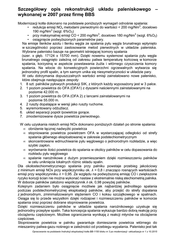 Szczegółowy opis rekonstrukcji układu paleniskowego – wykonanej w 2007 przez firmę BBS Modernizacji kotła dokonano na podstawie poniższych wymagań odnośnie spalania: • redukcja emisji NOx metodami pierwotnymi do wartości < 200 mg/Nm3, docelowo 190 mg/Nm3 (wzgl. 6%O2) • przy maksymalnej emisji CO < 200 mg/Nm3, docelowo 180 mg/Nm3 (wzgl. 6%O2) • osiągnięcie podwyższonych parametrów pary. Na emisje tlenków azotu i tlenku węgla ze spalania pyłu węgla brunatnego wpłynięto w szczególności poprzez zastosowanie metod pierwotnych w układzie paleniska. Wybrane palenisko bazuje na geometrii istniejącej komory spalania (szer. x głęb. 17124 x 15700 mm). Dzięki nowemu systemowi spalania pyłu węgla brunatnego osiągnięto zależną od zakresu paliwa temperaturę końcową w komorze spalania, korzystną w aspekcie powstawania żużla i wtórnego czyszczenia komory spalania. Na wlocie do konwekcyjnych powierzchni ogrzewalnych wytwarza się jednorodny profil spalin, a tym samym unika się niesymetryczności w układzie pary. W celu dotrzymania dopuszczalnych wartości emisji zainstalowano nowe palenisko, które obejmuje następujące zespoły: 1. 8 szt. palników pyłowych produkcji SIK, z których każdy wyposażony jest w 3 palce. 2. 1 poziom powietrza do OFA (OFA1) z dyszami naściennymi zainstalowanymi na poziomie 42.000 m. 3. 1 poziom powietrza do OFA (OFA 2) z lancami zainstalowanymi na poziomie 55.000 m. 4. 2 ruszty dopalające w wersji jako ruszty ruchome. 5. wyremontowany odżużlacz. 6. układ separacji popiół /powietrze gorące. 7. zmodernizowane dysze powietrza pierwotnego. W celu uzyskania niskich emisji NOx dokonano poniższych działań po stronie spalania: • obniżenie łącznej nadwyżki powietrza • stopniowanie powietrza powietrzem OFA w wystarczającej odległości od strefy spalania głównego eksploatowanej w zakresie podstechiometrycznym • skoncentrowane wdmuchiwanie pyłu węglowego o jednorodnym rozkładzie, a więc szybki zapłon. • wyrównanie ilości powietrza do spalania w okolicy palników w celu dopasowania do rozkładu pyłu węglowego • spalanie narożnikowe z dużym przemieszaniem dzięki rozmieszczeniu palników w celu uniknięcia lokalnych różnic składu spalin. Dla okołostechiometrycznego spalania przy palniku powstaje przebieg jakościowy z minimum emisji NOx przy współczynniku ok. λ = 0,8 i znacząco rosnących wartościach emisji przy współczynniku λ > 0,95. Ze względu na podwyższoną emisję CO i zwiększone ryzyko korozji ścian nie można wykonać nastaw z ekstremalnie niską stechiometrią palnika. W doborze palników założono współczynnik λ ok. 0,98 powyżej palników. Kolejnym zadaniem było osiągnięcie możliwie jak najbardziej jednolitego spalania podczas podstechiometrycznej eksploatacji palników, aby przejść do strefy dopalania z jednorodnym, zminimalizowanym stężeniem CO i koksu szczątkowego w spalinach. Osiąga się to przede wszystkim dzięki rodzajowi i rozmieszczeniu palników w komorze spalania oraz poprzez dobrane stopniowanie powietrza. Dzięki rozmieszczeniu palników w układzie spalania narożnikowego uzyskuje się jednorodny przepływ spalin. Taka koncepcja spalania wykazuje bardzo dobrą reakcję przy obciążeniu częściowym. Możliwe ograniczenia wynikają z reakcji młynów na obciążenie częściowe. Stopniowanie powietrza w palniku gwarantuje domieszanie powietrza wtórnego do mieszaniny paliwa-gazu nośnego w zależności od przebiegu wypalania. Palenisko jest tak Opracowanie na podstawie Instrukcji eksploatacji kotła BB-1150 bloku nr 3 po modernizacji –aktualizacja nr 1 z 10.2015 zaprojektowane, aby na całej wysokości palnika zapewniona była praca podstechiometryczna z różnymi współczynnikami nadmiaru powietrza palca pyłowego. Aby zapobiec zbyt silnemu wytwarzaniu CO w strefie palnika, przewidziano zasilanie powietrzem rozmieszczone równomiernie na całej szerokości palnika w postaci powietrza górnego, dwóch strumieni powietrza środkowego oraz powietrza dolnego. Wybrana koncepcja palników opiera się więc na pracy z równoległymi strumieniami mieszanki pyłu węglowego i powietrza z opóźnionym zmieszaniem powietrza i pyłu węglowego wskutek przestrzennego rozdzielenia dysz powietrza i pyłu węglowego. Rejony zmieszania powietrza i pyłu węglowego zostały zoptymalizowane pod kątem wyeliminowania rejonów lokalnego wysokiego nadmiaru powietrza. Zapłon płomienia z pyłu węglowego następuje w strefie lokalnej nadstechiometrii przy płaszczyznach przecięcia powietrza i pyłu węglowego i rozchodzi się w kierunku przepływu. Dla opóźnionego domieszania miarodajna jest odległość między dyszą powietrzną i pyłową. Po całkowitym zmieszaniu powietrza wtórnego / gazu nośnego i pozostałych rodzajów powietrza (powietrze rusztowe, powietrze chłodzące, powietrze szkodliwe, powietrze pierwotne), przy górnej krawędzi palnika uzyskuje się stosunek nadmiaru powietrza ok. 0,98. Dzięki dobranym współczynnikom powietrza przy palniku obniża się temperaturę spalania w głównej strefie spalania, a tym samym wyklucza powstawanie termicznego NOx. Jednocześnie dzięki podstechiometrycznej eksploatacji palnika zapobiega się korozji ścian. Układ pozytywnie wpływa na poziom emisji NOx. Pierwotny udział powietrza doprowadzanego do palnika jest podawany przez młyn w postaci powietrza pierwotnego. Razem z usysem spalin z rurosuszarki oraz pyłem węglowym ten udział powietrza tworzy mieszankę gazu transportującego/ węgla i jest podawany do trzech palców pyłowych palnika. Większa część powietrza do palników doprowadzana jest do dysz palnikowych w postaci powietrza wtórnego. Na powietrze to składają się: 3 powietrza rdzeniowe (KEL) w palcach palnikowych, powietrze górne powyżej najwyższego palca palnikowego, powietrze środkowe 1 (ML1) oraz powietrze środkowe 2 (ML2) między palcami palnikowymi i powietrze dolne (UL) 