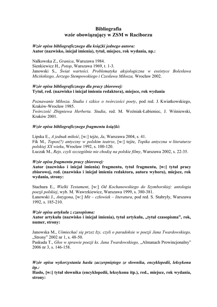 Bibliografia wzór obowiązujący w ZSM w Raciborzu
