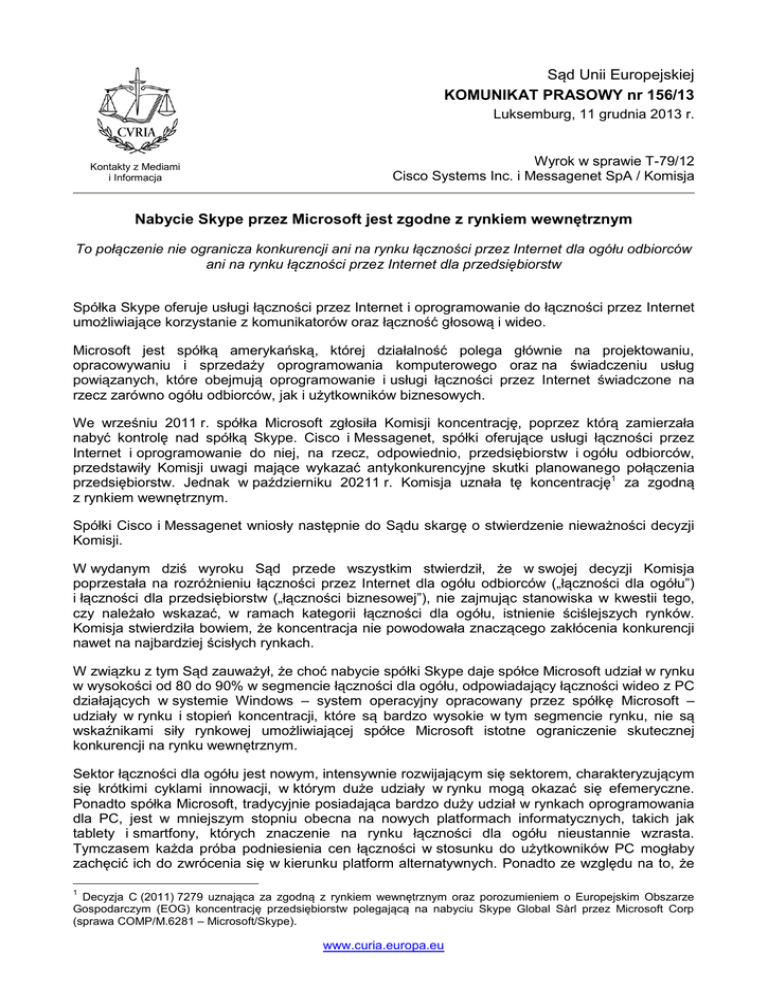 Sąd Unii Europejskiej KOMUNIKAT PRASOWY nr 156/13 Luksemburg, 11 grudnia 2013 r. Kontakty z Mediami i Informacja Wyrok w sprawie T-79/12 Cisco Systems Inc. i Messagenet SpA / Komisja Nabycie Skype przez Microsoft jest zgodne z rynkiem wewnętrznym To połączenie nie ogranicza konkurencji ani na rynku łączności przez Internet dla ogółu odbiorców ani na rynku łączności przez Internet dla przedsiębiorstw Spółka Skype oferuje usługi łączności przez Internet i oprogramowanie do łączności przez Internet umożliwiające korzystanie z komunikatorów oraz łączność głosową i wideo. Microsoft jest spółką amerykańską, której działalność polega głównie na projektowaniu, opracowywaniu i sprzedaży oprogramowania komputerowego oraz na świadczeniu usług powiązanych, które obejmują oprogramowanie i usługi łączności przez Internet świadczone na rzecz zarówno ogółu odbiorców, jak i użytkowników biznesowych. We wrześniu 2011 r. spółka Microsoft zgłosiła Komisji koncentrację, poprzez którą zamierzała nabyć kontrolę nad spółką Skype. Cisco i Messagenet, spółki oferujące usługi łączności przez Internet i oprogramowanie do niej, na rzecz, odpowiednio, przedsiębiorstw i ogółu odbiorców, przedstawiły Komisji uwagi mające wykazać antykonkurencyjne skutki planowanego połączenia przedsiębiorstw. Jednak w październiku 20211 r. Komisja uznała tę koncentrację1 za zgodną z rynkiem wewnętrznym. Spółki Cisco i Messagenet wniosły następnie do Sądu skargę o stwierdzenie nieważności decyzji Komisji. W wydanym dziś wyroku Sąd przede wszystkim stwierdził, że w swojej decyzji Komisja poprzestała na rozróżnieniu łączności przez Internet dla ogółu odbiorców („łączności dla ogółu”) i łączności dla przedsiębiorstw („łączności biznesowej”), nie zajmując stanowiska w kwestii tego, czy należało wskazać, w ramach kategorii łączności dla ogółu, istnienie ściślejszych rynków. Komisja stwierdziła bowiem, że koncentracja nie powodowała znaczącego zakłócenia konkurencji nawet na najbardziej ścisłych rynkach. W związku z tym Sąd zauważył, że choć nabycie spółki Skype daje spółce Microsoft udział w rynku w wysokości od 80 do 90% w segmencie łączności dla ogółu, odpowiadający łączności wideo z PC działających w systemie Windows – system operacyjny opracowany przez spółkę Microsoft – udziały w rynku i stopień koncentracji, które są bardzo wysokie w tym segmencie rynku, nie są wskaźnikami siły rynkowej umożliwiającej spółce Microsoft istotne ograniczenie skutecznej konkurencji na rynku wewnętrznym. Sektor łączności dla ogółu jest nowym, intensywnie rozwijającym się sektorem, charakteryzującym się krótkimi cyklami innowacji, w którym duże udziały w rynku mogą okazać się efemeryczne. Ponadto spółka Microsoft, tradycyjnie posiadająca bardzo duży udział w rynkach oprogramowania dla PC, jest w mniejszym stopniu obecna na nowych platformach informatycznych, takich jak tablety i smartfony, których znaczenie na rynku łączności dla ogółu nieustannie wzrasta. Tymczasem każda próba podniesienia cen łączności w stosunku do użytkowników PC mogłaby zachęcić ich do zwrócenia się w kierunku platform alternatywnych. Ponadto ze względu na to, że 1 Decyzja C (2011) 7279 uznająca za zgodną z rynkiem wewnętrznym oraz porozumieniem o Europejskim Obszarze Gospodarczym (EOG) koncentrację przedsiębiorstw polegającą na nabyciu Skype Global Sàrl przez Microsoft Corp (sprawa COMP/M.6281 – Microsoft/Skype). www.curia.europa.eu usługi na tym rynku zazwyczaj były darmowe, polityka handlowa zmierzająca do wymagania zapłaty od użytkowników groziłaby zwróceniem się przez użytkowników do innych dostawców, którzy nadal oferowaliby swoje usługi bezpłatnie. Sąd stwierdził również, że na platformach innych niż PC działające w systemie Windows podmioty konkurujące ze spółką Microsoft mają udziały w rynku wystarczająco duże, aby mogły tworzyć sieci łączności, których poziom użytkowania i atrakcyjności dla użytkownika są co najmniej porównywalne z razem wziętymi spółkami Skype i Microsoft. W tych okolicznościach, zważywszy, że spółki Cisco i Messagenet nie zdołały wykazać, iż koncentracja może wyrządzić szkodę konkurencji na rynku łączności dla ogółu, Sąd stwierdził, że jeżeli chodzi o ten rynek, badane połączenie przedsiębiorstw jest zgodne z przepisami Unii dotyczącymi konkurencji. Następnie Sąd oddalił argument spółek Cisco i Messagenet, w myśl którego dzięki tej koncentracji spółka Microsoft mogła zapewnić swojemu produktowi na rynku łączności biznesowej, programowi Lync, preferencyjną interoperacyjność z programem Skype i z jego szeroką bazą użytkowników, ze szkodą dla swoich konkurentów. W tym względzie Sąd przypomniał, po pierwsze, że koncentracja może zostać uznana za niezgodną z rynkiem wewnętrznym wyłącznie, jeżeli przynosi konkurencji bezpośrednią i natychmiastową szkodę. Tymczasem realizacja interoperacyjności programu Lync z programem Skype i sukces sprzedaży nowego produktu powstałego w jej wyniku – który mógłby, teoretycznie, umożliwić spółce Microsoft ograniczenie konkurencji – zależą jeszcze od szeregu czynników, co do których nie ma pewności, że wszystkie będą mogły wystąpić w wystarczająco niedalekiej przyszłości. Po drugie, Sąd stwierdził, że dokładne korzyści i rzeczywiste zapotrzebowanie na taki produkt pozostają niejasne. W tym względzie Sąd zauważył, że przedsiębiorstwa, które byłyby ewentualnie zainteresowane zintegrowanym narzędziem do komunikacji, chcą przede wszystkim kontaktować się z konsumentami swoich produktów i swoich usług, nie zaś z użytkownikami programu Skype, niekoniecznie będącymi ich obecnymi lub potencjalnymi klientami. Co więcej, program Skype 