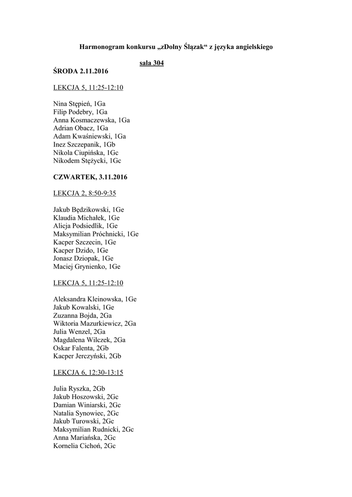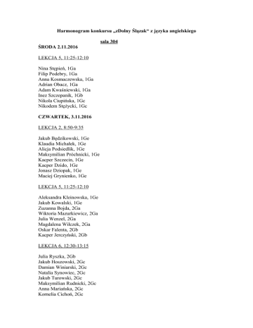 Harmonogram konkursu „zDolny Ślązak“ z języka angielskiego sala 304 ŚRODA 2.11.2016 LEKCJA 5, 11:25-12:10 Nina Stępień, 1Ga Filip Podebry, 1Ga Anna Kosmaczewska, 1Ga Adrian Obacz, 1Ga Adam Kwaśniewski, 1Ga Inez Szczepanik, 1Gb Nikola Ciupińska, 1Gc Nikodem Stężycki, 1Gc CZWARTEK, 3.11.2016 LEKCJA 2, 8:50-9:35 Jakub Będzikowski, 1Ge Klaudia Michałek, 1Ge Alicja Podsiedlik, 1Ge Maksymilian Próchnicki, 1Ge Kacper Szczecin, 1Ge Kacper Dzido, 1Ge Jonasz Dziopak, 1Ge Maciej Grynienko, 1Ge LEKCJA 5, 11:25-12:10 Aleksandra Kleinowska, 1Ge Jakub Kowalski, 1Ge Zuzanna Bojda, 2Ga Wiktoria Mazurkiewicz, 2Ga Julia Wenzel, 2Ga Magdalena Wilczek, 2Ga Oskar Falenta, 2Gb Kacper Jerczyński, 2Gb LEKCJA 6, 12:30-13:15 Julia Ryszka, 2Gb Jakub Hoszowski, 2Gc Damian Winiarski, 2Gc Natalia Synowiec, 2Gc Jakub Turowski, 2Gc Maksymilian Rudnicki, 2Gc Anna Mariańska, 2Gc Kornelia Cichoń, 2Gc