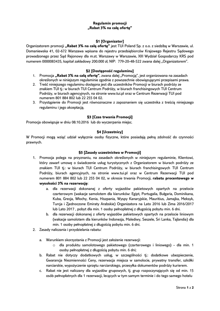 Regulamin promocji „Rabat 3% na całą ofertę” §1 [Organizator] Organizatorem promocji „Rabat 3% na całą ofertę” jest TUI Poland Sp. z o.o. z siedzibą w Warszawie, ul. Domaniewska 41, 02-672 Warszawa wpisana do rejestru przedsiębiorców Krajowego Rejestru Sądowego prowadzonego przez Sąd Rejonowy dla m.st. Warszawy w Warszawie, XIII Wydział Gospodarczy KRS pod numerem 0000083435, kapitał zakładowy 200.000 zł, NIP: 779-20-48-522 zwana dalej „Organizatorem”. §2 [Dostępność regulaminu] Promocja „Rabat 3% na całą ofertę”, zwana dalej „Promocją”, jest organizowana na zasadach określonych w niniejszym regulaminie zgodnie z powszechnie obowiązującymi przepisami prawa. 2. Treść niniejszego regulaminu dostępna jest dla uczestników Promocji w biurach podróży ze znakiem TUI tj.: w biurach TUI Centrum Podróży, w biurach franchisingowych TUI Centrum Podróży, w biurach agencyjnych, na stronie www.tui.pl oraz w Centrum Rezerwacji TUI pod numerem 801 884 802 lub 22 255 04 02. 3. Przystąpienie do Promocji jest równoznaczne z zapoznaniem się uczestnika z treścią niniejszego regulaminu i jego akceptacją. 1. §3 [Czas trwania Promocji] Promocja obowiązuje w dniu 08.10.2016 lub do wyczerpania miejsc. §4 [Uczestnicy] W Promocji mogą wziąć udział wyłącznie osoby fizyczne, które posiadają pełną zdolność do czynności prawnych. §5 [Zasady uczestnictwa w Promocji] 1. Promocja polega na przyznaniu, na zasadach określonych w niniejszym regulaminie, Klientowi, który zawarł umowę o świadczenie usług turystycznych z Organizatorem w biurach podróży ze znakiem TUI tj.: w biurach TUI Centrum Podróży, w biurach franchisingowych TUI Centrum Podróży, biurach agencyjnych, na stronie www.tui.pl oraz w Centrum Rezerwacji TUI pod numerem 801 884 802 lub 22 255 04 02, w okresie trwania Promocji, rabatu procentowego w wysokości 3% na rezerwację: a. dla rezerwacji dokonanej z oferty wyjazdów pakietowych opartych na przelocie czarterowym (wakacje samolotem dla kierunków: Egipt, Portugalia, Bułgaria, Dominikana, Kuba, Grecja, Włochy, Kenia, Hiszpania, Wyspy Kanaryjskie, Mauritius, Jamajka, Meksyk, Turcja i Zjednoczone Emiraty Arabskie) Organizatora na Lato 2016 lub Zima 2016/2017 lub Lato 2017 , pobyt dla min. 1 osoby pełnopłatnej z długością pobytu min. 6 dni. b. dla rezerwacji dokonanej z oferty wyjazdów pakietowych opartych na przelocie liniowym (wakacje samolotem dla kierunków Indonezja, Malediwy, Seszele, Sri Lanka, Tajlandia) dla min. 1 osoby pełnopłatnej z długością pobytu min. 6 dni. 2. Zasady naliczania i przydzielania rabatu: a. Warunkiem skorzystania z Promocji jest założenie rezerwacji: o dla produktu samolotowego pakietowego (czarterowego i liniowego) - dla min. 1 osoby pełnopłatnej z długością pobytu min. 6 dni; b. Rabat nie dotyczy dodatkowych usług, w szczególności tj.: dodatkowe ubezpieczenie, Gwarancja Niezmienności Ceny, rezerwacja miejsca w samolocie, prywatny transfer, szkółki narciarskie, wypożyczenie sprzętu narciarskiego, przesyłka dokumentów podróży kurierem. c. Rabat nie jest naliczany dla wyjazdów grupowych, tj. grup rozpoczynających się od min. 15 osób pełnopłatnych dla 1 rezerwacji, lecących w tym samym terminie i do tego samego hotelu Strona 1 z 2 d. Rabat będzie udzielony wyłącznie w postaci określonej w niniejszym regulaminie, bez możliwości wypłaty równowartości w gotówce lub zamiany na inny rabat. e. Rabat nie będzie naliczany dla ofert z dojazdem własnym. 3. Promocja łączy się z promocją „Najtaniej w First Minute® Zima 2016/2017” – XXI etap”, „Najtaniej w First Minute® Lato 2017 – IV etap” 4. Promocja nie łączy się z promocją „3% na ofertę wakacje samochodem lato 2016”, 5. Uczestnictwo w Promocji jest dobrowolne. §6 [Skutki zmiany rezerwacji] 1. W przypadku rezygnacji z imprezy turystycznej przez uczestnika Promocji, zastosowanie mają postanowienia umowy o świadczenie usług turystycznych oraz Warunki Imprez Turystycznych Organizatora. 2. W przypadku rozwiązania umowy o świadczenie usług turystycznych z przyczyn leżących po stronie Organizatora uczestnicy nabywają prawo do zachowania korzyści wynikających z Promocji, ale zgodnych z postanowieniami niniejszego regulaminu. Rabat jest naliczany od cen podstawowych dostępnych dla klienta na www.tui.pl przy alternatywnej propozycji zaproponowanej przez Organizatora. 3. W przypadku zmian rezerwacji dokonywanych przez uczestnika Promocji zastosowanie mają postanowienia umowy o świadczenie usług turystycznych oraz Warunki Imprez Turystycznych Organizatora. Przyznane uczestnikowi korzyści z Promocji przepadają, a uczestnik może skorzystać z aktualnej oferty dostępnej w momencie zmiany rezerwacji. §7 [Reklamacje] 1. Wszystkie roszczenia, reklamacje, uwagi i zastrzeżenia do przebiegu Promocji można składać wyłącznie pisemnie na adres Organizatora: ul. Domaniewska 41, 02-672 Warszawa przez cały czas trwania Promocji, nie później jednak niż w terminie 14 dni od dnia zakończenia Promocji (o rozpatrzeniu reklamacji decyduje data stempla pocztowego). 2. Reklamacja powinna zawierać: imię, nazwisko, adres, nazwę Promocji, jak również dokładny opis i powód reklamacji. 3. Reklamacje złożone po upływie terminu, o którym mowa w ust. 1 powyżej nie będą rozpatrywane. 4. Reklamacje Organizator rozpatruje w terminie 14 dni od dnia ich otrzymania. Reklamacje będą rozpatrywane w oparciu o postanowienia niniejszego regulaminu. Uczestnik zostanie poinformowany o decyzji Organizatora na adres wskazany w reklamacji. §8 [Postanowienia końcowe] 1. Administratorem danych osobowych jest Organizator. 2. Organizator informuje uczestników, że ich dane osobowe będą przetwarzane wyłącznie w związku z wykonaniem postanowień niniejszego regulaminu, w celu przeprowadzenia Promocji. 3. Uczestnicy mają prawo dostępu do treści swoich danych osobowych oraz do ich popr