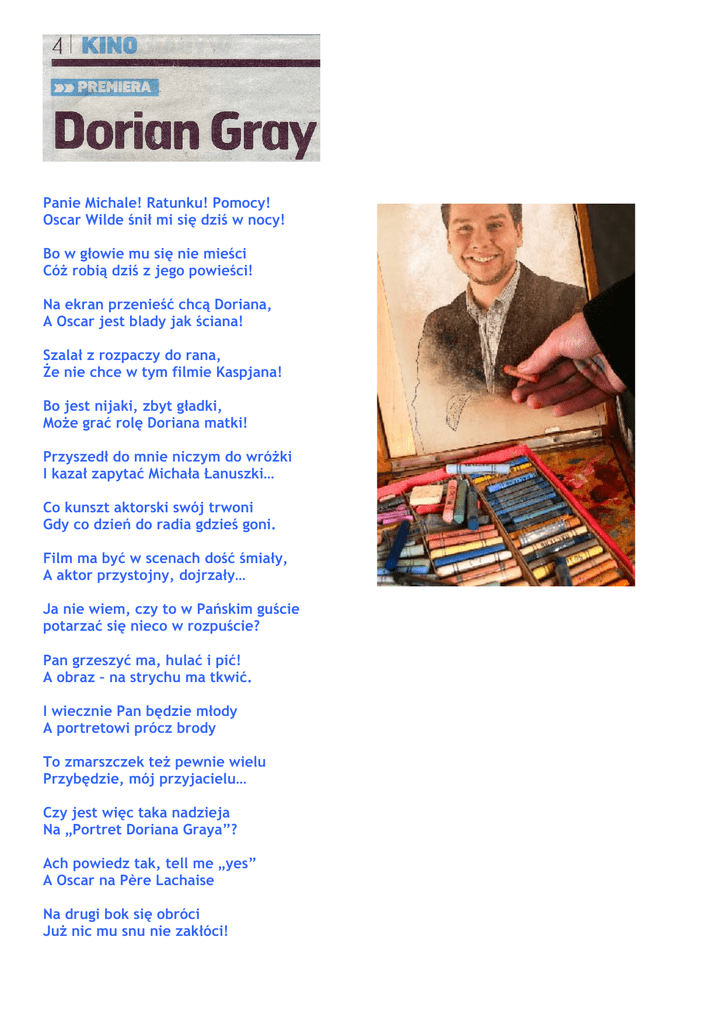 Panie Michale! Ratunku! Pomocy! Oscar Wilde śnił mi się dziś w nocy! Bo w głowie mu się nie mieści Cóż robią dziś z jego powieści! Na ekran przenieść chcą Doriana, A Oscar jest blady jak ściana! Szalał z rozpaczy do rana, Że nie chce w tym filmie Kaspjana! Bo jest nijaki, zbyt gładki, Może grać rolę Doriana matki! Przyszedł do mnie niczym do wróżki I kazał zapytać Michała Łanuszki… Co kunszt aktorski swój trwoni Gdy co dzień do radia gdzieś goni. Film ma być w scenach dość śmiały, A aktor przystojny, dojrzały… Ja nie wiem, czy to w Pańskim guście potarzać się nieco w rozpuście? Pan grzeszyć ma, hulać i pić! A obraz – na strychu ma tkwić. I wiecznie Pan będzie młody A portretowi prócz brody To zmarszczek też pewnie wielu Przybędzie, mój przyjacielu… Czy jest więc taka nadzieja Na „Portret Doriana Graya”? Ach powiedz tak, tell me „yes” A Oscar na Père Lachaise Na drugi bok się obróci Już nic mu snu nie zakłóci!