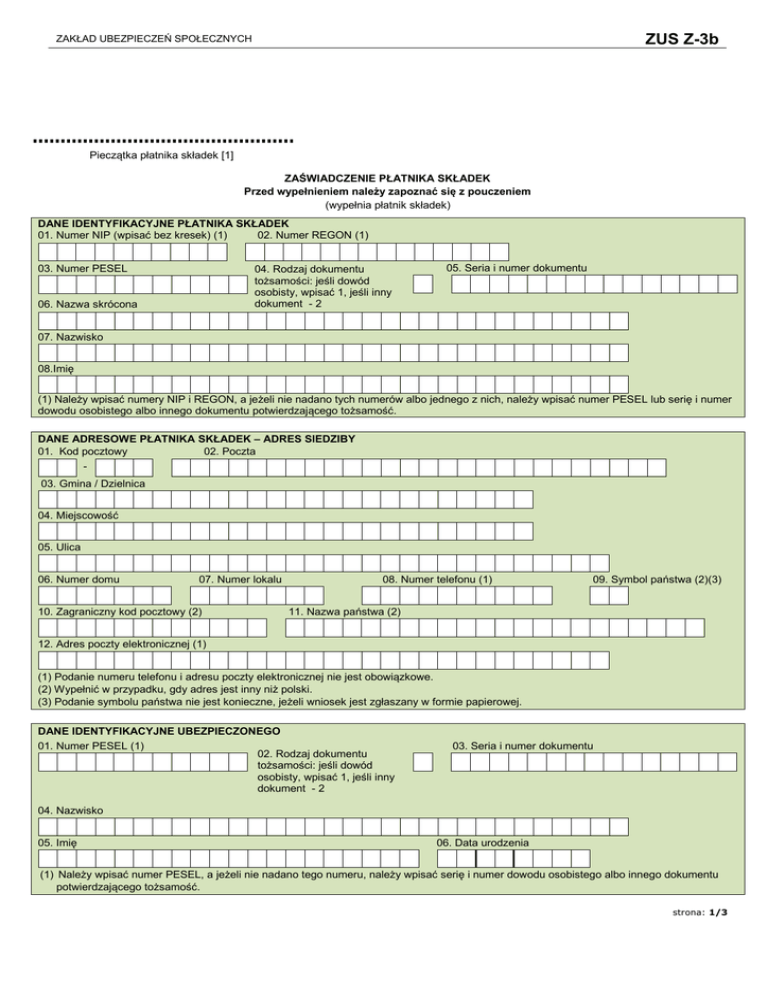 ZUS Z-3b ZAKŁAD UBEZPIECZEŃ SPOŁECZNYCH Pieczątka płatnika składek [1] ZAŚWIADCZENIE PŁATNIKA SKŁADEK Przed wypełnieniem należy zapoznać się z pouczeniem (wypełnia płatnik składek) DANE IDENTYFIKACYJNE PŁATNIKA SKŁADEK 01. Numer NIP (wpisać bez kresek) (1) 02. Numer REGON (1) 03. Numer PESEL 04. Rodzaj dokumentu tożsamości: jeśli dowód osobisty, wpisać 1, jeśli inny dokument - 2 06. Nazwa skrócona 05. Seria i numer dokumentu 07. Nazwisko 08.Imię (1) Należy wpisać numery NIP i REGON, a jeżeli nie nadano tych numerów albo jednego z nich, należy wpisać numer PESEL lub serię i numer dowodu osobistego albo innego dokumentu potwierdzającego tożsamość. DANE ADRESOWE PŁATNIKA SKŁADEK – ADRES SIEDZIBY 01. Kod pocztowy 02. Poczta 03. Gmina / Dzielnica 04. Miejscowość 05. Ulica 06. Numer domu 07. Numer lokalu 10. Zagraniczny kod pocztowy (2) 08. Numer telefonu (1) 09. Symbol państwa (2)(3) 11. Nazwa państwa (2) 12. Adres poczty elektronicznej (1) (1) Podanie numeru telefonu i adresu poczty elektronicznej nie jest obowiązkowe. (2) Wypełnić w przypadku, gdy adres jest inny niż polski. (3) Podanie symbolu państwa nie jest konieczne, jeżeli wniosek jest zgłaszany w formie papierowej. DANE IDENTYFIKACYJNE UBEZPIECZONEGO 01. Numer PESEL (1) 02. Rodzaj dokumentu tożsamości: jeśli dowód osobisty, wpisać 1, jeśli inny dokument - 2 03. Seria i numer dokumentu 04. Nazwisko 05. Imię 06. Data urodzenia (1) Należy wpisać numer PESEL, a jeżeli nie nadano tego numeru, należy wpisać serię i numer dowodu osobistego albo innego dokumentu potwierdzającego tożsamość. strona: 1/3 ZUS Z-3b ZAKŁAD UBEZPIECZEŃ SPOŁECZNYCH DANE ADRESOWE UBEZPIECZONEGO – ADRES ZAMIESZKANIA 01. Kod pocztowy 02. Poczta 03. Gmina / Dzielnica 04. Miejscowość 05. Ulica 06. Numer domu 07. Numer lokalu 09. Zagraniczny kod pocztowy (1) 08. Symbol państwa (1)(2) 10. Nazwa państwa (1) (1) Wypełnić w przypadku, gdy adres jest inny niż polski. (2) Podanie symbolu państwa nie jest konieczne, jeżeli wniosek jest zgłaszany w formie papierowej. Ubezpieczony: występuje o: (należy zaznaczyć właściwy kwadrat) zasiłek chorobowy zasiłek opiekuńczy Data od (dd/mm/rrrr) za okres od: świadczenie rehabilitacyjne zasiłek macierzyński Data do (dd/mm/rrrr) Seria i numer do: zaśw. lek. [2] Data od (dd/mm/rrrr) za okres od: Data do (dd/mm/rrrr) Seria i numer do: zaśw. lek. [2] Data od (dd/mm/rrrr) za okres od: Seria i numer zaśw. lek. [2] ……………………… (należy zaznaczyć właściwy kwadrat) - ubezpieczeniem w razie choroby i macierzyństwa (ubezpieczenie chorobowe) TAK - ubezpieczeniem z tytułu wypadków przy pracy i chorób zawodowych ( ubezpieczenie wypadkowe) jako: ……………………… Data do (dd/mm/rrrr) do: 1. Jest objęty: ……………………… NIE TAK NIE (należy zaznaczyć właściwy kwadrat) 1) osoba wykonująca pozarolniczą działalność, 2) osoba współpracująca z osobą prowadzącą pozarolniczą działalność, 3) duchowny. 2. Niezdolność do pracy powstała z powodu: choroby zawodowej Dokumentem potwierdzającym jest:: (należy zaznaczyć właściwy kwadrat) wypadku przy pracy decyzja wypadku w drodze do pracy lub z pracy karta wypadku Data (dd/mm/rrrr) nr ……………………………………………………………………………………………….... z dnia strona: 2/3 ZUS Z-3b ZAKŁAD UBEZPIECZEŃ SPOŁECZNYCH Numer rachunku bankowego ubezpieczonego [3]: …………………………………………………………………………………………. (Miejscowość) ……………………………. (Data: dd/mm/rrrr) ……………………………… (Podpis i pieczątka osoby upoważnionej [4]) POUCZENIE Podstawa prawna: ustawa z dnia 25 czerwca 1999 r. o świadczeniach pieniężnych z ubezpieczenia społecznego w razie choroby i macierzyństwa (Dz. U. z 2014 r. poz. 159 ze zm.) oraz ustawa z dnia 30 października 2002 r. o ubezpieczeniu społecznym z tytułu wypadków przy pracy i chorób zawodowych (Dz. U. z 2015 r. poz. 1242 ze zm.). Osoby podlegające ubezpieczeniu chorobowemu z tytułu: 1) wykonywania pozarolniczej działalności, 2) współpracy z osobami prowadzącymi pozarolniczą działalność, 3) bycia duchownym nabywają prawo do zasiłku chorobowego z ubezpieczenia chorobowego po upływie 90 dni nieprzerwanego ubezpieczenia chorobowego. Do 90 –dniowego okresu ubezpieczenia chorobowego wlicza się poprzednie okresy ubezpieczenia chorobowego, jeżeli przerwa między nimi nie przekroczyła 30 dni lub była spowodowana urlopem bezpłatnym, urlopem wychowawczym albo odbywaniem czynnej służby wojskowej przez żołnierza niezawodowego. Do okresu ubezpieczenia chorobowego wlicza się również okresy ubezpieczenia społecznego przed dniem 1 stycznia 1999 r. Warunek posiadania okresu ubezpieczenia chorobowego nie obowiązuje: − absolwentów szkół oraz szkół wyższych, którzy zostali objęci ubezpieczeniem chorobowym w ciągu 90 dni od dnia ukończenia szkoły lub uzyskania dyplomu ukończenia studiów wyższych, − osób, których niezdolność do pracy została spowodowana chorobą zawodową, wypadkiem przy pracy, wypadkiem w drodze do pracy lub z pracy, − posłów i senatorów, którzy przystąpili do ubezpieczenia chorobowego w ciągu 90 dni do ukończenia kadencji. Okoliczności wyłączające obowiązek posiadania 90 –dniowego okresu ubezpieczenia chorobowego należy udokumentować. Wypłaty świadczeń z tytułu wypadku przy pracy albo wypadku w drodze do pracy lub z pracy ZUS dokonuje po uprzednim uznaniu zdarzenia za taki wypadek, dlatego też należy dołączyć niezbędne dokumenty. W przypadku choroby zawodowej należy dołączyć decyzję o stwierdzeniu choroby zawodowej i zaświadczenie lekarza stwierdzające, że niezdolność do pracy jest spowodowana chorobą zawodową. Zaświadczenia płatnika składek nie składa się w przypadku kolejnego zaświadczenia lek