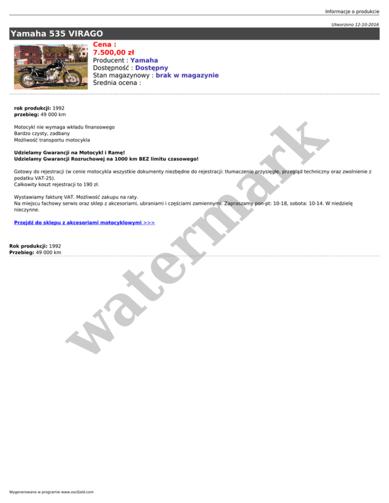 Informacje o produkcie Utworzono 12-10-2016 Yamaha 535 VIRAGO Cena : 7.500,00 zł Producent : Yamaha Dostępność : Dostępny Stan magazynowy : brak w magazynie Średnia ocena : rok produkcji: 1992 przebieg: 49 000 km er m ar k Motocykl nie wymaga wkładu finansowego Bardzo czysty, zadbany Możliwość transportu motocykla Udzielamy Gwarancji na Motocykl i Ramę! Udzielamy Gwarancji Rozruchowej na 1000 km BEZ limitu czasowego! Gotowy do rejestracji (w cenie motocykla wszystkie dokumenty niezbędne do rejestracji: tłumaczenie przysięgłe, przegląd techniczny oraz zwolnienie z podatku VAT-25). Całkowity koszt rejestracji to 190 zł. Wystawiamy fakturę VAT. Możliwość zakupu na raty. Na miejscu fachowy serwis oraz sklep z akcesoriami, ubraniami i częściami zamiennymi. Zapraszamy pon-pt: 10-18, sobota: 10-14. W niedzielę nieczynne. Przejdź do sklepu z akcesoriami motocyklowymi >>> w at Rok produkcji: 1992 Przebieg: 49 000 km Wygenerowano w programie www.oscGold.com
