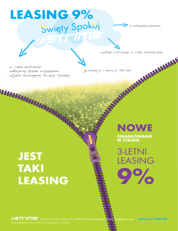 leasing 9% z ubezpieczeniem wykup wliczony w raty miesięczne w razie potrzeby odkupimy każde urządzenie objęte leasingiem Święty Spokój gwarancja i serwis strima nowe finansowanie w strimie jest taki Leasing 3-letni Leasing 9% Swadzim, ul. Poznańska 54, 62-080 Tarnowo Podgórne, e-mail: [email protected] wydrukowano z www.strima.com publikacja: 10-05-2012 telefon 61 8 950 950 Przykładowy projekt szwalni P T O H R M N R N C N B R R D M N M M N R A F M R N M U R N NN A U K L1 K L2 L M G N N A S M R M A M J I E U U M kalkulacja leasingowa tej szwalni Wartość tej szwalni Pierwsza wpłata Rata leasingowa 47 x 92.652 ZŁ 18.531 ZŁ 1.870 ZŁ Całkowity koszt leasingu 3 lata – 9%, 4 lata 14,81% Kalkulację tej szwalni wykonano dla 4-letniego okresu leasingu, który jest minimalny dla urządzeń do prasowania. Ceny netto, należy doliczyć 23 % VAT Swadzim, ul. Poznańska 54, 62-080 Tarnowo Podgórne, e-mail: [email protected] wydrukowano z www.strima.com publikacja: 10-05-2012 telefon 61 8 950 950 Servo Stawiamy nae liściem urządzenia tej szwalni A x4 szt. B x1szt. s e rv o L918-M1-13 kpl. 747K-514M2-24 SERVO kpl. Stebnówka automatyczna Siruba – Owerlok 4-nitkowy Siruba, maszyna kompletna bezpośredni napęd igielnicy – kompletny G x1szt. F x1szt. e rv o s naczon Maszyny oz Servo one w silniki ergii są wyposaż wet 70% en na ą aj dz zę – oszc C x1szt. s e rv o D x1szt. s e rv o E x1szt. s e rv o 757K-516M2-35 SERVO kpl. 221 SERVO kpl. BH790-A kpl. Owerlok 5-nitkowy Siruba bezpośredni napęd igielnicy – kompletny Podszywarka Maier – maszyna kompletna Bieliźniana dziurkarka elektroniczna Siruba – maszyna kompletna H x1szt. I x1szt. J x1szt. BT290-DS kpl. PK511-U kpl. DAYANG DYDB-2 2,5M DAYANG CZD-103 6” OP-450GST OSHIMA Ryglówka elektroniczna Siruba – maszyna kompletna Guzikarka Siruba – maszyna kompletna Odkrawacz automatyczny Nóż pionowy, wys. cięcia 11 cm Klejarka taśmowa z podstawą szer. taśm 450 mm K x2 szt. L x1szt. M x10 szt. N x10 szt. O x1szt. L1 L2 ECO DOB3711 kpl. Stół prasowalniczy Primula P x 6 szt. 40030 Podstawa stołu krojczego (1m x 1,7 m) 6 elementów = 5 mb stołu BATTISTELLA PLUTONE WITH 2 IRONS Automatyczna wytwornica pary + 2 żelazka STEAM MASTER R x8 szt. ERGOLINIA 40456 Wózek do odkładania elementów ERGOLINIA 10002 Krzesło obrotowe S x1szt. TEX 5322 Numerator DS-99KP-230V Lampa świetlówkowa T x1szt. 120 PS Pistolet do etykietowania DRESS FORM Regulowany manekin rozmiar 36 - 42 lub 42 - 48 U x4 szt. 40120 Regulowany wieszak sprawdź! WYKONAJ DOWOLNĄ KalkulacjĘ leasingowĄ na www.strima.com Swadzim, ul. Poznańska 54, 62-080 Tarnowo Podgórne, e-mail: [email protected] wydrukowano z www.strima.com publikacja: 10-05-2012 telefon 61 8 950 950