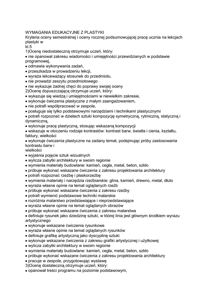 WYMAGANIA EDUKACYJNE Z PLASTYKI Kryteria oceny semestralnej i oceny rocznej podsumowującej pracę ucznia na lekcjach plastyki w kl.5 1)Ocenę niedostateczną otrzymuje uczeń, który: nie opanował zakresu wiadomości i umiejętności przewidzianych w podstawie programowej, odmawia wykonywania zadań, przeszkadza w prowadzeniu lekcji, wyraża lekceważący stosunek do przedmiotu. nie prowadzi zeszytu przedmiotowego nie wykazuje żadnej chęci do poprawy swojej oceny 2)Ocenę dopuszczającą otrzymuje uczeń, który: wykazuje się wiedzą i umiejętnościami w niewielkim zakresie, wykonuje ćwiczenia plastyczne z małym zaangażowaniem, nie potrafi współpracować w zespole, posługuje się tylko podstawowymi narzędziami i technikami plastycznymi potrafi rozpoznać w dziełach sztuki kompozycję symetryczną, rytmiczną, statyczną i dynamiczną, wykonuje pracę plastyczną, stosując wskazaną kompozycji wskazuje w otoczeniu rodzaje kontrastów: kontrast barw, światła i cienia, kształtu, faktury, wielkości wykonuje ćwiczenia plastyczne na zadany temat, podejmując próby zastosowania kontrastu barw i wielkości wyjaśnia pojęcie sztuk wizualnych wylicza zabytki architektury w swoim regionie wymienia materiały budowlane: kamień, cegła, metal, beton, szkło próbuje wykonać wskazane ćwiczenia z zakresu projektowania architektury potrafi rozpoznać rzeźbę i płaskorzeźbę wymienia materiały i narzędzia rzeźbiarskie: glina, kamień, drewno, metal, dłuto wyraża własne opinie na temat oglądanych rzeźb próbuje wykonać wskazane ćwiczenia z zakresu rzeźby potrafi wymienić podstawowe techniki malarskie rozróżnia malarstwo przedstawiające i nieprzedstawiające wyraża własne opinie na temat oglądanych obrazów próbuje wykonać wskazane ćwiczenia z zakresu malarstwa definiuje rysunek jako dziedzinę sztuki, w której linia jest głównym środkiem wyrazu artystycznego wykonuje wskazane ćwiczenia rysunkowe wyraża własne opinie na temat oglądanych rysunków definiuje grafikę artystyczną jako dyscyplinę sztuki wykonuje wskazane ćwiczenia z zakresu grafiki artystycznej i użytkowej wylicza zabytki architektury w swoim regionie wymienia materiały budowlane: kamień, cegła, metal, beton, szkło próbuje wykonać wskazane ćwiczenia z zakresu projektowania architektury pracuje w zespole, przygotowując wystawę 3)Ocenę dostateczną otrzymuje uczeń, który: opanował treści programu na poziomie podstawowym, wykazuje się małą aktywnością podczas lekcji, czasami jest nieprzygotowany do zajęć, wykonuje ćwiczenia plastyczne zgodne z tematem, ale mało staranne, posługuje się technikami plastycznymi, w tym graficznymi programami komputerowymi i fotografią we własnych działaniach plastycznych w zakresie podstawowym, posługuje się terminologią plastyczną na poziomie podstawowym, wykazuje trudności we współpracy podczas działań zespołowych, opanował umiejętności opisu dzieła sztuki w stopniu podstawowym definiuje pojęcie rzeźby jako dzieła sztuki oglądanego w trzech wymiarach, pojęcia płaskorzeźby jako dzieła rzeźbiarskiego na płaszczyźnie wymienia materiały i narzędzia rzeźbiarskie: glina, kamień, drewno, metal, dłuto tworzy prosty opis wskazanej rzeźby wykonuje ćwiczenia z zakresu rzeźby wyjaśnia pojęcie kontrastu wykonuje ćwiczenia plastyczne na zadany temat, podejmując próby zastosowania wskazanych kontrastów wyjaśnia, czym jest kompozycja potrafi rozpoznać w dziełach sztuki kompozycję symetryczną, rytmiczną, statyczną i dynamiczną, wykonuje ćwiczenia plastyczne na zadany temat, podejmując próby zastosowania podanych kompozycji definiuje pojęcie dyscyplin sztuki wyjaśnia pojęcie architektury wykonuje ćwiczenia z zakresu architektury tworzy prosty opis wskazanej budowli definiuje pojęcie malarstwa jako dziedziny sztuki, gdzie istotą przekazu jest głównie plama barwna wymienia narzędzia malarza: sztalugę, paletę, pędzle, farby, papier, płótno, deskę wyjaśnia, na czym polega technika kolażu i mozaiki tworzy prosty opis wskazanego obrazu rozpoznaje na reprodukcjach szkic rysunkowy tworzy szkice rysunkowe tworzy prace rysunkowe, stosując różne techniki tworzy prosty opis wskazanego obrazu wyjaśnia proces tworzenia grafiki: projekt, wykonanie matrycy, drukowanie wykonuje ćwiczenia z zakresu grafiki artystycznej i użytkowej, stosując wskazane techniki wyraża własne zdanie na temat oglądanych grafik tworzy prosty opis wskazanej grafiki jest przekonany o konieczności uczestnictwa w życiu kulturalnym wykonuje zadania plastyczne na podany temat, podejmując próby zastosowania wskazanych środków odnajduje w pracach plastycznych własnych i innych uczniów poznane elementy języka sztuki 4)Ocenę dobrą otrzymuje uczeń, który: przyswoił wiadomości objęte programem, w skupieniu uczestniczy w zajęciach, zadawalająco posługuje się technikami plastycznymi, poprawnie wykonuje ćwiczenia plastyczne, zadawalająco posługuje się terminologią plastyczną, potrafi wykorzystać graficzne programy komputerowe i fotografie we własnych działaniach plastycznych, umie opisać dzieło sztuki, potrafi współpracować przy realizacji działań zespołowych wskazuje w reprodukcjach dzieł sztuki rodzaje kontrastów: kontrast barw, światła i cienia, kształtu, faktury wielkości wykorzystuje wiedzę o kontraście barw, tworząc własne prace plastyczne rozpoznaje w otoczeniu i w dziełach sztuki kompozycje statyczną i dynamiczną, rytmiczną i symetryczną wykorzystuje wiedzę o poszczególnych rodzajach kompozycji, tworząc własne prace plastyczne wskazuje dyscypliny sztuki zaliczone do sztuk wizualnych XX wieku klasyfikuje typy architektury ze względu na funkcje: mieszkalna, sakralna, użyteczności publicznej omawia warsztat architekta wymienia sposoby wykonania projektu: rysunek, makieta, projekt komputerowy wykonuje projekty, stosując techniki z zakresu warsztatu architekta ad
