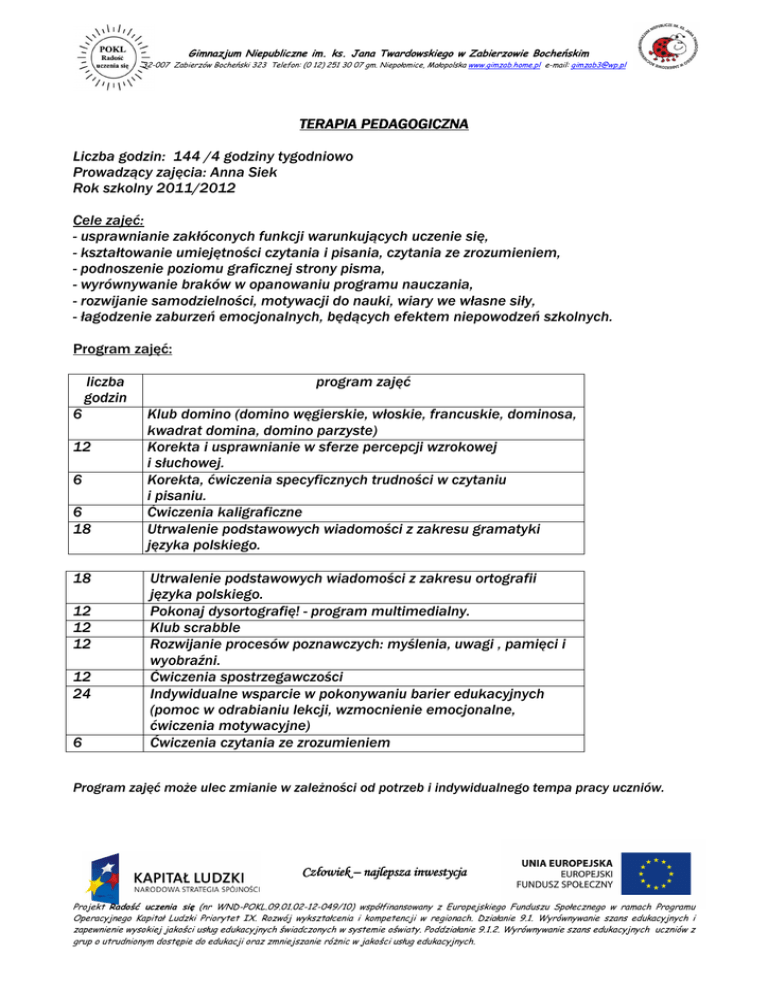 Gimnazjum Niepubliczne im. ks. Jana Twardowskiego w Zabierzowie Bocheńskim 32-007 Zabierzów Bocheński 323 Telefon: (0 12) 251 30 07 gm. Niepołomice, Małopolska www.gimzab.home.pl e-mail: [email protected] TERAPIA PEDAGOGICZNA Liczba godzin: 144 /4 godziny tygodniowo Prowadzący zajęcia: Anna Siek Rok szkolny 2011/2012 Cele zajęć: - usprawnianie zakłóconych funkcji warunkujących uczenie się, - kształtowanie umiejętności czytania i pisania, czytania ze zrozumieniem, - podnoszenie poziomu graficznej strony pisma, - wyrównywanie braków w opanowaniu programu nauczania, - rozwijanie samodzielności, motywacji do nauki, wiary we własne siły, - łagodzenie zaburzeń emocjonalnych, będących efektem niepowodzeń szkolnych. Program zajęć: liczba godzin 6 12 6 6 18 18 12 12 12 12 24 6 program zajęć Klub domino (domino węgierskie, włoskie, francuskie, dominosa, kwadrat domina, domino parzyste) Korekta i usprawnianie w sferze percepcji wzrokowej i słuchowej. Korekta, ćwiczenia specyficznych trudności w czytaniu i pisaniu. Ćwiczenia kaligraficzne Utrwalenie podstawowych wiadomości z zakresu gramatyki języka polskiego. Utrwalenie podstawowych wiadomości z zakresu ortografii języka polskiego. Pokonaj dysortografię! - program multimedialny. Klub scrabble Rozwijanie procesów poznawczych: myślenia, uwagi , pamięci i wyobraźni. Ćwiczenia spostrzegawczości Indywidualne wsparcie w pokonywaniu barier edukacyjnych (pomoc w odrabianiu lekcji, wzmocnienie emocjonalne, ćwiczenia motywacyjne) Ćwiczenia czytania ze zrozumieniem Program zajęć może ulec zmianie w zależności od potrzeb i indywidualnego tempa pracy uczniów. Człowiek – najlepsza inwestycja Projekt Radość uczenia się (nr WND-POKL.09.01.02-12-049/10) współfinansowany z Europejskiego Funduszu Społecznego w ramach Programu Operacyjnego Kapitał Ludzki Priorytet IX. Rozwój wykształcenia i kompetencji w regionach. Działanie 9.1. Wyrównywanie szans edukacyjnych i zapewnienie wysokiej jakości usług edukacyjnych świadczonych w systemie oświaty. Poddziałanie 9.1.2. Wyrównywanie szans edukacyjnych uczniów z grup o utrudnionym dostępie do edukacji oraz zmniejszanie różnic w jakości usług edukacyjnych.