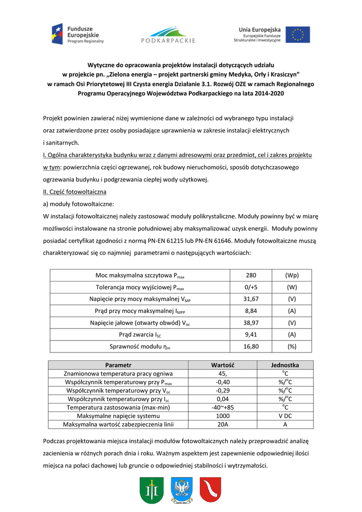 Wytyczne do opracowania projektów instalacji dotyczących udziału w projekcie pn. „Zielona energia – projekt partnerski gminy Medyka, Orły i Krasiczyn” w ramach Osi Priorytetowej III Czysta energia Działanie 3.1. Rozwój OZE w ramach Regionalnego Programu Operacyjnego Województwa Podkarpackiego na lata 2014-2020 Projekt powinien zawierać niżej wymienione dane w zależności od wybranego typu instalacji oraz zatwierdzone przez osoby posiadające uprawnienia w zakresie instalacji elektrycznych i sanitarnych. I. Ogólna charakterystyka budynku wraz z danymi adresowymi oraz przedmiot, cel i zakres projektu w tym: powierzchnia części ogrzewanej, rok budowy nieruchomości, sposób dotychczasowego ogrzewania budynku i podgrzewania ciepłej wody użytkowej. II. Część fotowoltaiczna a) moduły fotowoltaiczne: W instalacji fotowoltaicznej należy zastosować moduły polikrystaliczne. Moduły powinny być w miarę możliwości instalowane na stronie południowej aby maksymalizować uzysk energii. Moduły powinny posiadać certyfikat zgodności z normą PN-EN 61215 lub PN-EN 61646. Moduły fotowoltaiczne muszą charakteryzować się co najmniej parametrami o następujących wartościach: Moc maksymalna szczytowa Pmax 280 (Wp) Tolerancja mocy wyjściowej Pmax 0/+5 (W) Napięcie przy mocy maksymalnej VMP 31,67 (V) Prąd przy mocy maksymalnej IMPP 8,84 (A) Napięcie jałowe (otwarty obwód) Voc 38,97 (V) Prąd zwarcia ISC 9,41 (A) Sprawność modułu ηm 16,80 (%) Parametr Znamionowa temperatura pracy ogniwa Współczynnik temperaturowy przy Pmax Współczynnik temperaturowy przy Voc Współczynnik temperaturowy przy Isc Temperatura zastosowania (max-min) Maksymalne napięcie systemu Maksymalna wartość zabezpieczenia linii Wartość 45, -0,40 -0,29 0,04 -40~+85 1000 20A Jednostka o C %/oC %/oC %/oC o C V DC A Podczas projektowania miejsca instalacji modułów fotowoltaicznych należy przeprowadzić analizę zacienienia w różnych porach dnia i roku. Ważnym aspektem jest zapewnienie odpowiedniej ilości miejsca na połaci dachowej lub gruncie o odpowiedniej stabilności i wytrzymałości. b) falownik W instalacji należy zastosować falownik beztransformatorowy, jednofazowy, powinien posiadać ochronę przed zmianą polaryzacji oraz wbudowane ograniczniki przepięć typu II po stronie DC, stopień ochrony IP65. Projektant w doborze inwertera powinien kierować się odpowiednimi parametrami elektrycznymi urządzeń systemu, a także parametrami indywidualnymi dla każdej instalacji fotowoltaicznej (lokalizacja, azymut, kąt nachylenia modułów, zmienne warunki nasłonecznienia oraz okresowe zacienienie powierzchni czynnej modułów fotowoltaicznych). Obudowa inwertera powinna charakteryzować się stopniem szczelności IP65, zgodnie z normą PN-EN 60529:2003 i zapewniać ochronę przed do stępem do części niebezpiecznych. Z uwagi na zmienne warunki nasłonecznienia w warunkach polskich lub okresowe zacienienie, wszystkie falowniki powinny być wyposażone w algorytm zapobiegający lokalnym odczytom punktu mocy maksymalnej w charakterystyce prądowo-napięciowej zainstalowanych modułów, wyszukując tym samym rzeczywisty globalny maksymalny punkt mocy w całym stringu. Inwertery powinny być produkcji europejskiej. Wymagana minimalna sprawność inwerterów wynosi: 98,0 %.Wymagane certyfikaty/dokumenty: Deklaracja zgodności WE Deklaracja zgodności na kompatybilność elektromagnetyczną zgodna z obowiązującą dyrektywą 2004/108/WE Deklaracja zgodności z obowiązującą dyrektywą niskonapięciową 2006/95/WE Certyfikat zgodności z normą EN 50438 Deklaracja kompatybilności elektromagnetycznej. Ponadto, dla instalacji o mocy <5 kWp STRONA DC: Maksymalne napięcie wejściowe – 600/850V Znamionowe napięcie wejściowe – min. 400V Minimalne napięcie wejściowe - 150V Liczba wejść MPP – min. 1 Wbudowany rozłącznik DC STRONA AC: Napięcie znamionowe AC - 230V Zakres napięcia znamionowego - 180V-280V Częstotliwość sieci AC - 50Hz Liczba zasilanych faz - 1 Całkowite zniekształcenia harmoniczne prądu <3% Zdolność kompensowania mocy biernej w ciągu dnia OGÓLNE DANE TECHNICZNE: Poziom emisji hałasu - <50dB Zużycie energii nocą - <10,0W Przyłącze DC – IP65 (np. MC4) Komunikacja Ethernet/Wifi Monitorowanie instalacji przez portal internetowy c) Proponowane parametry kabli do paneli PV - kable powinny być przeznaczone do instalacji fotowoltaicznych o przekroju zapewniającym straty przesyłowe nie większe niż 1% - kable powinny być odporne na promieniowanie UV i warunki atmosferyczne, - temperatura pracy kabli powinna być w granicach -40 do + 70 stopni C, - kable powinny być podwójnie izolowane, - kable powinny posiadać izolacje na napięcie stałe min 1600 VDC. d) konstrukcja montażowa powinna być z materiałów o podwyższonej odporności na rdzę i warunki atmosferyczne, a jej wytrzymałość przystosowana do odpowiedniej strefy śniegowej i wiatrowej. e) ułożenie tras kablowych f) Część elektryczna instalacji prądu stałego DC i przemiennego AC - okablowanie w części prądu stałego - okablowanie w części prądu przemiennego - opis prognozowanej do wytworzenia ilości energii z uwzględnieniem strat w czasie. g) Cześć elektryczna - przyłącze elektroenergetyczne: - Rozdzielnica RG Budynku - Linia kablowa - Instalacja przeciwpożarowa - Ochrona przeciwporażeniowa oraz przeciwprzepięciowa obiektu. Prognozowana produkcja energii elektrycznej Zaprojektowana instalacja powinna spełniać kryteria oceny możliwości przyłączenia oraz wymagania techniczne dla mikroinstalacji i małych instalacji przyłączanych do sieci dystrybucyjnej niskiego napięcia Operatora Systemu Dystrybucyjnego PGE Dystrybucja S.A III. Instalacja pompy ciepła - Opis pompy ciepła - Współczynnik efektywności COP - minimalna wartości to 3,2 - Opis sprzętu Zgodność z dyrektywą urządzeń ciśnieniowych (PED): 97/23/EC Zgodność dyrektywą niskonapię