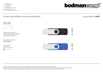 ul.Ryglicka 21b 33-170 Tuchów 13 491 50 96 [email protected] www.bodman.com.pl www.sklep.bodman.com.pl Pamiêæ USB TWISTER z wtyczk¹ microUSB 8GB kod produktu: 44201 Rozmiar nadruku: 13mm x 25mm 44201-02 Standardowo grawer o podanym rozmiarze wykonywany jest po jednej stronie. W przypadku niestandardowego znakowania nale¿y skontaktowaæ siê z biurem handlowym przed dokonaniem zakupu. Technologia znakowania: Grawer Laserowy nie ma mo¿liwoœci wyboru koloru znakowania Grawer Laserowy 44201-03 Kolor nadruku: Czytelnoœæ napisów (poni¿ej 1mm) przy du¿ym powiêkszeniu nie gwarantuje ich czytelnoœci na gotowym produkcie. Reklamacje odnoœnie iloœci, treœci (w tym b³êdów i literówek), grafik oraz kolorów przedmiotów po dokonaniu akceptacji projektu nie s¹ uwzglêdniane. bodman.com.pl nie ponosi odpowiedzialnoœci za jakoœæ i zawartoœæ materia³ów dostarczonych od klienta w tym zdjêæ, grafik i tekstów.