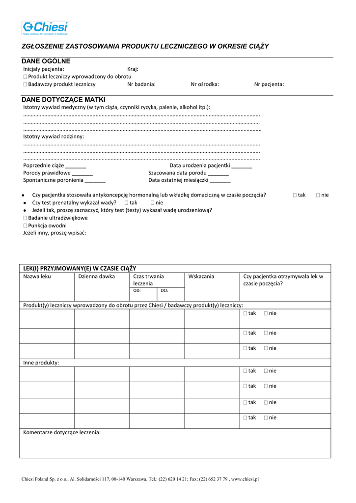 ZGŁOSZENIE ZASTOSOWANIA PRODUKTU LECZNICZEGO W OKRESIE CIĄŻY DANE OGÓLNE Inicjały pacjenta: Kraj: Produkt leczniczy wprowadzony do obrotu Badawczy produkt leczniczy Nr badania: Nr ośrodka: Nr pacjenta: DANE DOTYCZĄCE MATKI Istotny wywiad medyczny (w tym ciąża, czynniki ryzyka, palenie, alkohol itp.): ............................................................................................................................................................. ............................................................................................................................................................. .............................................................................................................................................................. Istotny wywiad rodzinny: ............................................................................................................................................................. ............................................................................................................................................................. ............................................................................................................................................................. Poprzednie ciąże _______ Data urodzenia pacjentki _______ Porody prawidłowe _______ Szacowana data porodu _______ Spontaniczne poronienia _______ Data ostatniej miesiączki _______ Czy pacjentka stosowała antykoncepcję hormonalną lub wkładkę domaciczną w czasie poczęcia? Czy test prenatalny wykazał wady? tak nie Jeżeli tak, proszę zaznaczyć, który test (testy) wykazał wadę urodzeniową? Badanie ultradźwiękowe Punkcja owodni Jeżeli inny, proszę wpisać: tak nie LEK(I) PRZYJMOWANY(E) W CZASIE CIĄŻY Nazwa leku Dzienna dawka Czas trwania leczenia OD: Wskazania Czy pacjentka otrzymywała lek w czasie poczęcia? DO: Produkt(y) leczniczy wprowadzony do obrotu przez Chiesi / badawczy produkt(y) leczniczy: tak nie tak nie tak nie tak nie tak nie tak nie tak nie Inne produkty: Komentarze dotyczące leczenia: Chiesi Poland Sp. z o.o., Al. Solidarności 117, 00-140 Warszawa, Tel.: (22) 620 14 21; Fax: (22) 652 37 79 , www.chiesi.pl WYNIK CIĄŻY Data urodzenia: Waga urodzeniowa: Płeć: męska Poród o czasie Poród przedwczesny Spontaniczne poronienie Planowane zakończenie żeńska W przypadku porodu przedwczesnego określić: wiek ciążowy: tygodni: określić: Typ porodu: Normalny pochwowy Poród kleszczowy Cięcie cesarskie Określić, jeżeli inny: Wynik: Zdrowe dziecko Chore dziecko (np. wada urodzeniowa, zakażenie) Wada wrodzona / defekt urodzeniowy Płód martwo urodzony Czy stwierdzono defekt urodzeniowy? tak nie tak nie tak nie tak nie Jeżeli zaobserwowano defekt urodzeniowy, proszę opisać: Co jest przyczyną defektu(ów)?: Proszę opisać wszystkie problemy, które miały miejsce tuż po urodzeniu (np. żółtaczka, problemy z oddychaniem): Dodatkowe uwagi: Nazwisko osoby zgłaszającej / badacza: Telefon: Faks: Adres: E-mail: Podpis: Data: Uprzejmie informujemy, iż administratorem Pani/Pana danych osobowych dobrowolnie podanych w celu związanym ze zgłoszeniem działania niepożądanego jest Chiesi Pharmaceuticals GmbH z siedzibą w Wiedniu, przy ulicy Gonzagagasse 16/16, 1010 Wiedeń, Austria. Dane osobowe będą udostępniane podmiotom upoważnionym na podstawie przepisów prawa. Przysługuje Pani/Panu prawo dostępu do treści swoich danych oraz ich poprawiania. Zgłoszenia i zapytania w związku ze zgłoszeniami działań niepożądanych należy kierować na adres Chiesi Poland Sp. z o.o. z siedzibą w Warszawie (00-140) przy Al. Solidarności 117, działającego w imieniu administratora danych. Wypełniony formularz należy przesłać na adres podany w stopce dokumentu. Chiesi Poland Sp. z o.o., Al. Solidarności 117, 00-140 Warszawa, Tel.: (22) 620 14 21; Fax: (22) 652 37 79 , www.chiesi.pl