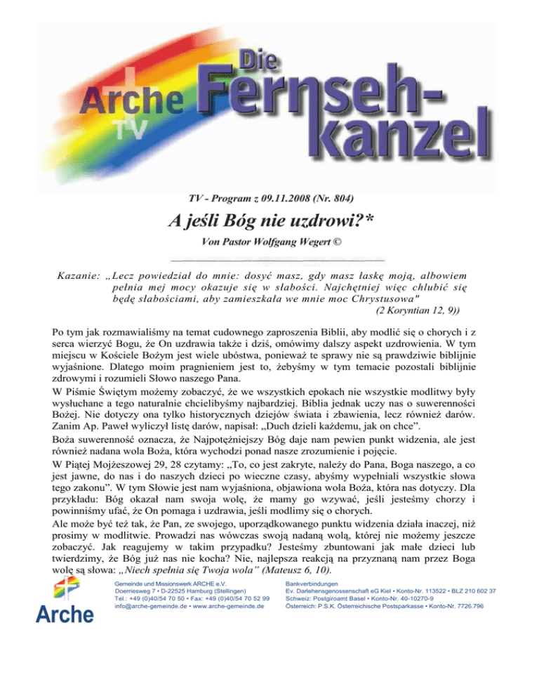 TV - Program z 09.11.2008 (Nr. 804) A jeśli Bóg nie uzdrowi?* Von Pastor Wolfgang Wegert © Kazanie: „Lecz powiedział do mnie: dosyć masz, gdy masz łaskę moją, albowiem pełnia mej mocy okazuje się w słabości. Najchętniej więc chlubić się będę słabościami, aby zamieszkała we mnie moc Chrystusowa" (2 Koryntian 12, 9)) Po tym jak rozmawialiśmy na temat cudownego zaproszenia Biblii, aby modlić się o chorych i z serca wierzyć Bogu, Ŝe On uzdrawia takŜe i dziś, omówimy dalszy aspekt uzdrowienia. W tym miejscu w Kościele BoŜym jest wiele ubóstwa, poniewaŜ te sprawy nie są prawdziwie biblijnie wyjaśnione. Dlatego moim pragnieniem jest to, Ŝebyśmy w tym temacie pozostali biblijnie zdrowymi i rozumieli Słowo naszego Pana. W Piśmie Świętym moŜemy zobaczyć, Ŝe we wszystkich epokach nie wszystkie modlitwy były wysłuchane a tego naturalnie chcielibyśmy najbardziej. Biblia jednak uczy nas o suwerenności BoŜej. Nie dotyczy ona tylko historycznych dziejów świata i zbawienia, lecz równieŜ darów. Zanim Ap. Paweł wyliczył listę darów, napisał: „Duch dzieli kaŜdemu, jak on chce”. BoŜa suwerenność oznacza, Ŝe NajpotęŜniejszy Bóg daje nam pewien punkt widzenia, ale jest równieŜ nadana wola BoŜa, która wychodzi ponad nasze zrozumienie i pojęcie. W Piątej MojŜeszowej 29, 28 czytamy: „To, co jest zakryte, naleŜy do Pana, Boga naszego, a co jest jawne, do nas i do naszych dzieci po wieczne czasy, abyśmy wypełniali wszystkie słowa tego zakonu”. W tym Słowie jest nam wyjaśniona, objawiona wola BoŜa, która nas dotyczy. Dla przykładu: Bóg okazał nam swoja wolę, Ŝe mamy go wzywać, jeśli jesteśmy chorzy i powinniśmy ufać, Ŝe On pomaga i uzdrawia, jeśli modlimy się o chorych. Ale moŜe być teŜ tak, Ŝe Pan, ze swojego, uporządkowanego punktu widzenia działa inaczej, niŜ prosimy w modlitwie. Prowadzi nas wówczas swoją nadaną wolą, której nie moŜemy jeszcze zobaczyć. Jak reagujemy w takim przypadku? Jesteśmy zbuntowani jak małe dzieci lub twierdzimy, Ŝe Bóg juŜ nas nie kocha? Nie, najlepsza reakcją na przyznaną nam przez Boga wolę są słowa: „Niech spełnia się Twoja wola” (Mateusz 6, 10). Arche Gemeinde und Missionswerk ARCHE e.V. Doerriesweg 7 • D-22525 Hamburg (Stellingen) Tel.: +49 (0)40/54 70 50 • Fax: +49 (0)40/54 70 52 99 [email protected] • www.arche-gemeinde.de Bankverbindungen Ev. Darlehensgenossenschaft eG Kiel • Konto-Nr. 113522 • BLZ 210 602 37 Schweiz: Postgiroamt Basel • Konto-Nr. 40-10270-9 Österreich: P.S.K. Österreichische Postsparkasse • Konto-Nr. 7726.796 Strona 2 - TV-Program / 804 „A jeśli Bóg nie uzdrowi?“ Jest to główna motywacja modlitwy naszego Pana Jezusa. Taką modlitwą uznajemy, Ŝe jesteśmy nikli i bez pojęcia, ale Bóg ma mądrość i wysokość. Jeśli modlimy się takimi słowami, upokorzymy się i rozpoznamy, Ŝe BoŜe drogi są odpowiednie nawet, jeśli ich nie rozumiemy, a dla nas lepsze byłyby inne. Zgadzamy się wówczas, gdy Pan mówi: „Drogi moje są wyŜsze od waszych, a myśli moje-przewyŜszają wasze” (Izajasz 55, 9). Przed ukrzyŜowaniem, nasz Pan, Syn BoŜy chodził w objawionej woli nadanej przez swojego Ojca. Po objawieniu woli BoŜej Jezus modlił się: „Ojcze mój, jeśli to moŜliwe, niech ominie mnie ten kielich”. Ale pomimo przyznanej wagi cięŜaru woli BoŜej modlił się dalej: „lecz niech się stanie nie to, co ja chcę, ale co Ty chcesz. (Mateusz 26, 39). Wynik ofiarowania suwerennej woli BoŜej ma potęŜną moc. PrzeŜyłem nawet to, Ŝe w ofiarowaniu BoŜych dróg, których nie rozumiemy czasem tkwi moc uzdrowienia, podczas gdy oddalamy Boga wiarą, która pochodzi z naszego ciała, prosząc z nią o uzdrowienie. Jeśli zrozumiemy tą tajemnicę ofiarowania przestaniemy się osobiście zmagać i walczyć dla honoru. Nasza dusza znajdzie spokój, będziemy cisi przed Bogiem i polecimy Mu, NajwyŜszemu Bogu nasze Ŝycie. To teŜ jest wiara i zaufanie Bogu. To jest nawet wielka wiara. Dosyć masz, gdy masz łaskę moją Wszyscy słyszeliśmy o cierniu wbitym w ciało Ap. Pawła. On uwaŜał go za posłańca szatana, który go policzkował. Często są spory czy była to choroba, szatańskie oskarŜanie lub po prostu depresja. UwaŜam, Ŝe nie jest najwaŜniejsze, co to było, ale powinniśmy dokładnie przyjrzeć się związkowi tekstu. Z niego wynika, Ŝe ten „cierń w ciele” bardzo osłabiał Apostoła, dlatego Paweł napisał: „W tej sprawie trzy razy prosiłem Pana, by on odstąpił ode mnie” (2 Koryntian 12, 8). Ap. Paweł czynił, więc objawioną wolę BoŜą, która brzmi: Módl się! Zaufaj Bogu! Kładź ręce na chorych i namaszczaj ich oliwą. Wołaj do Boga - to uczynił Ap. Paweł. On trzy razy prosił całkiem powaŜnie o uwolnienie z cierpienia, ale wówczas przyszła do niego przyznana przez Boga wola i było to: „Dość masz, gdy masz łaskę moją” (2 Koryntian 12, 9) On chciał powiedzieć: „Niech wystarczy tobie moja samonosząca łaska!” Czy Ap. Paweł nie miał Ŝadnej wiary? Czy nie wiedział, czym jest modlitwa wiary? On wiedział to bardzo dokładnie. Przez niego samego działo się wiele cudów i nauczał o duchowych darach uzdrawiania, ale respektował, Ŝe Bóg z uporządkowanej woli nie zawsze daje nam wejrzeć natychmiast w tą tajemnicę. Biblia daje nam jedno zrozumienie, dlaczego nadana BoŜa wola jest moŜliwa do zniesienia. Często powodem jest uzdrowienie. Jezus powiedział: „ Jest lepiej, jeśli wejdziesz jako kaleka do Królestwa BoŜego niŜ będziesz szedł zdrowy na potępienie”. Pan chce przez to powiedzieć, Ŝe zbawienie duszy jest waŜniejsze niŜ cielesne kalectwo. Dla Boga jest to decydujące, dlatego pracuje On w środku naszych serc, uświęcając i przemieniając nas na obraz Jezusa. Takim przypadkiem był teŜ Ap. Paweł, dlatego szczerze podał przyczynę potrójnie niewysłuchanej modlitwy : „Bym się więc z nadzwyczajności o