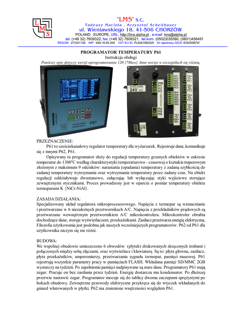 "LMS" S.C. Tadeusz Macioła , Krzy sz tof Scheithauer ul. Wieniawskiego 18, 41-506 CHORZÓW POLAND , EUROPE, URL: http://lms.alpha.pl , e-mail: [email protected] tel. (+48 32) 7609322; fax. (+48 32) 7609321, tel.kom. (0502)035580, (0601)456491 REGON: 273301106 NIP: 648-19-80-209 VAT EU ID: PL6481980209 Nr rejestrowy GIOS: E0004987W PROGRAMATOR TEMPERATURY P61 Instrukcja obsługi Poniższy opis dotyczy wersji oprogramowania 120 {78hex}. Inne wersje w szczegółach się różnią. PRZEZNACZENIE: P61 to sześciokanałowy regulator temperatury dla wyżarzarek. Rejestruje dane, komunikuje się z innymi P62, P61. Opisywany tu programator służy do regulacji temperatury grzanych obiektów w zakresie temperatur do 1300oC według charakterystyki temperaturowo - czasowej o kształcie trapezowym złożonym z maksimum 9 odcinków: narastania (opadania) temperatury z zadaną szybkością do zadanej temperatury wytrzymania oraz wytrzymania temperatury przez zadany czas. Na obiekt regulacji oddziaływuje dwustanowo, załączając lub wyłączając styki wyjściowe sterujące zewnętrznymi stycznikami. Proces prowadzony jest w oparciu o pomiar temperatury obiektu termoparami K {NiCr-NiAl}. ZASADA DZIAŁANIA: Specjalizowany układ regulatora mikroprocesorowego. Napięcia z termopar są wzmacnianie i przetwarzane w 6 niezależnych przetwornikach A/C. Napięcia z przekładników prądowych są przetwarzane wewnętrznym przetwornikiem A/C mikrokontrolera. Mikrokontroler obrabia dochodzące dane, steruje wyświetlaczem, przekaźnikami. Zasilacz przetwarza energię elektryczną. Filozofia użytkowania jest podobna jak naszych wcześniejszych programatorów. P62 od P61 dla użytkownika niczym się nie różni. BUDOWA: We wspólnej obudowie umieszczono 6 obwodów (płytek) drukowanych skręconych śrubami i połączonych między sobą złączami, oraz wyświetlacz i klawiaturę. Są to: płyta główna, zasilacz, płyta przekaźników, amperomierzy, przetwarzania sygnału termopar, pamięci masowej. P61 rejestrują wszystkie parametry pracy w pamięciach FLASH. Wkładana pamięć SD/MMC 2GB wystarczy na tydzień. Po zapełnieniu pamięci nadpisywane są stare dane. Programatory P61 mają zegar. Pracuje on bez zasilania przez tydzień. Energię dostarcza mu kondensator. Po dłuższej przerwie nastawić zegar. Programator mocuje się do tablicy dwoma zaczepami sprężystymi po bokach obudowy. Zewnętrzne przewody elektryczne przykręca się do wtyczek wkładanych do gniazd wlutowanych w płytki. P62 ma zmienione wnętrzności względem P61. Instrukcja Obsługi Programatora Temperatury P61 {v.120} DANE TECHNICZNE P61: Napięcie zasilania: 18... 24V ...36V , 0... 50Hz ...1000Hz sugeruję zasilać z transformatora małej mocy, zamontowanego tak, by mógł się spalić bez innych strat, łatwego do wymiany. Pobór mocy Wytrzymałość styku regulacyjnego Wymiary obrysu [wys. x szer. x gł.]: Dopuszczalna temperatura obudowy: 15VA 1A 230V 50Hz 144mm x 144mm x 132mm -20 oC do +80 oC Możliwe nastawy parametrów grzania w trybie automatycznym: szybkość narastania/ opadania temperatury 1 do 9999 oC/h nastawienie zera ma specjalne znaczenie, opisane dalej temperatura wytrzymania 0 do 1535 oC czas wytrzymania 0 do 9999 minut maksymalna ilość odcinków charakterystyki 9 Pomiar temperatury: Czujniki temperatury: zewnętrzna termopara typu K {NiCr-NiAl}. (Jedna na kanał). Zakres temperatur konwertowany -176 oC do +1370 oC (przekroczenie zakresu: -177&+1371) Dokładność pomiaru temperatury ±10 oC (zależy od stabilności temperatury otoczenia i kalibracji) Rezystancja wejściowa >1MΩ Zakres napięć przetwarzanych -73mV...+73mV 22bity Wytrzymałość wejść 230V 50Hz Wewnętrzna kompensacja temperatury "zimnego" końca termopary. Wykrywanie awarii termopary (na wejście podawany prąd stały 50nA). Pomiar prądu: Maksymalny prąd strony wtórnej przekładnika 0,2A (wlutować odpowiednie oporniki) Szczytowe napięcie z przekładnika prądowego 5V Napięcie referencyjne przetwornika amperomierza 3,3V Parametry amperomierza – nieklasyfikowane – mają zadanie orientacyjnego wskaźnika. Współpracuje z zewnętrznym przekładnikiem prądowym o małym znamionowym prądzie wyjściowym (5-200mA). Oporniki wewnętrzne są dobierane dla konkretnego przypadku. Amperomierz mierzy wartość średnią dwupołówkowo prostowaną. Wskazanie zależy od nastawionej skali. Obok jest słupek (bargraf) dla łatwiejszej oceny chwilowego prądu grzałek sterowanych stycznikiem. Liczbowo pokazywany jest szczyt prądu średniego grzałek w okresie taktowania, by dłużej wyświetlał , łatwiej było analizować. Dla krótkich załączeń (małego wysterowania), pokazuje bzdury (za mało), pomija wychwytywanie szczytu. Pamięta ustawienia po wyłączeniu zasilania. Odtwarza ostatnie przy ponownym zasilaniu. Krótkotrwały brak zasilania (<5minut) pozwoli na kontynuację pracy. Po tym czasie załączone kanały zostaną wyłączone. Ma elementy ochrony nadnapięciowej. By chroniły przed jonizatorem TIGa, zaciski PE muszą być połączone przewodami o znikomej indukcyjności z uziemieniem. Obiekt grzany musi być galwanicznie zwarty z tym uziemieniem. Wejścia termoparowe mają między sobą izolację galwaniczną. Chwilowa różnica potencjałów między nimi nie może przekraczać 800V. Parametry procesu ustawia się za pomocą przycisków. Regulator może pracować w trybie ręcznym lub automatycznym. W trybie ręcznym operator może zmienić współczynnik wypełnienia zasilania grzałek. Tryb ręczny jest zalecany w obecności dużych zakłóceń – np. podgrzewanie w trakcie spawania. Wysterowanie nie zależy od temperatury. W trybie automatycznym regulator stara się utrzymać temperaturę obiektu zgodnie z programem. Każdy kanał może pracować niezależnie z własnymi nastawami. W procesie regulacji zwykle występuje rozbieżność między temperaturą zadaną i mierzoną. Są do wyboru dwie metody regulacji: HISTEREZA albo 