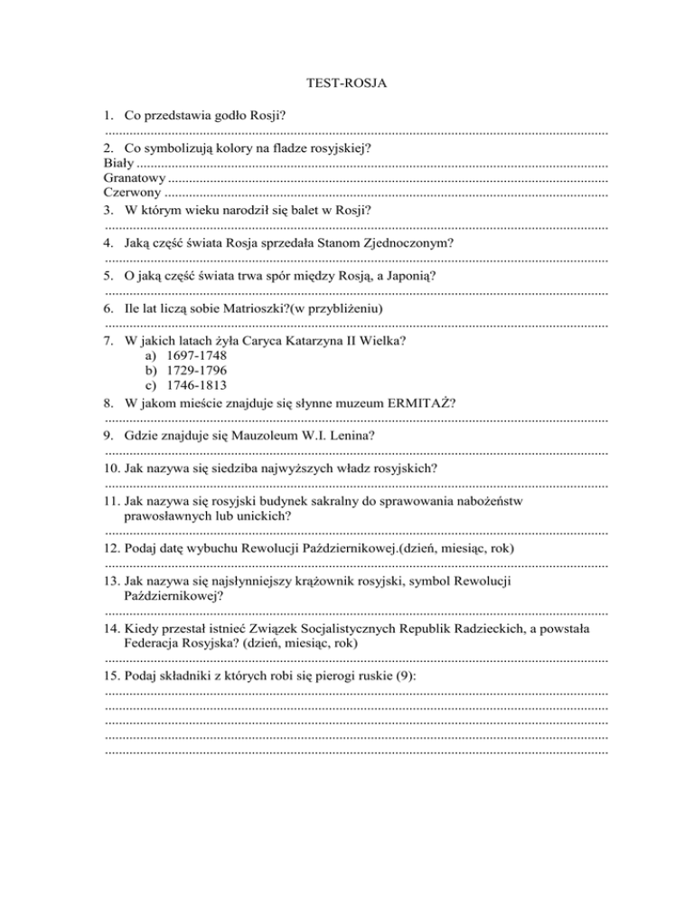 TEST-ROSJA 1. Co przedstawia godło Rosji? ................................................................................................................................................ 2. Co symbolizują kolory na fladze rosyjskiej? Biały ....................................................................................................................................... Granatowy .............................................................................................................................. Czerwony ............................................................................................................................... 3. W którym wieku narodził się balet w Rosji? ................................................................................................................................................ 4. Jaką część świata Rosja sprzedała Stanom Zjednoczonym? ................................................................................................................................................ 5. O jaką część świata trwa spór między Rosją, a Japonią? ................................................................................................................................................ 6. Ile lat liczą sobie Matrioszki?(w przybliŜeniu) ................................................................................................................................................ 7. W jakich latach Ŝyła Caryca Katarzyna II Wielka? a) 1697-1748 b) 1729-1796 c) 1746-1813 8. W jakom mieście znajduje się słynne muzeum ERMITAś? ................................................................................................................................................ 9. Gdzie znajduje się Mauzoleum W.I. Lenina? ................................................................................................................................................ 10. Jak nazywa się siedziba najwyŜszych władz rosyjskich? ................................................................................................................................................ 11. Jak nazywa się rosyjski budynek sakralny do sprawowania naboŜeństw prawosławnych lub unickich? ................................................................................................................................................ 12. Podaj datę wybuchu Rewolucji Październikowej.(dzień, miesiąc, rok) ................................................................................................................................................ 13. Jak nazywa się najsłynniejszy krąŜownik rosyjski, symbol Rewolucji Październikowej? ................................................................................................................................................ 14. Kiedy przestał istnieć Związek Socjalistycznych Republik Radzieckich, a powstała Federacja Rosyjska? (dzień, miesiąc, rok) ................................................................................................................................................ 15. Podaj składniki z których robi się pierogi ruskie (9): ................................................................................................................................................ ................................................................................................................................................ ................................................................................................................................................ ................................................................................................................................................ ................................................................................................................................................