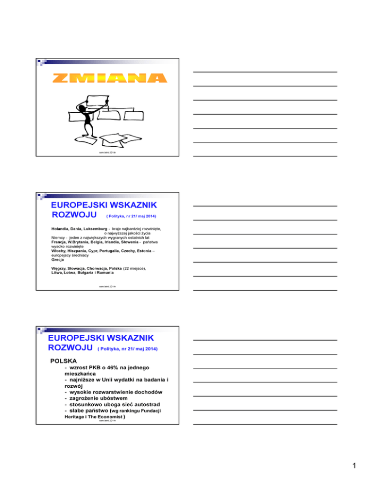 sem.letni 2014r EUROPEJSKI WSKAZNIK ROZWOJU ( Polityka, nr 21/ maj 2014) Holandia, Dania, Luksemburg - kraje najbardziej rozwinięte, o najwyższej jakości życia Niemcy - jeden z największych wygranych ostatnich lat Francja, W.Brytania, Belgia, Irlandia, Słowenia - państwa wysoko rozwinięte Włochy, Hiszpania, Cypr, Portugalia, Czechy, Estonia – europejscy średniacy Grecja Węgrzy, Słowacja, Chorwacja, Polska (22 miejsce), Litwa, Łotwa, Bułgaria i Rumunia sem.letni 2014r EUROPEJSKI WSKAZNIK ROZWOJU ( Polityka, nr 21/ maj 2014) POLSKA - wzrost PKB o 46% na jednego mieszkańca - najniższe w Unii wydatki na badania i rozwój - wysokie rozwarstwienie dochodów - zagrożenie ubóstwem - stosunkowo uboga sieć autostrad - słabe państwo (wg rankingu Fundacji Heritage i The Economist ) sem.letni 2014r 1 EUROPEJSKI WSKAZNIK ROZWOJU ( Polityka, nr 21/ maj 2014) Prognozy: - kraje Północy zachowają czołowe miejsca w rankingu - różnice między Południem i Wschodem mogą się coraz bardziej pogłębiać) - mamy szanse, aby awansować w okolice Hiszpanii ? sem.letni 2014r 7 S model McKinseya sem.letni 2014r Zarządzanie zmianą – między teorią a praktyką Etapy: 1. 2. 3. tworzenie impulsu do zmiany, czyli jasne określenie potrzeby zmiany; budowanie efektywnej wizji zmiany, której celem jest określenie ogólnego kierunku zmian, motywowanie do podejmowania zadania oraz przekazywanie jednego wspólnego kierunku dla wszystkich przedsiębiorstw uczestniczących w projekcie; skuteczne komunikowanie wizji zmiany; sem.letni 2014r 2 Zarządzanie zmianą – między teorią a praktyką Etapy: 4. usuwanie barier, uniemożliwiających osiągnięcie wizji; 5. kreowanie dotychczasowych osiągnięć, sygnalizujące, że wprowadzane zmiany przynoszą konkretne rezultaty; 6. instytucjonalizacja procesu wdrażania zmian oznaczająca trwałe zastąpienie dawnych metod działania nowymi oraz odzwierciedlenie nowego sposobu myślenia w kulturze organizacyjnej firm sem.letni 2014r Zarządzanie zmianą – między teorią a praktyką Do podstawowych utrudnień wprowadzania zmian zalicza się: ignorowanie rzeczywistości i tego, co się dzieje w otoczeniu (technokratyzm), brak sprawnego przywództwa i rozmów na temat przyczyn oraz celów zmiany, przejawianie przez jednostki oporu wobec zmiany, przeciążenie pracą, trudności realizacyjne, brak dobrego zarządzania projektem zmiany, brak środków bariery prawne . sem.letni 2014r Podejście Behawioralne Behawioryzm zakładał, że bardziej złożone zjawiska psychiczne, takie jak np. uczucia wyższe, czy struktury wpojone kulturowo, nie mają większego wpływu na działanie ludzi, lecz że ludzie podobnie jak wszystkie inne zwierzęta działają wg stosunkowo prostych zasad opierających na stałych, odruchowych lub wyuczonych reakcjach na bodźce. Według tego poglądu, większość zdrowych osobników ludzkich, niezależnie od ich "zawartości mózgu" będzie w tych samych warunkach reagować podobnie na podobne zestawy bodźców sem.letni 2014r 3 Podejście poznawcze Opiera się ono na przekonaniu, że zachowanie człowieka jest kontrolowane przez czynniki „wewnętrzne” takie jak: indywidualne sądy, złożenia, teorię i mapy poznawcze dotyczące sytuacji. A zatem, aby zmienić zachowanie, trzeba najpierw zmienić wewnętrzne „zaprogramowanie”. sem.letni 2014r Podejście humanistyczne: Stworzenie odpowiednich warunków sprawia, że istoty ludzkie stają się w sposób naturalny zaangażowane we wzrost i rozwój, których granic nie sposób określić. W tej sytuacji do zadań osoby kierującej należy stworzenie odpowiednich warunków do rozwoju. sem.letni 2014r Rodzaje zmian w praktyce Reorganizacja – proces łagodnych, stopniowych zmian w organizacji, nie ingerujący w strukturę jej zasobów Restrukturyzacja – zmiana ingerująca w strukturę zasobów organizacji Reengineering – dramatyczne, radykalne i fundamentalne zburzenie starych struktur i procesów w organizacji i zbudowanie ich od nowa, przy użyciu najnowszych zdobyczy techniki i technologii sem.letni 2014r 4 ZMIANA wg. Kurta Lewina ODMROŻENIE ZMIANA ZAMROŻENIE sem.letni 2014r TRÓJFAZOWY MODEL PROCESU ZMIAN (SPOŁECZNYCH) K. LEWINA ROZMROŻENIE • obecne rozwiązania już nie przynoszą spodziewanych efektów • jeżeli nie nauczymy się czegoś nowego, doznamy porażki ZMIANA • bezpieczne warunki do eksperymentowania • perspektywy umożliwiające szkolenie i praktykowanie • wsparcie i zachęta ZAMROŻENIE • wprowadzenie mechanizmów wspierających • wynagradzanie • ocena efektywności • szkolenie sem.letni 2014r Uznanie potrzeby zmiany Ustalenie celów zmiany Diagnoza istotnych zmiennych Opracowanie projektu zmiany Przygotowanie do wdrażania zmian Wdrażanie Kontrola i ocena efektów Etapy procesu zarządzania zmianą (R. Griffin) sem.letni 2014r 5 MODEL ZMIANY GLAICHERA C = (D + V + P) > X ENERGIA KIERUNEK KONSENSUS SPOŁECZNY sem.letni 2014r Źródła oporów wobec zmian (I) 1. Tkwiące w osobowości człowieka: lęk przed nowym, nieznanym (niechęć do ryzyka, inicjatywy, brak ambicji), brak wiary w możliwość sprostania nowej sytuacji, konieczność zmiany wiedzy, umiejętności, postaw, nawyki, rutyna („przyzwyczajenie jest drugą naturą człowieka” ) negatywne doświadczenia z wcześniejszej zmiany sem.letni 2014r Źródła oporów wobec zmian (II) 2. Wynikające z oddziaływania grupy społecznej: naciski grupy formalnej lub nieformalnej (naruszenie interesów), sprzeczność zmian z obowiązującymi wartościami i normami (kulturą organizacyjną), brak zaufania do kierownictwa. sem.letni 2014r 6 Źródła oporów wobec zmian (III) 3. Tkwiące w samej istocie zmiany: obawa przed obniżeniem dotychczasowego poziomu zaspokojenia potrzeb, obawa przed utratą twarzy, negatywna ocena nowego rozwiązania - brak potrzeby zmiany lub błędy w projektowaniu. sem.letni 2014r Źródła oporów wobec zmian (IV) 4. Uwarunkowane organizacją pr