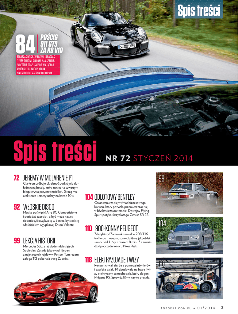 Spis treści 84 POŚCIG 911 GT3 ZA R8 V10 STRASZĄC DZIKĄ ZWIERZYNĘ I ZNACZĄC TEREN DŁUGIMI ŚLADAMI NA ASFALCIE, WRESZCIE DOSZLIŚMY DO WIĄŻĄCEG0 WNIOSKU. JUŻ WIEMY, KTÓRA Z NIEMIECKICH MASZYN JEST LEPSZA. Spis treści NR 72 STYCZEŃ 2014 72 JEREMY W MCLARENIE P1 Clarkson próbuje okiełznać podwójnie doładowaną bestię, która nawet na czwartym biegu zrywa przyczepność kół. Grożą mu atak serca i cztery udary na każde 10 s. 92 WŁOSKIE DISCO Musisz poświęcić Alfę 8C Competizione i posiadać sześcio-, a być może nawet siedmiocyfrową kwotę w banku, by stać się właścicielem wyjątkowej Disco Volante. 99 LEKCJA HISTORII Mercedes SLC z lat siedemdziesiątych, Sobiesław Zasada jako rywal i jeden z najstarszych rajdów w Polsce. Tym razem załoga TG pokonała trasę Żubrów. 99 104 ODLOTOWY BENTLEY Ceran zanurza się w świat biznesowego luksusu, który pozwala przemieszczać się w błyskawicznym tempie. Dostojny Flying Spur spotyka skrzydlatego Cirrusa SR 22. 110 Zdążyliśmy! 900-KONNY PEUGEOT Zanim ekstremalne 208 T16 104 trafiło do muzeum, sprawdziliśmy, jak jeździ samochód, który z czasem 8 min 13 s zmiażdżył poprzedni rekord Pikes Peak. 118 ELEKTRYZUJĄCE TWIZY Renault chwali się, że z pomocą inżynierów 110 i części z działu F1 zbudowało na bazie Twizy elektryczny elektry samochodzik, który dogoni Mégane R RS. Sprawdziliśmy, czy to prawda. TO P G E A R .CO M . P L 01/2014 3 Spis treści Gwiazdy numeru Ford Mustang str. 18 CLARKSON HAMMOND Richard o motocyklach, które wykraczają poza społeczne normy i denerwują ludzi. str. 12 Jeremy podejrzewa, że Hammond jest czarnoksiężnikiem. str. 10 MAY Mini str. 28 BMW i3 James twierdzi, że VW będzie wkrótce zamiast aut produkował kiełbasę. str. 14 str. 50 Dacia Duster 1.2 str. 52 Mercedes E 400 Coupé str.54 Porsche Cayenne Turbo S str. 56 BMW X3 xDrive35d str. 58 Metal 18 FORD MUSTANG Pierwsza Planeta Jazda 36 SZKOŁA MARZEŃ Nabór do nowej szkoły F1 już się zaczął. Dyrektorem UTC Silverstone jest Adrian Newey. 41 CHEVY ASTRO III Nawet gdyby pokazano go dziś, budziłby respekt, a przecież debiutował 44 lata temu. 42 Zastanawia ANITA WŁODARCZYK się, czy pędząc autem Nürburgring w 7 min 8 s, i inne gorące nowości ze Wschodu. Garaż TopGear 4 01/2014 TO P G E A R .CO M . P L Porsche 911 GT3 Testujemy: Ilustrowana historia słynnego aktora i znakomitego kierowcy w wykonaniu Barry’ego Feinsteina. Właśnie ruszyła produkcja małego SUV-a Porsche. Będzie konkurował z Q5, X3 oraz Evoque. 30 SALON W TOKIO GT-R Nismo, który okrąża McLaren P1 str. 72 34 STEVE MCQUEEN W wersji R ma 550 KM i uchodzi za najlepiej prowadzący się wóz Jaguara. 26 PORSCHE MACAN str. 60 TopGear Najnowsze wcielenie kultowego muscle cara wreszcie trafi do sprzedaży w Europie. 24 F-TYPE COUPÉ Nissan NV200 NYC Taxi rajdowym między drzewami, byłaby taka odważna, jak na co dzień. BMW i3 Dacia Duster 1.2 Škoda Yeti 1.2 Mercedes E 400 Coupé Dacia Logan 1.2 Porsche Cayenne Turbo S BMW X3 xDrive35d Audi S3 Sedan 1.8 TFSI Seat Leon FR 1.8 TSI Nissan NV200 NYC Taxi Citroën C4 Picasso 1.6 Seat Alhambra 2.0 TDI Audi A3 Cabrio 1.8 TFSI GMC TYPHOON LOTUS ELAN VW GOLF CUP EDITION vs VW GOLF GTI ŠKODA CITIGO SPORT PORSCHE CAYMAN S str. 84 50 52 53 54 55 56 58 59 59 60 62 62 63 124 126 128 130 131 Audi R8 V10 str. 84 Alfa Romeo Disco Volante str. 92 Bentley Flying Spur str. 104 Peugeot 208 T16 Pikes Peak str. 110 Renault Twizy F1 str. 118 GMC Typhoon str. 124 Lotus Elan str. 126 VW Golf GTI str. 128 Porsche Cayman S str. 131