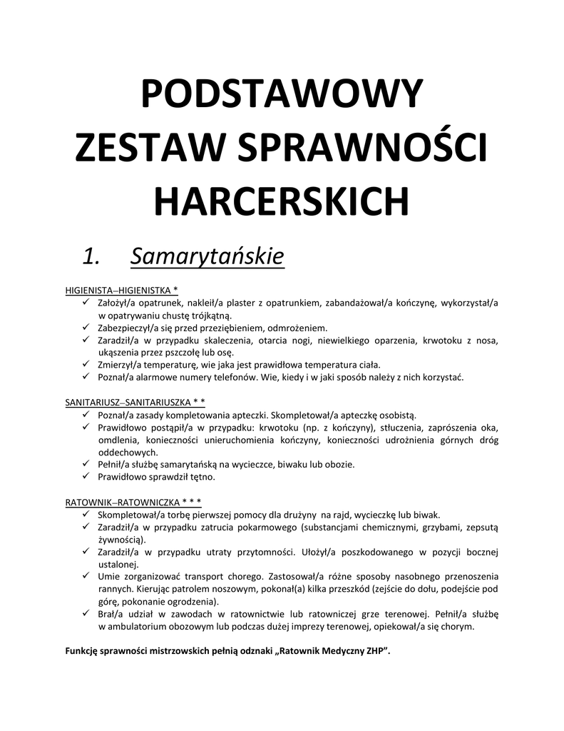 PODSTAWOWY ZESTAW SPRAWNOŚCI HARCERSKICH 1. Samarytańskie HIGIENISTA HIGIENISTKA * Założył/a opatrunek, nakleił/a plaster z opatrunkiem, zabandażował/a kończynę, wykorzystał/a w opatrywaniu chustę trójkątną. Zabezpieczył/a się przed przeziębieniem, odmrożeniem. Zaradził/a w przypadku skaleczenia, otarcia nogi, niewielkiego oparzenia, krwotoku z nosa, ukąszenia przez pszczołę lub osę. Zmierzył/a temperaturę, wie jaka jest prawidłowa temperatura ciała. Poznał/a alarmowe numery telefonów. Wie, kiedy i w jaki sposób należy z nich korzystać. SANITARIUSZ SANITARIUSZKA * * Poznał/a zasady kompletowania apteczki. Skompletował/a apteczkę osobistą. Prawidłowo postąpił/a w przypadku: krwotoku (np. z kończyny), stłuczenia, zaprószenia oka, omdlenia, konieczności unieruchomienia kończyny, konieczności udrożnienia górnych dróg oddechowych. Pełnił/a służbę samarytańską na wycieczce, biwaku lub obozie. Prawidłowo sprawdził tętno. RATOWNIK RATOWNICZKA * * * Skompletował/a torbę pierwszej pomocy dla drużyny na rajd, wycieczkę lub biwak. Zaradził/a w przypadku zatrucia pokarmowego (substancjami chemicznymi, grzybami, zepsutą żywnością). Zaradził/a w przypadku utraty przytomności. Ułożył/a poszkodowanego w pozycji bocznej ustalonej. Umie zorganizować transport chorego. Zastosował/a różne sposoby nasobnego przenoszenia rannych. Kierując patrolem noszowym, pokonał(a) kilka przeszkód (zejście do dołu, podejście pod górę, pokonanie ogrodzenia). Brał/a udział w zawodach w ratownictwie lub ratowniczej grze terenowej. Pełnił/a służbę w ambulatorium obozowym lub podczas dużej imprezy terenowej, opiekował/a się chorym. Funkcję sprawności mistrzowskich pełnią odznaki „Ratownik Medyczny ZHP”. 2. Przyrodnicze PRZYRODNIK PRZYRODNICZKA * Rozpoznał/a po sylwetkach i liściach dziesięć drzew (np. dąb, brzozę, klon, leszczynę, wierzbę, topolę, lipę, sosnę, świerk, jodłę, modrzew). Rozpoznał/a na rysunku lub zdjęciu po pięć gatunków roślin i zwierząt chronionych w Polsce. Uczestniczył/a w wycieczce do lasu, ułożył/a i przedstawił/a w zastępie pięć zasad zachowania się w lesie. Samodzielnie lub z zastępem zasadził/a drzewko w pobliżu swojego domu, na działce lub przy szkole. PRZYJACIEL PRZYRODY * * Wskazał/a na mapie Polski parki narodowe oraz znajdujące się w okolicy (np. w gminie lub powiecie) rezerwaty przyrody, parki krajobrazowe i wybrane pomniki przyrody. Wyjaśnił/a cele, dla których je utworzono. Uczestniczył/a w wycieczce do rezerwatu przyrody lub parku narodowego. Zachowywał/a się zgodnie z obowiązującym tam regulaminem. Brał/a udział w pracy na rzecz środowiska naturalnego, np. w parku, na szlaku turystycznym, podczas imprezy ekologicznej. W swoim domu oszczędza wodę i energię elektryczną, dba o wykorzystanie surowców wtórnych. ZNAWCA PRZYRODY * * * Skompletował/a biblioteczkę (książki, artykuły, foldery, adresy stron internetowych) o tematyce ekologicznej. Poznał/a zasady ekologicznego obozowania. Zastosował/a je w praktyce. Wziął/ęła udział w akcji na rzecz ratowania lub ochrony środowiska naturalnego. Przygotował/a i przeprowadził/a zbiórkę na temat znaczenia przyrody dla zdrowia człowieka oraz o potrzebie jej ochrony przed zagrożeniami cywilizacji. Zapoznał/a się z celami i działaniami kilku wybranych organizacji ekologicznych. EKOLOG (sprawność mistrzowska) Poznał/a systematykę roślin i zwierząt. Poznał/a rośliny i zwierzęta chronione w Polsce. Przedstawił/a w interesującej formie bogactwo polskich lasów, znaczenie lasów dla przyszłości człowieka na Ziemi. Wskazał/a zagrożenia występujące w polskich lasach i dotyczące drzew, ptaków i zwierząt. Poznał/a zasady ekologicznego obozowania. Zastosował/a je w praktyce. Wyznaczył/a sobie dodatkowe zadania mistrzowskie. 3. Puszczańskie ROBINSON * * Przeprowadził/a w pobliżu obozu w samotności kilkugodzinną obserwację życia lasu o wschodzie słońca. W dowolnej formie udokumentował/a swoje spostrzeżenia (zauważone zwierzęta, ich tropy, zjawiska przyrody, znalezione rośliny chronione, jadalne itp.), zaprezentował/a je na zbiórce zastępu. Przygotował/a dla zastępu posiłek, korzystając z zebranych owoców lasu. Wraz z kolegą/koleżanką biwakował/a w pobliżu obozu przez 24 godziny. LEŚNY CZŁOWIEK * * * Odbył/a samotną wędrówkę po lesie (od świtu do zmroku), żywiąc się owocami lasu, odnalazł/a wyznaczone przez drużynowego miejsce bez posługiwania się mapą, kierując się tylko znakami przyrody. Korzystając z samotności przemyślał/a swoje dotychczasowe życie harcerskie. Powrócił/a niepostrzeżenie do ogniska i opowiedział/a gawędę o życiu lasu na podstawie wyników obserwacji i przemyśleń, jakie miał/a podczas wędrówki. W czasie tej wędrówki znalazł/a ciekawe miejsce, by pokazać je potem harcerzom/harcerkom z drużyny. TRZY PIÓRA (sprawność mistrzowska) Przeszedł/przeszła pomyślnie trzy próby – milczenia, głodu i samotności – przez kolejne trzy doby: - w czasie pierwszej doby powstrzymał/a się od spożywania jakichkolwiek pokarmów i napojów (z wyjątkiem czystej wody), uczestnicząc we wszystkich zajęciach obozowych, - w czasie drugiej próby zachował/a całkowite milczenie, - trzecią dobę spędził/a w lesie nie spostrzeżony/na przez ludzi, żywiąc się pokarmem leśnym. 4. Kucharskie KUCHCIK * Przygotował/a w terenie posiłek dla zastępu, korzystając z kuchni polowej lub kuchenki turystycznej. Zadbał/a o estetyczny wygląd polowego „stołu”. Przestrzegał/a zasad higieny przy sporządzaniu posiłków i zapoznał/a z nimi zastęp. Przygotował/a śniadanie lub kolację dla domowników. Przygotował/a podwieczorek według własnego pomysłu. KUCHARZ * * Prawidłowo posługiwał/a się sprzętem kuchennym (nożami, tłuczkami, maszynką do mielenia, garnkami i patelniami różnej wielkośc