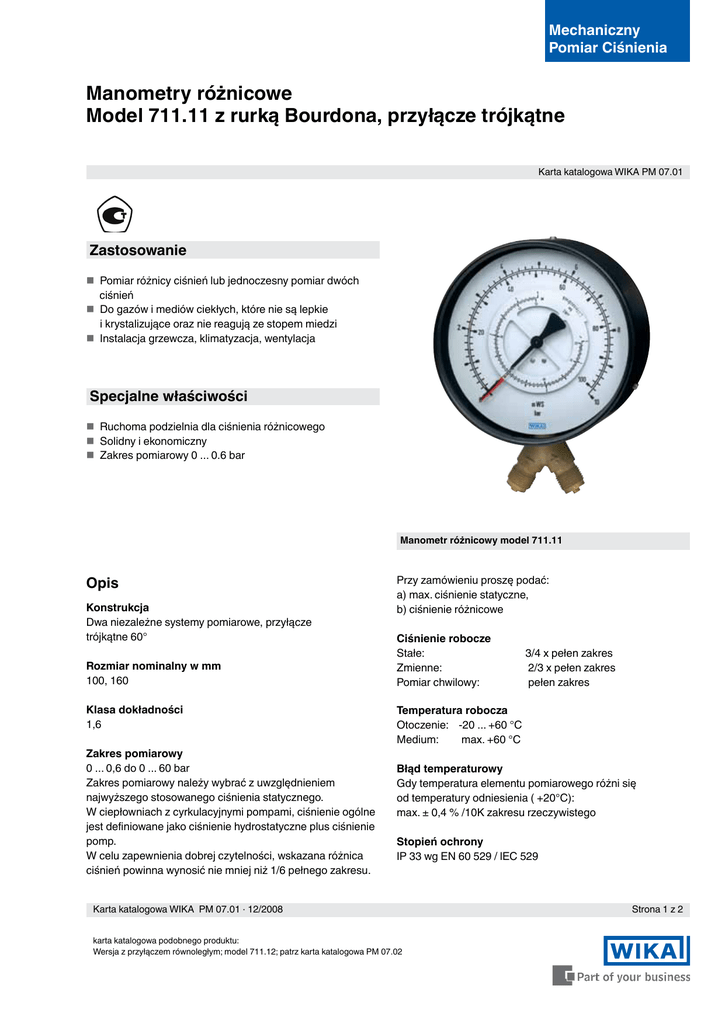 Mechaniczny Pomiar Ciśnienia Manometry różnicowe Model 711.11 z rurką Bourdona, przyłącze trójkątne Karta katalogowa WIKA PM 07.01 Zastosowanie Pomiar różnicy ciśnień lub jednoczesny pomiar dwóch ciśnień Do gazów i mediów ciekłych, które nie są lepkie i krystalizujące oraz nie reagują ze stopem miedzi Instalacja grzewcza, klimatyzacja, wentylacja Specjalne właściwości Ruchoma podzielnia dla ciśnienia różnicowego Solidny i ekonomiczny Zakres pomiarowy 0 ... 0.6 bar Manometr różnicowy model 711.11 Opis Konstrukcja Dwa niezależne systemy pomiarowe, przyłącze trójkątne 60° Rozmiar nominalny w mm 100, 160 Klasa dokładności 1,6 Zakres pomiarowy 0 ... 0,6 do 0 ... 60 bar Zakres pomiarowy należy wybrać z uwzględnieniem najwyższego stosowanego ciśnienia statycznego. W ciepłowniach z cyrkulacyjnymi pompami, ciśnienie ogólne jest definiowane jako ciśnienie hydrostatyczne plus ciśnienie pomp. W celu zapewnienia dobrej czytelności, wskazana różnica ciśnień powinna wynosić nie mniej niż 1/6 pełnego zakresu. Przy zamówieniu proszę podać: a) max. ciśnienie statyczne, b) ciśnienie różnicowe Ciśnienie robocze Stałe: 3/4 x pełen zakres Zmienne: 2/3 x pełen zakres Pomiar chwilowy: pełen zakres Temperatura robocza Otoczenie: -20 ... +60 °C Medium: max. +60 °C Błąd temperaturowy Gdy temperatura elementu pomiarowego różni się od temperatury odniesienia ( +20°C): max. ± 0,4 % /10K zakresu rzeczywistego Stopień ochrony IP 33 wg EN 60 529 / lEC 529 Karta katalogowa WIKA PM 07.01 · 12/2008 karta katalogowa podobnego produktu: Wersja z przyłączem równoległym; model 711.12; patrz karta katalogowa PM 07.02 Strona 1 z 2 Wersja standardowa Opcjonalnie Przyłącze procesowe Stop miedzi, 2 x gwint zewnętrzny G ½ B, z oznaczeniem j i i Inne przyłącza procesowe Wersja z podwójną wskazówką Kołnierz przedni lub tylny Urządzenie kontaktowe (karta katalogowa AE 08.01) Element pomiarowy Stop miedzi, sprężyna typu C Wymiary w mm Mechanizm Stop miedzi, części zużywalne z argentanu Wersja standardowa 1035 185 Podzielnia Białe aluminium z czarną skalą podwójna skala w (mWS/bar) Wskazówka 1 czarna wskazówka 1 biała wskazówka tarczowa z zakresem ± 50 % oraz zakresu ciśnienia różnicowego Obudowa Stal malowana na czarno Szyba Szkło przemysłowe Pokrywa Pierścień zamykający nasuwny, stal malowana na czarno NS Rozmiar w mm a b D G h ± 1 Waga w kg 100 160 31,5 31,5 82 86,5 101 160 G ½ B G ½ B 91 120 1,00 1,60 Przyłącze procesowe wg EN 837-1 / 7.3 Specyfikacje i wymiary podane w niniejszej karcie przedstawiają stan konstrukcyjny aktualny w momencie wydruku. Istnieje możliwość wprowadzenia modyfikacji i zmian specyfikacji materiałowej bez wcześniejszego powiadomienia. Strona 2 z 2 Karta katalogowa WIKA PM 07.01 · 12/2008 WIKA Polska spółka z ograniczoną odpowiedzialnością sp. k. Ul. Łęgska 29/35, 87-800 Włocławek Tel.: (+48) 54 23 01 100 Fax: (+48) 54 23 01 101 E-mail: [email protected] www.wikapolska.pl 12/2008 PL based on 12/2008 GB Dane do zamówienia Model / Rozmiar nominalny / Zakres pomiarowy / Rozmiar przyłącza / Położenie przyłącza / Opcjonalnie