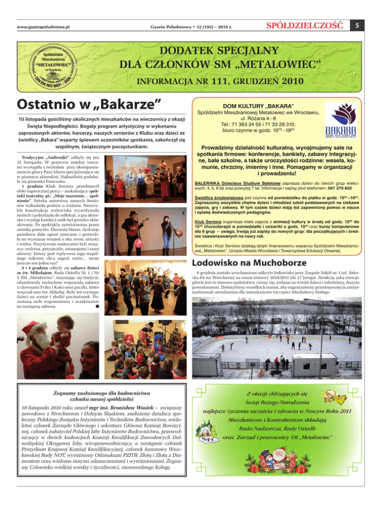 www.gazetapoludniowa.pl Gazeta Południowa • 12 (192) – 2010 r. sPÓŁDZielcZoŚĆ 5 DoDateK sPecJalNY Dla cZŁoNKÓw sm „metalowiec” iNFoRmacJa iNFoRmacJa NR NR 111 110,, GRUDZieŃ listoPaD 2010 2010 Ostatnio w „Bakarze” 10 listopada gościliśmy okolicznych mieszkańców na wieczornicy z okazji Święta Niepodległości. Bogaty program artystyczny w wykonaniu zaproszonych aktorów, harcerzy, naszych seniorów z Klubu oraz dzieci ze świetlicy „Bakara” wsparty śpiewem uczestników spotkania, zakończył się wspólnym, świątecznym poczęstunkiem. tradycyjne „andrzejki” odbyły się już 25 listopada. W przerwie między tańcami wystąpiła z recitalem przy akompaniamencie gitary Pani Marta specjalizująca się w piosence aktorskiej. Najbardziej podobała się piosenka francuska. 1 grudnia Klub Seniora przedstawił efekt tegorocznej pracy – zaskakujący spektakl teatralny pt.: „moje marzenie… spełnienie”. Sztuka autorstwa samych Seniorów wzbudziła podziw u widzów. Niezwykła konstrukcja widowiska wywoływała śmiech i pobudzała do refleksji, a gra aktorska i występ każdej z osób był gromko oklaskiwany. Po spektaklu zainicjowana przez autorkę pomysłu, Eleonorę Maras, dyskusja panelowa dała upust emocjom i pozwoliła na wymianę wrażeń z obu stron: artysty i widza. Pozytywnie zaskoczeni byli wszyscy: rodzina, przyjaciele, nieznajomi i sami aktorzy, którzy pod wpływem tego wspólnego sukcesu chcą zagrać znów… może jeszcze nie jeden raz? 3 i 4 grudnia odbyły się zabawy dzieci ze św. mikołajem. Rada Osiedla Nr 1 i Nr 2 SM „Metalowiec”, trzymając się tradycji, ufundowały maluchom wspaniałą zabawę z clownami Friko i Koko oraz paczki, które wręczał sam św. Mikołaj. Były też występy dzieci na scenie i słodki poczęstunek. Pozostaną miłe wspomnienia i oczekiwanie na następną zabawę. n Żegnamy zasłużonego dla budownictwa członka naszej spółdzielni 10 listopada 2010 roku zmarł mgr inż. Bronisław Wosiek – związany zawodowo z Wrocławiem i Dolnym Śląskiem, zasłużony działacz społeczny Polskiego Związku Inżynierów i Techników Budownictwa, wieloletni członek Zarządu Głównego i sekretarz Głównej Komisji Rewizyjnej, członek założyciel Polskiej Izby Inżynierów Budownictwa, przewodniczący w dwóch kadencjach Komisji Kwalifikacji Zawodowych Dolnośląskiej Okręgowej Izby, wiceprzewodniczący, a następnie członek Prezydium Krajowej Komisji Kwalifikacyjnej, członek honorowy Wrocławskiej Rady NOT, wyróżniony Odznakami PZITB: Złotą i Złotą z Diamentem oraz wieloma innymi odznaczeniami i wyróżnieniami. Żegnamy Człowieka wielkiej wiedzy i życzliwości, niezawodnego Kolegę. DOM KULTURY „BAKARA” Spółdzielni Mieszkaniowej Metalowiec we Wrocławiu, ul. Różana 4–6 Tel.: 71 363 24 55 i 71 33 29 310; biuro czynne w godz. 1500–1900 Prowadzimy działalność kulturalną, wynajmujemy sale na spotkania firmowe: konferencje, bankiety, zabawy integracyjne, bale szkolne, a także uroczystości rodzinne: wesela, komunie, chrzciny, imieniny i inne. Pomagamy w organizacji i prowadzeniu! BALERINKA Dziecięce Studium Baletowe zaprasza dzieci do dwóch grup wiekowych: 4, 5, 6 lat oraz powyżej 7 lat. Informacje i zapisy pod telefonem: 501 370 602 Świetlica środowiskowa jest czynna od poniedziałku do piątku w godz. 1500–1900. Zapraszamy wszystkie chętne dzieci i młodzież szkół podstawowych na ciekawe zajęcia, gry i zabawy. W tym czasie dzieci mają też zapewnioną pomoc w nauce i opiekę doświadczonych pedagogów. Klub Seniora organizuje stałe zajęcia z animacji kultury w środy od godz. 1200 do 1500 choreoterapii w poniedziałki i czwartki o godz. 1000 oraz kursy komputerowe dla 8 grup – uwaga, trwają już zapisy do nowych grup: dla początkujących i średnio zaawansowanych na nowy rok. Świetlica i Klub Seniora działają dzięki finansowemu wsparciu Spółdzielni Mieszkaniowej „Metalowiec”, Urzędu Miasta Wrocławia i Towarzystwa Edukacji Otwartej. Lodowisko na Muchoborze 6 grudnia zostało uruchomione odkryte lodowisko przy Zespole Szkół nr 3 (ul. Szkocka 64 we Wrocławiu) na sezon zimowy 2010/2011 (do 27 lutego). Atrakcja, jaką niewątpliwie jest to zimowe szaleństwo, cieszy się, zwłaszcza wśród dzieci i młodzieży, dużym powodzeniem. Dołożyliśmy wszelkich starań, aby organizatorzy przedsięwzięcia zminimalizowali utrudnienia dla mieszkańców tej części Muchoboru Małego. Z okazji zbliżających się Świąt Bożego Narodzenia najlepsze życzenia szczęścia i zdrowia w Nowym Roku 2011 Mieszkańcom i Kontrahentom składają Rada Nadzorcza, Rady Osiedli oraz Zarząd i pracownicy SM „Metalowiec” sm „Metalowiec” Gazeta Południowa • 12 (192) – 2010 r. Nasze potyczki (12) Perfidia czy głupota? Jerzy Kruk To prowokacyjne pytanie zadaję już na wstępie nie bez powodu – od blisko dziesięciu lat posłowie „pochylają się” bowiem systematycznie nad prawem dotyczącym spółdzielni mieszkaniowych, nowelizują je ustawicznie i zmieniają, zmiany te jednak niestety są zawsze zmianami na gorsze. Niezależnie od haseł jakimi posługują się dwie główne polityczne partie – czy Polska jest najważniejsza, czy najważniejszy jest człowiek – w tym psuciu spółdzielczego prawa idą ramię w ramię i są zadziwiająco jednomyślne. Los członków spółdzielni wcale ich nie obchodzi, ignorują też ponad stuletnią tradycję spółdzielczości i pod płaszczykiem walki ze „spuścizną po komunizmie” (co jest nieprawdą, o czym wie każdy, kto uczył się historii) demontują funkcjonujący dotąd sprawnie system. Czy zatem to tylko niewiedza, czy może jednak polityczna zła wola? Przykłady negatywnych skutków wprowadzonych ustawowo regulacji można by mnożyć. Poniżej wskażę tylko kilka z nich – szczególnie dojmujących dla członków. Wyodrębnianie własności lokali Zamiana spółdzielczego lokatorskiego prawa na w
