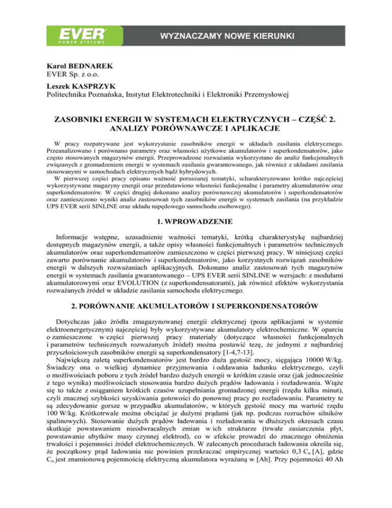 Karol BEDNAREK EVER Sp. z o.o. Leszek KASPRZYK Politechnika Poznańska, Instytut Elektrotechniki i Elektroniki Przemysłowej ZASOBNIKI ENERGII W SYSTEMACH ELEKTRYCZNYCH – CZĘŚĆ 2. ANALIZY PORÓWNAWCZE I APLIKACJE W pracy rozpatrywane jest wykorzystanie zasobników energii w układach zasilania elektrycznego. Przeanalizowano i porównano parametry oraz własności użytkowe akumulatorów i superkondensatorów, jako często stosowanych magazynów energii. Przeprowadzone rozważania wykorzystano do analiz funkcjonalnych związanych z gromadzeniem energii w systemach zasilania gwarantowanego, jak również z układami zasilania stosowanymi w samochodach elektrycznych bądź hybrydowych. W pierwszej części pracy opisano ważność poruszanej tematyki, scharakteryzowano krótko najczęściej wykorzystywane magazyny energii oraz przedstawiono własności funkcjonalne i parametry akumulatorów oraz superkondensatorów. W części drugiej dokonano analizy porównawczej akumulatorów i superkondensatorów oraz zamieszczono wyniki analiz zastosowań tych zasobników energii w systemach zasilania (na przykładzie UPS EVER serii SINLINE oraz układu napędowego samochodu osobowego). 1. WPROWADZENIE Informacje wstępne, uzasadnienie ważności tematyki, krótką charakterystykę najbardziej dostępnych magazynów energii, a także opisy własności funkcjonalnych i parametrów technicznych akumulatorów oraz superkondensatorów zamieszczono w części pierwszej pracy. W niniejszej części zawarto porównanie akumulatorów i superkondensatorów, jako korzystnych rozwiązań zasobników energii w dalszych rozważaniach aplikacyjnych. Dokonano analiz zastosowań tych magazynów energii w systemach zasilania gwarantowanego – UPS EVER serii SINLINE w wersjach: z modułami akumulatorowymi oraz EVOLUTION (z superkondensatorami), jak również efektów wykorzystania rozważanych źródeł w układzie zasilania samochodu elektrycznego. 2. PORÓWNANIE AKUMULATORÓW I SUPERKONDENSATORÓW Dotychczas jako źródła zmagazynowanej energii elektrycznej (poza aplikacjami w systemie elektroenergetycznym) najczęściej były wykorzystywane akumulatory elektrochemiczne. W oparciu o zamieszczone w części pierwszej pracy materiały (dotyczące własności funkcjonalnych i parametrów technicznych rozważanych źródeł) można postawić tezę, że jednymi z najbardziej przyszłościowych zasobników energii są superkondensatory [1-4,7-13]. Największą zaletą superkondensatorów jest bardzo duża gęstość mocy, sięgająca 10000 W/kg. Świadczy ona o wielkiej dynamice przyjmowania i oddawania ładunku elektrycznego, czyli o możliwościach poboru z tych źródeł bardzo dużych energii w krótkim czasie oraz (jak jednocześnie z tego wynika) możliwościach stosowania bardzo dużych prądów ładowania i rozładowania. Wiąże się to także z osiąganiem krótkich czasów uzupełniania gromadzonej energii (rzędu kilku minut), czyli znacznej szybkości uzyskiwania gotowości do ponownej pracy po rozładowaniu. Parametry te są zdecydowanie gorsze w przypadku akumulatorów, w których gęstość mocy ma wartość rzędu 100 W/kg. Krótkotrwale można obciążać je dużymi prądami (jak np. podczas rozruchów silników spalinowych). Stosowanie dużych prądów ładowania i rozładowania w dłuższych okresach czasu skutkuje powstawaniem nieodwracalnych zmian w ich strukturze (trwałe zasiarczenia płyt, powstawanie ubytków masy czynnej elektrod), co w efekcie prowadzi do znacznego obniżenia trwałości i pojemności źródeł elektrochemicznych. W zalecanych procedurach ładowania określa się, że początkowy prąd ładowania nie powinien przekraczać empirycznej wartości 0,3 Cn [A], gdzie Cn jest znamionową pojemnością elektryczną akumulatora wyrażaną w [Ah]. Przy pojemności 40 Ah prąd ten wynosi 12 A, natomiast w superkondensatorach można stosować prądy o wartościach rzędu kA. Najbardziej zalecaną wartością prądu ładowania w akumulatorach jest 0,1 Cn [A], co dla wspomnianego źródła elektrochemicznego daje wartość 4 A. W przypadku akumulatorów stosowanych w zasilaczach awaryjnych UPS prądy te mają jeszcze mniejsze wartości, ponieważ są to rozwiązania o niższych pojemnościach. Z małymi wartościami prądów ładowania powiązane są jednoznacznie długie czasy ładowania (uzupełniania energii) źródeł elektrochemicznych, wahające się w granicach od kilku do kilkunastu godzin (w zależności od stopnia rozładowania akumulatroa). Należy również nadmienić, że z akumulatorów nie można pobierać całkowitej zgromadzonej energii elektrycznej. Zbyt głębokie rozładowania prowadzą w nich do zmniejszenia trwałości (żywotności) i pojemności elektrycznej. Ograniczeń takich nie mają superkondensatory – głębokość rozładowania w ich przypadku wynika wyłącznie z progowej wartości napięcia (obniżającego się podczas rozładowania), przy którym mogą być jeszcze zasilane odbiorniki. Trwałość akumulatorów (nawet w warunkach użytkowania zgodnych z zaleceniami) jest zdecydowanie mniejsza niż superkondensatorów. Wyraża się ją w ilości cykli ładowania-rozładowania (w superkondensatorach jest ponad 1000 razy większa) lub w latach eksploatacji (akumulatory mają tę liczbę kilkakrotnie mniejszą). Korzystniejszym parametrem w akumulatorach niż w superkondensatorach jest gęstość energii. We wtórnych ogniwach elektrochemicznych jest ona na poziomie 100 Wh/kg, a w ultrakondensatorach jest około dziesięciokrotnie mniejsza. Jest to bardzo istotny parametr, ponieważ świadczy o zdolności do gromadzenia energii, a w układach zasilania ważna jest duża zasobność źródła. Superkondensatory mają wyższe sprawności niż ogniwa elektrochemiczne. Osiągają one wartości ok. 95%, natomiast w akumulatorach rzędu 70%. Wynika to między innymi z mniejszych rezystancji wewnętrznych (nawet poniżej 0,3 m, a w akumulatorach kształtują si
