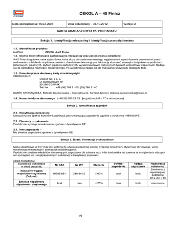 CEKOL A – 45 Finisz Data sporządzenia: 15.03.2008 Data aktualizacji: - 05.10.2012 Wersja: 2 KARTA CHARAKTERYSTYKI PREPARATU Sekcja 1. Identyfikacja mieszaniny i identyfikacja przedsiębiorstwa 1.1. Identyfikator produktu NAZWA: CEKOL A-45 Finisz 1.2. Istotne zidentyfikowane zastosowania mieszaniny oraz zastosowania odradzane A-45 Finisz to gotowa masa szpachlowa, która służy do cienkowarstwowego wygładzania i szpachlowania powierzchni przed malowaniem a także do uzyskania powłok o charakterze dekoracyjnym. Można ją stosować wewnątrz budynków na podłożach betonowych, gipsowych, płytach gipsowo-kartonowych, wysezonowanych tradycyjnych tynkach cementowo-wapiennych. Nadaje się do nakładania ręcznego i maszynowego. Po wyschnięciu nadaje się do malowania wszystkimi rodzajami farb. 1.3. Dane dotyczące dostawcy karty charakterystyki PRODUCENT: CEDAT Sp. z o. o. ul. Budowlanych 19` 80-298 GDAŃSK Tel/ fax +48 (58) 768 21 00/ (58) 768 21 40 KARTĘ SPORZĄDZIŁA: Elżbieta Kaczorowska – Specjalista ds. Kontroli Jakości, [email protected] 1.4. Numer telefonu alarmowego (+48 58) 768 21 13 [w godzinach 8 – 17 w dni robocze] Sekcja 2. Identyfikacja zagrożeń 2.1. Klasyfikacja mieszaniny Mieszanina nie spełnia kryteriów klasyfikacji jako stwarzająca zagrożenie zgodnie z dyrektywą 1999/45/WE 2.2. Elementy oznakowania Produkt nie wymaga oznakowania zgodnie z dyrektywami UE 2.1. Inne zagrożenia – Nie stwarza zagrożenia zgodnie z dyrektywami UE Sekcja 3. Skład / Informacja o składnikach Masa szpachlowa A-45 Finisz jest gotową do użycia mieszaniną wodnej dyspersji kopolimeru styrenowo-akrylowego, wody, wypełniaczy mineralnych i domieszek modyfikujących. Produkt nie zawiera składników stanowiących zagrożenie dla zdrowia ludzi i dla środowiska lub zawiera je w stężeniach niższych niż wymagane do uwzględnienia tych substancji w klasyfikacji preparatu. Skład mieszaniny: Substancje wchodzące w skład preparatu Nr CAS Nr WE Stężenie Symbol zagrożenia Rodzaj zagrożenia Naturalny węglan wapniowo-magnezowy (Dolomit) 16389-88-1 240-440-2 > 60% brak brak Emulsja kopolimeru styrenowo - akrylowego brak brak < 25% brak brak 1/6 Rejestracja substancji Zwolniony z rejestracji na podstawie art.2 ust. 7 b) mieszanina CEKOL A – 45 Finisz Sekcja 4. Środki pierwszej pomocy 4.1. Opis środków pierwszej pomocy 4.1.1. WSKAZÓWKI OGÓLNE Należy przestrzegać ogólnych zasad bhp. W przypadku wystąpienia jakichkolwiek niepokojących objawów wezwać natychmiast lekarza lub odwieźć poszkodowanego do szpitala, pokazać opakowanie. 4.1.2. DROGI ODDECHOWE: Nie dotyczy 4.1.3. KONTAKT ZE SKÓRĄ Zdjąć zanieczyszczoną odzież, przemyć skórę letnią wodą z mydłem i spłukać. Jeżeli objawy podrażnienia utrzymują się zwrócić się o pomoc medyczną. 4.1.4. KONTAKT Z OCZAMI Natychmiast przemywać oczy dużą ilością wody przez ok. 15 min (przy podwiniętych powiekach); unikać silnego strumienia wody ze względu na ryzyko uszkodzenia rogówki. W przypadku zanieczyszczenia jednego oka, w trakcie przemywania chronić drugie oko przed zanieczyszczeniem. Jeżeli objawy podrażnienia utrzymują się wezwać lekarza. 4.1.5. DROGI POKARMOWE Osobie nieprzytomnej lub półprzytomnej nie podawać nic do picia; jeżeli osoba jest przytomna, przepłukać usta i podać wodę do picia. Skonsultować się z lekarzem. W żadnym wypadku nie prowokować wymiotów, ponieważ istnieje ryzyko zachłyśnięcia się i przedostania się treści żołądka do płuc. 4.2. Najważniejsze ostre i opóźnione objawy oraz skutki narażenia Nie prowadzono badań. 4.3. Wskazania dotyczące wszelkiej natychmiastowej pomocy lekarskiej i szczególnego postępowania z poszkodowanym. Brak wskazań. Sekcja 5. Postępowanie w przypadku pożaru 5.1. Środki gaśnicze Stosować środki gaśnicze właściwe dla danego otoczenia. Środki gaśnicze, których nie wolno używać ze względów bezpieczeństwa - Nie dotyczy 5.2. Szczególne zagrożenia związane z mieszaniną Zagrożenie wynikające z właściwości preparatu, produktów spalania, powstających gazów - Nie dotyczy 5.3. Informacje dla straży pożarnej Środki ochrony indywidualnej dla strażaków - Używać środków właściwych dla pożaru Sekcja 6. Postępowanie w przypadku niezamierzonego uwolnienia do środowiska 6.1. Indywidualne środki ostrożności, wyposażenie ochronne i procedury w sytuacjach awaryjnych: unikać zanieczyszczenia oczu w przypadku zanieczyszczenia oczu przemyć dużą ilością wody unikać kontaktu ze skórą nosić odzież ochronną nosić rękawice ochronne 6.2. Środki ostrożności w zakresie ochrony środowiska Produkt jest gęstą pastą i rozprzestrzenia się bardzo trudno. Niemniej należy unikać przedostania się mieszaniny do kanalizacji, wód powierzchniowych i gruntowych. 6.3. Metody i materiały zapobiegające rozprzestrzenianiu się skażenia i służące do usuwania skażenia Miejsce awarii można obwałować. Produkt zebrać mechaniczne dostępnymi środkami. Nie są wymagane specjalne środki do usuwania awarii. 6.4. Odniesienia do innych sekcji Zebrany materiał usuwać zgodnie z obowiązującymi przepisami i postępować w sposób opisany w sekcji 13 – postępowanie z odpadami. 2/6 CEKOL A – 45 Finisz Sekcja 7. Postępowanie z mieszaniną oraz jej magazynowanie 7.1. Środki ostrożności dotyczące bezpiecznego postępowania - trzymać z daleka od dzieci; - używać środków ochrony osobistej; - postępować zgodnie z zasadami bezpieczeństwa i higieny pracy. 7.2. Warunki bezpiecznego magazynowania, łącznie z informacjami dotyczącymi wszelkich wzajemnych niezgodności - przechowywać mieszaninę w zamkniętym opakowaniu; - zabezpieczyć przed czynnikami atmosferycznymi; - zaleca się przechowywanie substancji w oryginalnych opakowaniach. 7.3. Szczególne zastosowania końcowe Nie dotyczy Sekcja 8. Kontrola narażenia / środki ochrony indywidualnej 8.1. Parametry dotyczące kontroli 8.