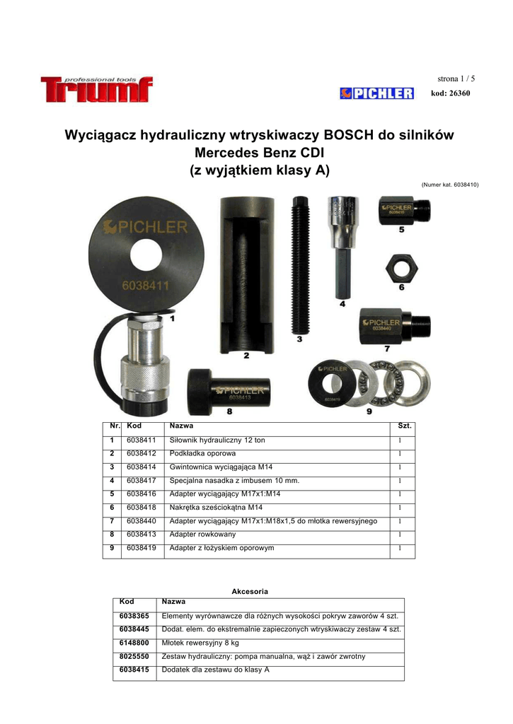 strona 1 / 5 kod: 26360 Wyciągacz hydrauliczny wtryskiwaczy BOSCH do silników Mercedes Benz CDI (z wyjątkiem klasy A) (Numer kat. 6038410) Nr. Kod Nazwa Szt. 1 6038411 Siłownik hydrauliczny 12 ton 1 2 6038412 Podkładka oporowa 1 3 6038414 Gwintownica wyciągająca M14 1 4 6038417 Specjalna nasadka z imbusem 10 mm. 1 5 6038416 Adapter wyciągający M17x1:M14 1 6 6038418 Nakrętka sześciokątna M14 1 7 6038440 Adapter wyciągający M17x1:M18x1,5 do młotka rewersyjnego 1 8 6038413 Adapter rowkowany 1 9 6038419 Adapter z łożyskiem oporowym 1 Akcesoria Kod Nazwa 6038365 Elementy wyrównawcze dla różnych wysokości pokryw zaworów 4 szt. 6038445 Dodat. elem. do ekstremalnie zapieczonych wtryskiwaczy zestaw 4 szt. 6148800 Młotek rewersyjny 8 kg 8025550 Zestaw hydrauliczny: pompa manualna, wąż i zawór zwrotny 6038415 Dodatek dla zestawu do klasy A strona 2 / 5 kod: 26360 Instrukcja użycia zestawu Przed użyciem zapoznaj się z instrukcją obsługi oraz najnowszymi danymi producenta, wskazane procedury wykonuj odpowiedniej kolejności. Instrukcja ta, jak również proponowane narzędzia zalecane są jako pomoc, jednakże nie gwarantują powodzenia naprawy. Zestaw został dokładnie przetestowany i jest z powodzeniem używany. Niezwykle istotne jest, aby wykonywać poszczególne kroki według załączonej instrukcji. Zestaw powinien być używany wyłącznie przez wykwalifikowane osoby. 1. Zdemontuj wszystkie urządzenia elektryczne i przewody paliwowe, a także inne części, które mogą ograniczać dostęp. 2. Zdejmij plastikową pokrywę z elektrycznym konektorem, odkręcając nakrętkę znajdującą się pod pokrywą kluczem. 3. Zdemontuj wtryskiwacz, naciśnij trójkąt zaworu śrubokrętem i zwolnij blokadę. Magnesem usuń pierścień zabezpieczający. 4. Wszystkie luźne części usuń używając magnesu lub szczypiec telefonicznych . strona 3 / 5 kod: 26360 5. Odkręć i usuń nakrętkę sześciokątną używając specjalnej nasadki z imbusem 10 mm. 6. Następnie usuń luźne części spod nakrętki magnesem lub kleszczami, aby można b yło jak najgłębiej nakręcić adapter wyciągający. 7. Wkręć adapter nr 7 na wyciągający młotek rewersyjny jak najgłębiej i delikatnie dokręć. 8. Wkręć trzpień prowadzący dla 8 kg młotka (6148800) do adapteru nr 7 i zakontruj go nakrętką. Wsuń młotek na trzpień i przykręć uchwyt. WAŻNE! Młotek waży 8kg i powinien być używany tylko przez 2 osoby, przy czym należy zwrócić szczególną uwagę, aby uderzenia skierowane były w kierunku do osi wtryskiwacza (do dołu). 9. Teraz możesz zacząć uderzać młotkiem w górę, aby wyciągnąć wtryskiwacz. TRIUMF professional tools s.r.o. Kollárova 88, 036 01 Martin www.triumftools.sk strona 4 / 5 kod: 26360 Mechaniczne usuwanie zapieczonego wtryskiwacza Mercedes Benz CDI. 10. Wkręć adapter nr 5 ( M17x1 : M14) do wtryskiwacza i delikatnie go dokręć. 11. Nakręć nasadkę nr 4 do adaptera nr 5 i delikatnie dokręć. Wsuń podkładkę oporową nr 2 na adapter. 12. Zamontuj łożysko z adapterem nr 9 na gwintownicy i dokręcając nakrętkę nr 6 wyciągnij wtryskiwacz. WAŻNE! Podczas wyciągania wtryskiwacza zablokuj nakrętkę na gwintownicy nr 3 kluczem 10mm, co zapobiegnie jej obracaniu. TRIUMF professional tools s.r.o. Kollárova 88, 036 01 Martin www.triumftools.sk strona 5 / 5 kod: 26360 Hydrauliczne wyciąganie wtryskiwaczów Mercedes Benz CDI. 13. Zamontuj siłownik hydrauliczny nr 1 tłokiem w kierunku do podkładki oporowej nr 2. Zamontuj adapter rowkowany nr 8 do siłownika hydraulicznego i wkręć go na gwintownicę, aż do oporu. 14. Podłącz wąż z zaworem zwrotnym do siłownika i do pompy hydraulicznej. Zacznij pompować. Wtryskiwacz zacznie wychodzić z głowicy cylindra. UWAGA! Maksymalny skok tłoka siłownika wynosi 8mm – nie przekraczaj tej wartości. 15. Otwórz zawór i poczekaj, aż tłok wróci do swojego pierwotnego położenia, zamknij zawór, wkręcaj adapter dopóki nie dotknie hydraulicznego tłoka i powtarzaj proces, dopóki cały wtryskiwacz nie zostanie wyciągnięty. Akcesoria: Elementy wyrównawcze dla różnych wysokości pokryw zaworów 4 szt. (6038445). Dodatkowe elementy do ekstremalnie zapieczonych wtryskiwaczy. TRIUMF professional tools s.r.o. Kollárova 88, 036 01 Martin www.triumftools.sk