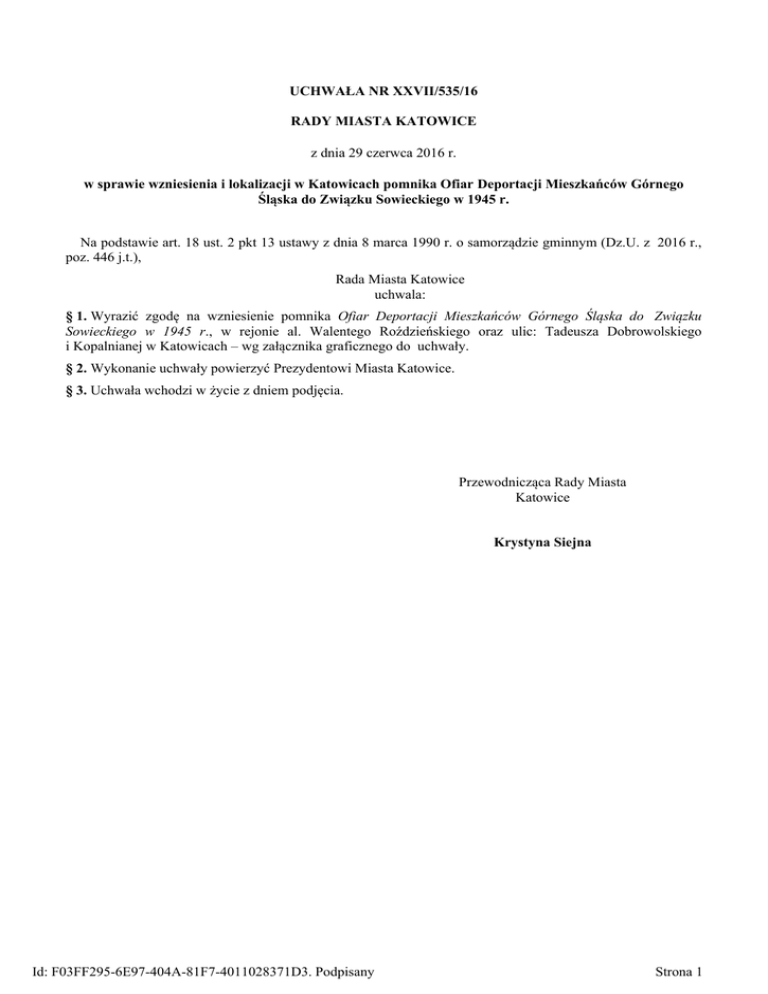 UCHWAŁA NR XXVII/535/16 RADY MIASTA KATOWICE z dnia 29 czerwca 2016 r. w sprawie wzniesienia i lokalizacji w Katowicach pomnika Ofiar Deportacji Mieszkańców Górnego Śląska do Związku Sowieckiego w 1945 r. Na podstawie art. 18 ust. 2 pkt 13 ustawy z dnia 8 marca 1990 r. o samorządzie gminnym (Dz.U. z 2016 r., poz. 446 j.t.), Rada Miasta Katowice uchwala: § 1. Wyrazić zgodę na wzniesienie pomnika Ofiar Deportacji Mieszkańców Górnego Śląska do Związku Sowieckiego w 1945 r., w rejonie al. Walentego Roździeńskiego oraz ulic: Tadeusza Dobrowolskiego i Kopalnianej w Katowicach – wg załącznika graficznego do uchwały. § 2. Wykonanie uchwały powierzyć Prezydentowi Miasta Katowice. § 3. Uchwała wchodzi w życie z dniem podjęcia. Przewodnicząca Rady Miasta Katowice Krystyna Siejna Id: F03FF295-6E97-404A-81F7-4011028371D3. Podpisany Strona 1 Załącznik do Uchwały Nr XXVII/535/16 Rady Miasta Katowice z dnia 29 czerwca 2016 r. Załącznik graficzny Id: F03FF295-6E97-404A-81F7-4011028371D3. Podpisany Strona 1 UZASADNIENIE W styczniu 1945 roku wojska Armii Czerwonej ruszyły do ofensywy. Jednostki I i IV Frontu Ukraińskiego wkroczyły na obszary Górnego Śląska i w dniach od 24 do 28 stycznia opanowały cały okręg przemysłowy. Już 3 lutego 1945 roku Państwowy Komitet Obrony ZSRS polecił dowódcom frontów i pełnomocnikom NKWD przy tych frontach deportować do ZSRS Niemców tzw. zmobilizowanych z terenów Górnego Śląska i Prus Wschodnich, mężczyzn w wieku od 17 do 50 lat. Mieli oni być sformowani w brygady robocze, a następnie przetransportowani do pracy przymusowej w Związku Sowieckim. Ludziom tym nie przedstawiano jakichkolwiek zarzutów. Stali się oni jedną z form reparacji za straty poniesione przez Sowietów podczas toczącej się jeszcze wojny. Tę zorganizowaną na masową skalę akcję prowadzono do kwietnia 1945 r. Szacuje się, że do Związku Sowieckiego wywieziono nie mniej niż 30 tys. osób (najwięcej z powiatów bytomskiego, gliwickiego i Zabrza), ale ostatecznie liczba ta może sięgnąć nawet 45 tys. W ogromnej większości były to osoby o wysokich kwalifikacjach zawodowych – górnicy, ale także hutnicy, ślusarze, mechanicy, kowale. Zdarzały się wśród nich osoby czynnie zaangażowane podczas okupacji w NSDAP i SA, byli jednak także powstańcy śląscy, żołnierze kampanii wrześniowej 1939 r., członkowie konspiracji antyhitlerowskiej. Pierwsze transporty internowanych ruszyły na Wschód z początkiem marca 1945 r. Wcześniej sowieci zorganizowali kilka obozów przejściowych, w których grupowano internowanych przybywających z mniejszych punktów tymczasowego przetrzymywania. Jeden z ważniejszych obozów przejściowych znajdował się w Łabędach, w którym w marcu 1945 r. przebywało ok. 4-5 tys. osób. Inny zorganizowano w Bytomiu, a dwa kolejne w barakach byłego niemieckiego obozu Auschwitz-Birkenau. Deportowanych transportowano w zatłoczonych, bydlęcych wagonach. Ich wyposażenie stanowiły najczęściej małe żelazne piece, prycze mocowane do ścian wagonu, otwór w podłodze do załatwiania potrzeb fizjologicznych. Podróż trwała nawet kilka tygodni. Wielu deportowanych umierało już w czasie transportu. Szacuje się, że w skrajnych przypadkach mogło to być nawet 10 proc. deportowanych. Większość deportowanych z Górnego Śląska trafiała do obozów pracy na terenie wschodniej Ukrainy, w tzw. Donbasie. Drugim miejscem koncentracji deportowanych mieszkańców Górnego Śląska były okolice Mińska na Białorusi. Liczna grupa trafiła także do Gruzji, a niektórzy w rejon Murmańska, do Kazachstanu, a nawet na Kamczatkę. Deportowani na Ukrainę pracowali głównie w tamtejszych kopalniach oraz hutach, koksowaniach, zakładach metalurgicznych i chemicznych. Władze sowieckie nie starały się zadbać o przymusowych pracowników. Katorżnicza praca w trudnych warunkach, wysoka wypadkowość, ciężkie warunki bytowe, brak odpowiedniej opieki lekarskiej powodowały wysoką śmiertelność. Według danych sowieckich co miesiąc umierało od 1,5 do 2 proc. internowanych. Ustalenie liczby ofiar śmiertelnych deportacji z Górnego Śląska wciąż jeszcze wymaga badań. Można szacować, że ok. 30 proc. deportowanych nie przeżyło. Nie sposób dziś określić, ilu deportowanych z Górnego Śląska przeżyło i wróciło. Pierwsi z nich – chorzy i wycieńczeni, nie nadający się do pracy – zostali odesłani przez władze sowieckie już w sierpniu 1945 r. Zdecydowana większość powróciła do domów przed końcem 1949 r. Ze statystyk Centralnego Zjednoczenia Przemysłu Węglowego (obejmujących tylko powracających górników, którzy następnie podjęli pracę w kopalniach) wynika, że do końca czerwca 1949 r. powróciło 5438 osób. Nieliczni – np. skazani za próbę ucieczki – wracali jeszcze na początku lat 50. Nie mniej dramatyczny był los rodzin osób deportowanych, którymi byli przede wszystkim mężczyźni – mężowie i ojcowie – jedyni żywiciele wielodzietnych rodzin. Pozbawione mężów Id: F03FF295-6E97-404A-81F7-4011028371D3. Podpisany Strona 1 kobiety a nawet dzieci były zmuszone do podjęcia pracy zarobkowej. Rodziny deportowanych często wyrzucano z mieszkań zakładowych, bo mężowie nie pracowali już w danym zakładzie. Brak informacji o losie męża lub ojca – często także brak informacji o jego śmierci – skazywał rodziny na życie w ciągłym strachu, niepewności i upokorzeniu. Wydarzenia 1945 r. trwale zapisały się w pamięci mieszkańców Górnego Śląska. Dominowało wśród nich poczucie doznanej krzywdy, potęgowane obowiązującym przez dziesięciolecia milczeniem. Niedopuszczalne było nie tylko prowadzenie badań naukowych, czy upamiętnianie ofiar. Niebezpieczne było również wspominanie o tym w prywatnych rozmowach. Mimo to pamięć o tych wydarzeniach przetrwała i żyła w śląskich rodzinach przez kolejne pokolenia – jak nieprzepraco