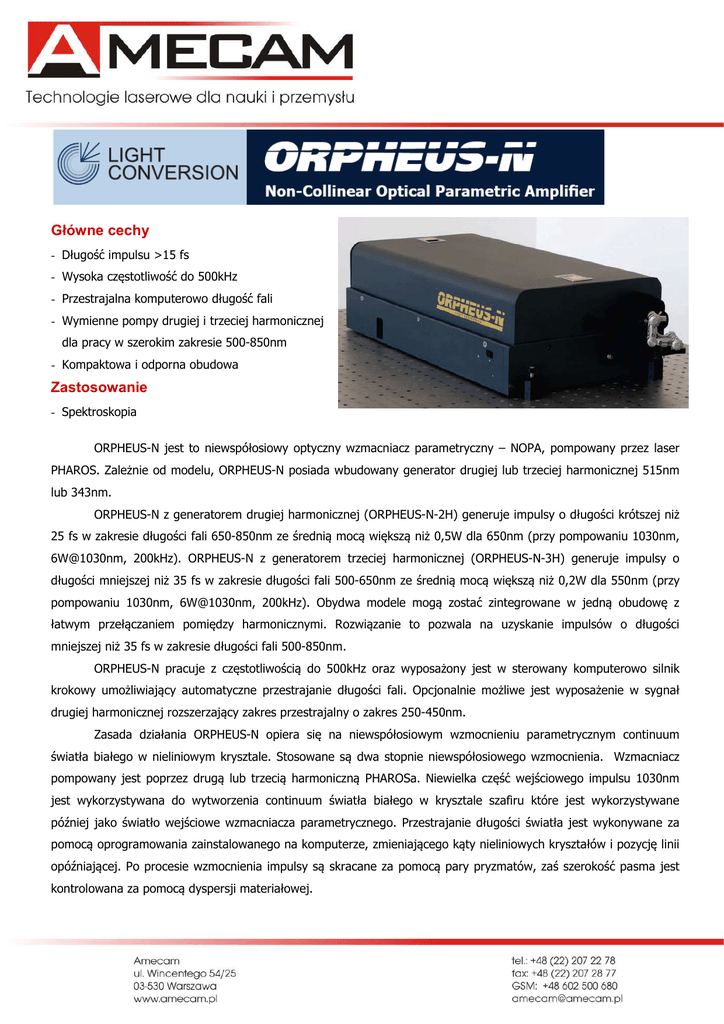 Główne cechy - Długość impulsu >15 fs - Wysoka częstotliwość do 500kHz - Przestrajalna komputerowo długość fali - Wymienne pompy drugiej i trzeciej harmonicznej dla pracy w szerokim zakresie 500-850nm - Kompaktowa i odporna obudowa Zastosowanie - Spektroskopia ORPHEUS-N jest to niewspółosiowy optyczny wzmacniacz parametryczny – NOPA, pompowany przez laser PHAROS. Zależnie od modelu, ORPHEUS-N posiada wbudowany generator drugiej lub trzeciej harmonicznej 515nm lub 343nm. ORPHEUS-N z generatorem drugiej harmonicznej (ORPHEUS-N-2H) generuje impulsy o długości krótszej niż 25 fs w zakresie długości fali 650-850nm ze średnią mocą większą niż 0,5W dla 650nm (przy pompowaniu 1030nm, 6W@1030nm, 200kHz). ORPHEUS-N z generatorem trzeciej harmonicznej (ORPHEUS-N-3H) generuje impulsy o długości mniejszej niż 35 fs w zakresie długości fali 500-650nm ze średnią mocą większą niż 0,2W dla 550nm (przy pompowaniu 1030nm, 6W@1030nm, 200kHz). Obydwa modele mogą zostać zintegrowane w jedną obudowę z łatwym przełączaniem pomiędzy harmonicznymi. Rozwiązanie to pozwala na uzyskanie impulsów o długości mniejszej niż 35 fs w zakresie długości fali 500-850nm. ORPHEUS-N pracuje z częstotliwością do 500kHz oraz wyposażony jest w sterowany komputerowo silnik krokowy umożliwiający automatyczne przestrajanie długości fali. Opcjonalnie możliwe jest wyposażenie w sygnał drugiej harmonicznej rozszerzający zakres przestrajalny o zakres 250-450nm. Zasada działania ORPHEUS-N opiera się na niewspółosiowym wzmocnieniu parametrycznym continuum światła białego w nieliniowym krysztale. Stosowane są dwa stopnie niewspółosiowego wzmocnienia. Wzmacniacz pompowany jest poprzez drugą lub trzecią harmoniczną PHAROSa. Niewielka część wejściowego impulsu 1030nm jest wykorzystywana do wytworzenia continuum światła białego w krysztale szafiru które jest wykorzystywane później jako światło wejściowe wzmacniacza parametrycznego. Przestrajanie długości światła jest wykonywane za pomocą oprogramowania zainstalowanego na komputerze, zmieniającego kąty nieliniowych kryształów i pozycję linii opóźniającej. Po procesie wzmocnienia impulsy są skracane za pomocą pary pryzmatów, zaś szerokość pasma jest kontrolowana za pomocą dyspersji materiałowej. Dostępne modele ORPHEUS-N Model Długość fali Długość impulsu ORPHEUS-N-2H 650-900 <30 fs @650-850nm ORPHEUS-N-3H 490-900 <40 fs @500-650nm Specyfikacja Parametry pompy (PHAROS): - Długość fali 1030nm - Częstotliwość 1-500kHz - Energia impulsu 10-60 µJ - Długość impulsu (FWHM) 180-260 fs ORPHEUS-N-2H ORPHEUS-N-3H (pump: 30 µJ @1030 nm) Wbudowany generator drugiej harmonicznej: Długość fail: 515 nm Energia impulsu>14 µJ (pump: 30 µJ @1030 nm) Wbudowany generator trzeciej harmonicznej: Długość fail: 343 nm Energia impulsu>7 µJ Sygnał wyjściowy: Zakres strojenia: 650–900nm Energia impulsu (po skracaniu za pomocą pryzmatów) ≥ 2 µJ @ 650 nm ≥ 0,7 µJ @ 850 nm Długość impulsu (zakładany rozkład Gaussa) ≤ 30 fs @ 650-850nm Sygnał wyjściowy: Zakres strojenia: 490–900nm Energia impulsu (po skracaniu za pomocą pryzmatów) ≥ 0.7 µJ @ 550nm ≥ 0.3 µJ @ 700nm Długość impulsu (zakładany rozkład Gaussa) ≤ 40 fs @ 500-650nm ≤ 80 fs @ 650-900nm Wymiary (mm) Model Wymiary obudowy Wymagana powierzchnia robocza W x L x H (mm) 320 x 777 x 187 370 x 790