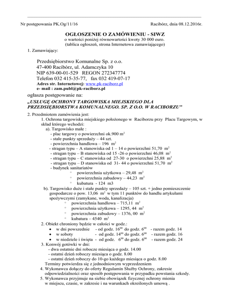 ___________________________________________________________________________ Nr postępowania PK.Og/11/16 Racibórz, dnia 08.12.2016r. OGŁOSZENIE O ZAMÓWIENIU - SIWZ o wartości poniżej równowartości kwoty 30 000 euro. (tablica ogłoszeń, strona Internetowa zamawiającego) 1. Zamawiający: Przedsiębiorstwo Komunalne Sp. z o.o. 47-400 Racibórz, ul. Adamczyka 10 NIP 639-00-01-529 REGON 272347774 Telefon 032 415-35-77, fax 032 419-07-17 Adres str. Internetowej: www.pk-raciborz.pl e- mail : [email protected] ogłasza postępowanie na: „USŁUGĘ OCHRONY TARGOWISKA MIEJSKIEGO DLA PRZEDSIĘBIORSTWA KOMUNALNEGO. SP. Z O.O. W RACIBORZU” 2. Przedmiotem zamówienia jest: 1. Ochrona targowiska miejskiego położonego w Raciborzu przy Placu Targowym, w skład którego wchodzi: a). Targowisko małe : - plac targowy o powierzchni ok.900 m2 - stałe punkty sprzedaży – 44 szt. - powierzchnia handlowa – 196 m2 - stragan typu – A stanowiska od 1 – 14 o powierzchni 51,70 m2 - stragan typu – B stanowiska od 15 -26 o powierzchni 46,08 m2 - stragan typu – C stanowiska od 27-30 o powierzchni 25,88 m2 - stragan typu – D stanowiska od 31- 44 o powierzchni 51,70 m2 - budynek sanitariatów o powierzchnia użytkowa – 29,48 m2 o powierzchnia zabudowy – 44,23 m2 o kubatura - 124 m3 b). Targowisko duże i stałe punkty sprzedaży – 105 szt. + jedno pomieszczenie gospodarcze o pow. 13,06 m2 w tym 11 punktów do handlu artykułami spożywczymi (zamykane, woda, kanalizacja) o powierzchnia handlowa – 715,11 m2 o powierzchnia użytkowa – 1295, 44 m2 o powierzchnia zabudowy – 1376, 00 m2 o kubatura – 4540 m3 2. Obiekt chroniony będzie w całości w godz.: w dni powszednie - od godz. 1600 do godz. 600 - razem godz. 14 w soboty - od godz. 1400 do godz. 600 - razem godz. 16 w niedziele i święta - od godz. 600 do godz. 600 - razem godz. 24 3. Konwój gotówki w dni: - dwa ostatnie dni robocze miesiąca o godz. 14.00 - ostatni dzień roboczy miesiąca o godz. 8.00 - ostatni dzień roboczy do 10-go każdego miesiąca o godz. 8.00 Terminy potwierdza się z jednodniowym wyprzedzeniem 4. Wykonawca dołączy do oferty Regulamin Służby Ochrony, zakresie odpowiedzialności oraz sposób postępowania w przypadku powstania szkody. 5. Wykonawca przyjmuje na siebie obowiązek fizycznej ochrony mienia w miejscu, czasie, w zakresie i na warunkach określonych umową . ___________________________________________________________________________ 6. Wykonawca ponosi pełna odpowiedzialność materialną za powierzone mienie od momentu przejęcia obiektu pod ochronę. 7. Godziny ochrony mienia w poszczególnych miesiącach mogą ulec zmianie, o wszelkich zmianach dotyczących ilości godzin Zamawiający powiadomi Wykonawcę z miesięcznym wyprzedzeniem. 8. Należność za czynności z tytułu ochrony mienia Zamawiający ureguluje po miesiącu w którym wykonano usługę ochrony, w terminie 30 dni od otrzymania prawidłowo wystawionej faktury VAT 9. Wykonawca powinien posiadać własna całodobową bazę monitorowania i kierowania/ centrum monitorowania. 10.Wykonawca wyraża gotowość do realizacji i ciągłego doskonalenia działań proekologicznych zgodnie z Polityką Środowiskową Gminy Racibórz. Oferta powinna zawierać cenę oraz zaświadczenie o wysokości odpisu na PFRON za I półrocze 2016r. 2. Wymagania dotyczące wykonania zadania: Do wykonania zadania wymagane jest: 1. Posiadania uprawnień do wykonywania określonej działalności lub czynności, jeżeli ustawy nakładają obowiązek posiadania takich uprawnień. 2. Posiadanie niezbędnej wiedzy i doświadczenia oraz dysponowanie potencjałem technicznym i osobami zdolnymi do wykonania niniejszego zamówienia. W szczególności: wykonanie trzech zamówień zbliżonych pod względem zakresu i wartości (50.000,00zł) do przedmiotu niniejszego zamówienia w obiektach np. komunalnych/ użyteczności publicznej/handlowych. 3. Dysponowania odpowiednim potencjałem technicznym oraz osobami zdolnymi do wykonania zamówienia – - Dysponowanie min.10 pracownikami ochrony fizycznej z licencja II stopnia, oraz min. 10 pracownikami z licencją I stopnia. - Posiadanie co najmniej 2 własnych grup interwencyjnych działających w promieniu 30 km od chronionych obiektów, w tym 1 grupy z wyposażeniem w broń palną. - Posiadanie co najmniej 2 oznakowanych samochodów grup interwencyjnych współpracujących ze służbami w terenie. - Wykonawca powinien posiadać własna całodobową bazę monitorowania i kierowania /centrum monitorowania/. 4. Sytuacji ekonomicznej i finansowej. Warunek zostanie spełniony, jeżeli wykonawca wykaże posiadanie ubezpieczenia od odpowiedzialności cywilnej w zakresie prowadzonej działalności związanej z przedmiotem zamówienia o wartości, co najmniej 100 000 PLN 3. Termin realizacji zamówienia : 12 miesięcy 4. W postępowaniu mogą wziąć udział wykonawcy spełniający następujące warunki: Posiadający uprawnienia do wykonywania działalności lub czynności w zakresie odpowiadającym przedmiotowi zamówienia. 5. Na potwierdzenie warunków udziału w postępowaniu, Zamawiający żąda następujących dokumentów: 1. Aktualny odpis z właściwego rejestru albo aktualne zaświadczenie o wpisie do ewidencji działalności gospodarczej, jeżeli odrębne przepisy wymagają wpisu do rejestru lub zgłoszenia do ewidencji działalności gospodarczej, wystawione nie wcześniej niż 6 miesięcy przed upływem terminu składania ofert. 2. Wykaz wykonanych czynności w zakresie niezbędnym do wykazania warunku wiedzy i doświadczenia w okresie ostatnich trzech lat przed upływem terminu składania ofert, a jeżeli okres prowadzenia działalności jest krótszy – w tym okresie, z podaniem ich rodzaju i wartości daty i miejsca wykonania oraz załączeniem dokumentów potwierdzających. ___________________________________________________________________________ 3. W celu potwierdzenia, że wykonawca dysponuje odpowiednim p
