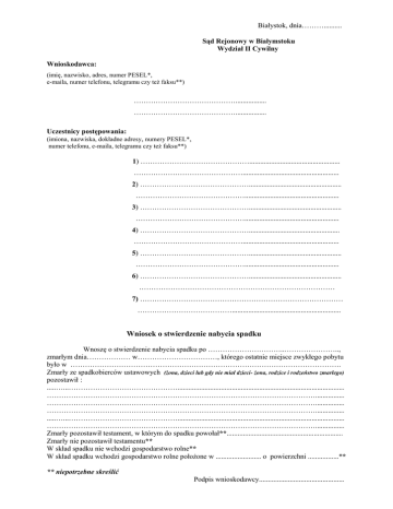 Białystok, dnia……….......... Sąd Rejonowy w Białymstoku Wydział II Cywilny Wnioskodawca: (imię, nazwisko, adres, numer PESEL*, e-maila, numer telefonu, telegramu czy też faksu**) ……………………………………................. ……………………………………................. Uczestnicy postępowania: (imiona, nazwiska, dokładne adresy, numery PESEL*, numer telefonu, e-maila, telegramu czy też faksu**) 1) ……………………………………….................................................. ………………………………………..................................................... 2) ………………………………………................................................... ……………………………………….................................................... 3) ………………………………………................................................... ……………………………………….................................................... 4) ……………………………………….................................................. ………………………………………..................................................... 5) ………………………………………................................................... ……………………………………….................................................... 6) ………………………………………................................................... ……………………………………………………………………… 7) ………………………………………………………………………… …………………………………............................................................ Wniosek o stwierdzenie nabycia spadku Wnoszę o stwierdzenie nabycia spadku po …………………………..………………….., zmarłym dnia……………… w……………………………, którego ostatnie miejsce zwykłego pobytu było w …………………………………………………………………………………………………. Zmarły ze spadkobierców ustawowych (żona, dzieci lub gdy nie miał dzieci- żona, rodzice i rodzeństwo zmarłego) pozostawił : .....…...………………………………………............................................................................................ …………………………………………………………………………………………………................ …………………………………………………………………………………………………................ …………………………………………………………………………………………………................ .....…...………………………………………............................................................................................ …………………………………………………………………………………………………................ Zmarły pozostawił testament, w którym do spadku powołał**................................................................ Zmarły nie pozostawił testamentu** W skład spadku nie wchodzi gospodarstwo rolne** W skład spadku wchodzi gospodarstwo rolne położone w ......................... o powierzchni .................** ** niepotrzebne skreślić Podpis wnioskodawcy............................................... Załączniki: 1/ odpis skrócony aktu zgonu (oraz akt małżeństwa zmarłego- w przypadku, gdy żyje małżonek zmarłego)-oryginał +1 kserokopia 2/ odpisy skrócone aktów urodzenia, lub małżeństwa synów zmarłego- oryginały +1 kserokopia 3/ odpisy skrócone aktów małżeństwa córek zmarłego- oryginały +1 kserokopia (jeżeli są pannami akty urodzenia) 4/ jeżeli zmarły nie miał dzieci- odpisy skrócone aktów urodzenia braci zmarłego i aktów małżeństwa sióstr zmarłego (jeżeli są pannami- akty urodzenia), akt małżeństwa rodziców zmarłego (jeżeli żyją)- oryginały+ 1 kserokopia 5/ potwierdzenie opłaty od wniosku na kwotę 55zł- od jednej osoby zmarłej, (od dwóch-110zł, itd.) 6/ odpisy wniosku (kserokopie) w tylu egzemplarzach, ilu jest wymienionych we wniosku uczestników postępowania Dodatkowe wyjaśnienia: Podanie numeru PESEL wnioskodawcy jest obowiązkowe, natomiast uczestników - o ile istnieje taka możliwość. Dodatkowo wnioskodawca może wskazać numer telefonu, adres mailowy, numeru telegramu czy też faksu, celem uproszczonej formy przyśpieszenia rozpoznania wniosku, zgodnie z Dz.U.2014.101 art. 149 (1) Opłatę sądową 50 zł wnosimy w formie znaków sądowych - zakupionych w kasie sądu, lub przelewam na numer konta 47 1010 0055 2963 0040 3600 0002 w NBP O/O Białystok Opłatę za wpis – 5 zł dokonywany w Rejestrze Spadkowym wnosimy na numer konta 25 1010 1049 0022 0613 9800 0000 w NBP O/O Białystok Skompletowane dokumenty należy złożyć w biurze podawczym lub przesłać pocztą do Sądu właściwego dla ostatniego miejsca zwykłego pobytu zmarłego, a w przypadku gdy miejsca zwykłego pobytu zmarłego w Polsce nie da się ustalić - do Sądu miejsca, w którym znajduje się majątek spadkowy lub jego część. * informacje obowiązkowe ** informacje nieobowiązkowe www.bialystok.sr.gov.pl