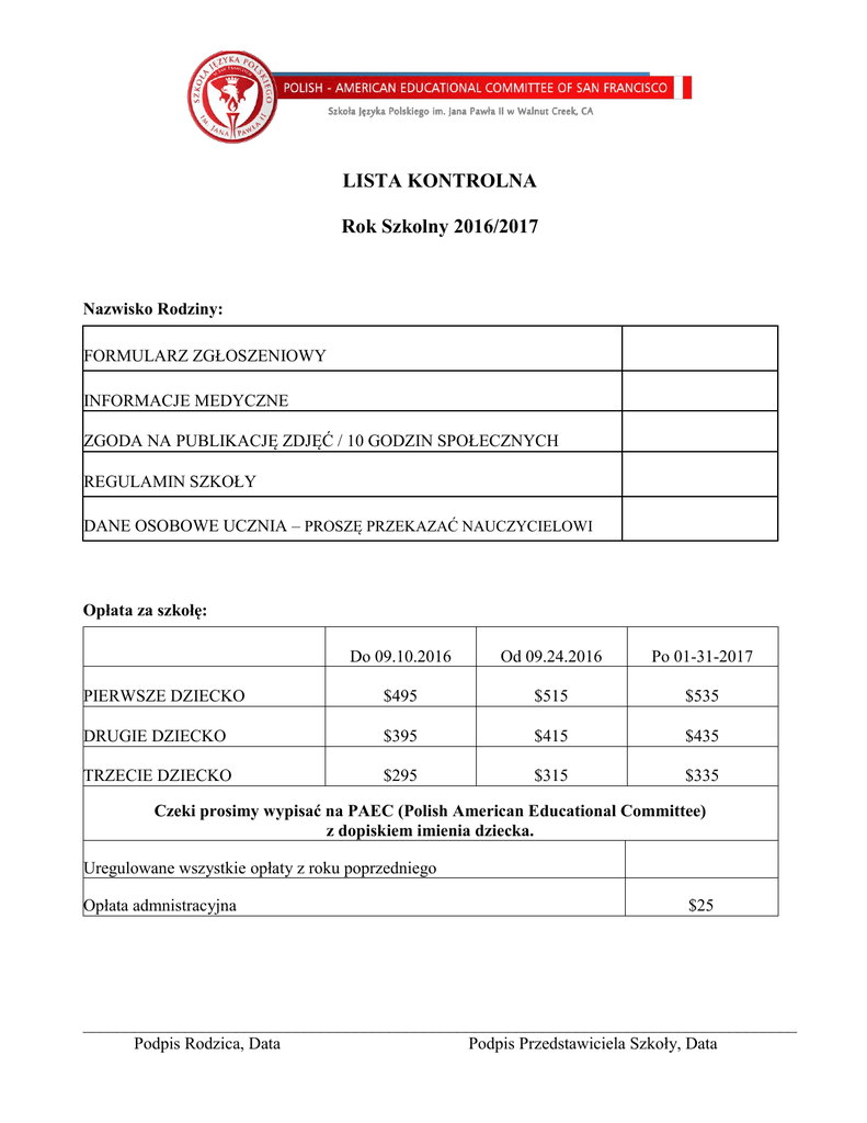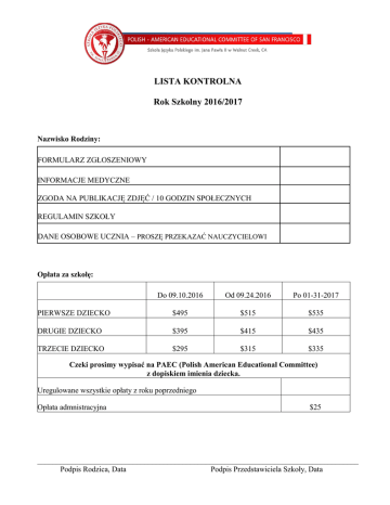 LISTA KONTROLNA Rok Szkolny 2016/2017 Nazwisko Rodziny: FORMULARZ ZGŁOSZENIOWY INFORMACJE MEDYCZNE ZGODA NA PUBLIKACJĘ ZDJĘĆ / 10 GODZIN SPOŁECZNYCH REGULAMIN SZKOŁY DANE OSOBOWE UCZNIA – PROSZĘ PRZEKAZAĆ NAUCZYCIELOWI Opłata za szkołę: Do 09.10.2016 Od 09.24.2016 Po 01-31-2017 PIERWSZE DZIECKO $495 $515 $535 DRUGIE DZIECKO $395 $415 $435 TRZECIE DZIECKO $295 $315 $335 Czeki prosimy wypisać na PAEC (Polish American Educational Committee) z dopiskiem imienia dziecka. Uregulowane wszystkie opłaty z roku poprzedniego Opłata admnistracyjna $25 ____________________________________________________________________________________ Podpis Rodzica, Data Podpis Przedstawiciela Szkoły, Data FORMULARZ ZGŁOSZENIOWY NA ROK SZKOLNY 2016/2017 (PISMO DRUKOWANE) Imię i nazwisko ucznia (pełne) Data urodzenia Miejsce urodzenia Klasa Alergie Uwagi: ____________________________________________________________________________ Telefon Rodziców: ____________________________________________________________________ Adres zamieszkania: __________________________________________________________________ ___________________________________________________________________________________ E-mail Rodziców: ____________________________________________________________________ ___________________________________________________________________________________ Kontakt w nagłych wypadkach________________________________________________________ Imię, nazwisko, telefon Warunki uczestnictwa w zajęciach w Szkole Języka Polskiego im. Jana Pawła II w Walnut Creek: 1. Wypełnienie formularzy rejestracyjnych oraz uiszczenie czesnego. 2. Uregulowanie opłat za poprzedni rok szkolny. 3. Uiszczenie opłaty administracyjnej $25. 4. Zapoznanie sie z Informatorem Szkolnym. 5. W ciągu roku szkolnego: Odpracowanie jednodniowego dyżuru podczas zajęć lub uiszczenie opłaty w wysokości $100. Odpracowanie 10-ciu godzin społecznych lub uiszczenie opłaty w wysokości $110. 6. Regularne zapoznawanie się z ogłoszeniami szkolnymi. Zapoznał(a)em się z powyższymi warunkami ____________________________________________________________________________________ Podpis Rodzica, Data DANE OSOBOWE UCZNIA (PROSZĘ PRZEKAZAĆ NAUCZYCIELOWI) Rok szkolny 2016/2017 Klasa _______________________Nauczyciel_____________________________ Imię i Nazwisko Ucznia (pełne) ___________________________________________________ Data urodzenia_________________________________________________________________ Miejsce urodzenia______________________________________________________________ Kontakt z rodzicami Numer Telefonu Adres e-mail Matka Ojciec Kontakt w nagłym wypadku:____________________________________________________ Imię, Nazwisko, Telefon Alergie: ______________________________________________________________________ Uwagi od rodziców:_____________________________________________________________ _____________________________________________________________________________ HEALTH STATEMENT / MEDICAL RELEASE 2016/2017 Name of Child: ______________________________________________________________________ Address:____________________________________________________________________________ Home Phone:________________________________________________________________________ Emergency Contact:______________________________________ Phone: ______________________ FAMILY MEDICAL INSURANCE INFORMATION Insurance Carrier ________________________ Policy or Group #: ____________________________ For the benefit of your child, and to help the School Staff, please answer the following questions: 1. Does the child have any allergies? If so, please specify: ____________________________________ 2. Does the child have any medical problems that the teacher should know about? If so, please specify: ____________________________________________________________________ 3. Is the child taking any medication? If so, please specify: ___________________________________ PARENTAL RELEASE/PERMISSION I hereby state that to the best of my knowledge the above statements are true and correct, the named child is in good health, and is free of any contagious diseases. Furthermore, I also give permission to the physician selected by the school director to order X-rays routine tests and treatment for the health of my child, and, in the event I cannot be reached in an emergency, I hereby give permission to the physician selected by the school director to hospitalize, secure proper treatment for, and injection and/or surgery for my child as named herein. I hereby give permission to my child, named in this form, to participate in the John Paul II School of Polish Language program. I waive any claim, demand or cause of action, legal or equitable against John Paul II School of Polish Language, its Officers and Staff for any injuries to my child that might be sustained by him/her during the duration of the program. ___________________________________________________________________________________ Signature of Parent or Guardian, Date ZGODA NA PUBLIKACJĘ ZDJĘĆ (PISMO DRUKOWANE) Wyrażam zgodę na robienie zdjęć mojemu dziecku podczas zajęć i wydarzeń okolicznosciowych Szkoły Języka Polskiego im. Jana Pawła II, w celu wykorzystania ich wyłącznie na użytek szkoły, do celów promocyjnych i publikacji szkolnych. Niniejszym zrzekam się wszelkich praw do odszkodowania lub ich własności. Materiały te, mogą obejmować publikacje drukowane lub elektroniczne, witryny internetowe i inne formy publikacji elektronicznych. Imię i Nazwisko Ucznia ________________________________________________Wiek___________ Imię i Nazwisko Rodzica/Opiekuna:______________________________________________________ ___________________________________________________________________________________ Podpis i Data Zobowiązuję się do odpracowania 10-ciu godzin spolecznych (prosimy wybrać conajmniej 3) BARBÓRKA – DOROCZNY BAL CHARYTATYWNY PASOWANIE NA PIERWSZAKA AKCJA CHARYTATYWNA BOŻONAROD