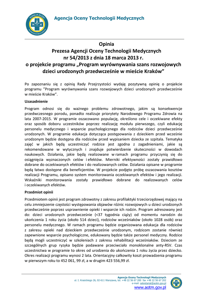 Agencja Oceny Technologii Medycznych Opinia Prezesa Agencji Oceny Technologii Medycznych nr 54/2013 z dnia 18 marca 2013 r. o projekcie programu „Program wyrównywania szans rozwojowych dzieci urodzonych przedwcześnie w mieście Kraków” Po zapoznaniu się z opinią Rady Przejrzystości wydaję pozytywną opinię o projekcie programu ”Program wyrównywania szans rozwojowych dzieci urodzonych przedwcześnie w mieście Kraków”. Uzasadnienie Program odnosi się do ważnego problemu zdrowotnego, jakim są konsekwencje przedwczesnego porodu, ponadto realizuje priorytety Narodowego Programu Zdrowia na lata 2007-2015. W programie oszacowano populację, określono cele i oczekiwane efekty oraz sposób doboru uczestników poprzez realizację modułu pierwszego, czyli edukację personelu medycznego i wsparcie psychologicznego dla rodziców dzieci przedwcześnie urodzonych. W programie edukacja dotycząca postępowania z dzieckiem przed wcześnie urodzonym będzie dostępna dla rodziców przed wypisaniem dziecka ze szpitala. Tematyka zajęć w jakich będą uczestniczyć rodzice jest zgodna z zagadnieniami, jakie są rekomendowane w wytycznych i znajduje potwierdzenie skuteczności w dowodach naukowych. Działania, jakie będą realizowane w ramach programu przyczynią się do osiągnięcia wyznaczonych celów i efektów. Mierniki efektywności zostały prawidłowo dobrane do oczekiwanych efektów i do realizowanych celów. Działania opisane w programie będą łatwo dostępne dla beneficjentów. W projekcie podjęto próbę oszacowania kosztów realizacji Programu, opisano system monitorowania oczekiwanych efektów i jego realizacji. Wskaźniki monitorowania zostały prawidłowo dobrane do realizowanych celów i oczekiwanych efektów. Przedmiot opinii Przedmiotem opinii jest program zdrowotny z zakresu profilaktyki trzeciorzędowej mający na celu zmniejszenie częstości występowania objawów różnic rozwojowych u dzieci urodzonych przedwcześnie poprzez usprawnienie opieki i wsparcie ich rodzin. Program adresowany jest do: dzieci urodzonych przedwcześnie (<37 tygodnia ciąży) od momentu narodzin do ukończenia 1 roku życia (około 514 dzieci), rodziców wcześniaków (około 1028 osób) oraz personelu medycznego. W ramach programu będzie organizowana edukacja dla rodziców z zakresu opieki nad dzieckiem przedwcześnie urodzonym, rodzicom zostanie również zapewnione wsparcie psychologiczne, edukowany będzie także personel medyczny. Rodzice będą mogli uczestniczyć w szkoleniach z zakresu rehabilitacji wcześniaków. Dzieciom ze szczególnych grup ryzyka będzie podawane przeciwciało monoklonalne anty-RSV. Czas uczestnictwa w programie to okres od urodzenia do ukończenia 1 roku życia przez dziecko. Okres realizacji programu wynosi 2 lata. Orientacyjny całkowity koszt prowadzenia programu w pierwszym roku to 452 061, 99 zł, a w drugim 423 556,99 zł. Agencja Oceny Technologii Medycznych ul. I. Krasickiego 26, 02-611 Warszawa, tel. +48 22 56 67 200 fax +48 22 56 67 202 e-mail: [email protected] www.aotm.gov.pl Opinia Prezesa AOTM nr 54/2013 z dnia 18 marca 2013 r. Problem zdrowotny Z danych Europejskiej Fundacji działającej na rzecz nowo narodzonych dzieci, wynika że 5 do 11% dzieci rodzi się przedwcześnie. Oznacza to, że pół miliona dzieci w Europie to dzieci urodzone przedwcześnie. Dzieci te stanowią najliczniejszą grupę wśród dziecięcych pacjentów. Przedwczesne porody są główna przyczyną zachorowalności i śmiertelności noworodków zarówno w krajach rozwiniętych jak i rozwijających się. Dzieci urodzone przedwcześnie są narażone na ryzyko rozwinięcia zarówno bliskich jak i odległych powikłań zdrowotnych. Im wcześniej dziecko się urodzi, tym mniej będą rozwinięte jego narządy i tym bardziej będzie narażone na powikłania medyczne w późniejszym życiu. Zwiększona zachorowalność wcześniaków wynika z różnych powikłań, w tym: przewlekłej choroby płuc, krwawień wewnątrzczaszkowych, wodogłowia pokrwotocznego, drgawek, zwiększonej podatności na zakażenia oraz zaburzeń wchłaniania, łącznie z martwiczym zapaleniem jelit. To z kolei może sprzyjać ponownym hospitalizacjom, nieprawidłowemu rozwojowi fizycznemu i wzrostowi zgonów w okresie niemowlęcym. Wiele dzieci z przewlekłą chorobą płuc jest wypisywanych do domu podczas leczenia z zaleceniami dotyczącymi dalszej terapii. Są one szczególnie narażone na nawracające infekcje układu oddechowego, niewłaściwe odżywianie i zaburzenia wzrastania. Inne problemy medyczne, charakterystyczne dla noworodków przedwcześnie urodzonych, to m. in. występowanie bezdechów i bradykardii, objawów refluksu żołądkowo-przełykowego, częstych zaburzeń w karmieniu. U dzieci przedwcześnie urodzonych występuje większe prawdopodobieństwo zaburzeń neurologicznych zarówno w okresie niemowlęcym, jak i później. Mogą to być przejściowe problemy neurologiczne związane z zaburzeniem napięcia mięśniowego i odruchów w pierwszych miesiącach życia. Poważne neurologiczne następstwa są zazwyczaj diagnozowane pod koniec 1 roku życia. Należą do nich: porażenie mózgowe, nieprawidłowości sensoryczne (ślepota, głuchota), wodogłowie pokrwotoczne, drgawki. Opóźnienie rozwoju umysłowego i zaburzenia wyższych funkcji korowych mogą dotyczyć pewnej grupy wcześniaków i rozpoznawane są w ciągu kolejnych lat życia. Podczas długofalowej oceny u dzieci urodzonych przedwcześnie stwierdzono problemy szkolne i społeczne, wynikające z opóźnienia funkcji poznawczych, zaburzenia mowy i funkcji językowych, trudności koordynacji ruchowej i problemów percepcji. Chociaż wcześniaki charakteryzują się większym ryzykiem wystąpienia zaburzeń neurologicznych w porównaniu z populacją ogólną, większość z nich rozwija się prawidłowo i jest całkowicie zdrowa. Wcześniactwo jest nie tylko ogromnym wyzwaniem dla medyków; to także osobisty problem 
