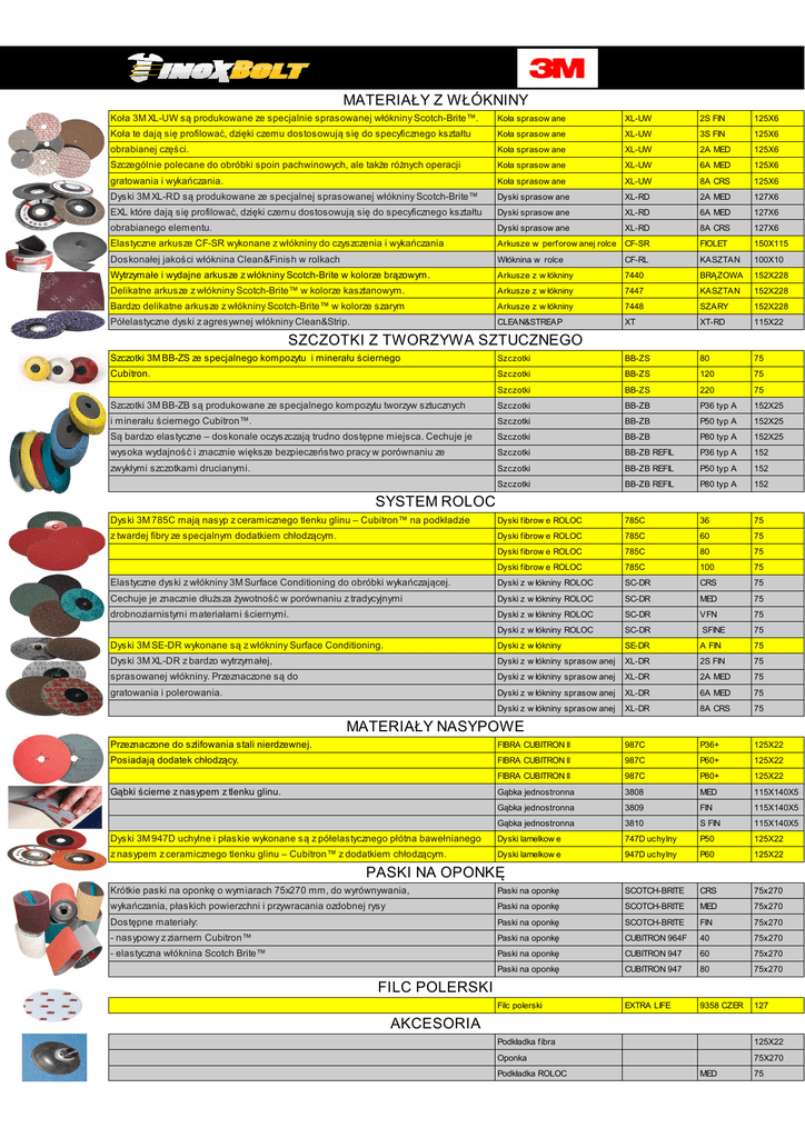 MATERIAŁY Z WŁÓKNINY Koła 3M XL-UW są produkowane ze specjalnie sprasowanej włókniny Scotch-Brite™. Koła sprasow ane XL-UW 2S FIN 125X6 Koła te dają się profilować, dzięki czemu dostosowują się do specyficznego kształtu Koła sprasow ane XL-UW 3S FIN 125X6 obrabianej części. Koła sprasow ane XL-UW 2A MED 125X6 Szczególnie polecane do obróbki spoin pachwinowych, ale także różnych operacji Koła sprasow ane XL-UW 6A MED 125X6 gratowania i wykańczania. Koła sprasow ane XL-UW 8A CRS 125X6 Dyski 3M XL-RD są produkowane ze specjalnej sprasowanej włókniny Scotch-Brite™ Dyski sprasow ane XL-RD 2A MED 127X6 EXL które dają się profilować, dzięki czemu dostosowują się do specyficznego kształtu Dyski sprasow ane XL-RD 6A MED 127X6 obrabianego elementu. Dyski sprasow ane XL-RD 8A CRS 127X6 Elastyczne arkusze CF-SR wykonane z włókniny do czyszczenia i wykańczania Arkusze w perf orow anej rolce CF-SR FIOLET 150X115 Doskonałej jakości włóknina Clean&Finish w rolkach Włóknina w rolce CF-RL KASZTAN 100X10 Wytrzymałe i wydajne arkusze z włókniny Scotch-Brite w kolorze brązowym. Arkusze z w łókniny 7440 BRĄZOWA 152X228 Delikatne arkusze z włókniny Scotch-Brite™ w kolorze kasztanowym. Arkusze z w łókniny 7447 KASZTAN 152X228 Bardzo delikatne arkusze z włókniny Scotch-Brite™ w kolorze szarym Arkusze z w łókniny 7448 SZARY 152X228 Półelastyczne dyski z agresywnej włókniny Clean&Strip. CLEAN&STREAP XT XT-RD 115X22 SZCZOTKI Z TWORZYWA SZTUCZNEGO Szczotki 3M BB-ZS ze specjalnego kompozytu i minerału ściernego Szczotki BB-ZS 80 75 Cubitron. Szczotki BB-ZS 120 75 Szczotki BB-ZS 220 75 Szczotki 3M BB-ZB są produkowane ze specjalnego kompozytu tworzyw sztucznych Szczotki BB-ZB P36 typ A 152X25 i minerału ściernego Cubitron™. Szczotki BB-ZB P50 typ A 152X25 Są bardzo elastyczne – doskonale oczyszczają trudno dostępne miejsca. Cechuje je Szczotki BB-ZB P80 typ A 152X25 wysoka wydajność i znacznie większe bezpieczeństwo pracy w porównaniu ze Szczotki BB-ZB REFIL P36 typ A 152 zwykłymi szczotkami drucianymi. Szczotki BB-ZB REFIL P50 typ A 152 Szczotki BB-ZB REFIL P80 typ A 152 Dyski 3M 785C mają nasyp z ceramicznego tlenku glinu – Cubitron™ na podkładzie Dyski fibrow e ROLOC 785C 36 75 z twardej fibry ze specjalnym dodatkiem chłodzącym. Dyski fibrow e ROLOC 785C 60 75 Dyski fibrow e ROLOC 785C 80 75 Dyski fibrow e ROLOC 785C 100 75 Elastyczne dyski z włókniny 3M Surface Conditioning do obróbki wykańczającej. Dyski z w łókniny ROLOC SC-DR CRS 75 Cechuje je znacznie dłuższa żywotność w porównaniu z tradycyjnymi Dyski z w łókniny ROLOC SC-DR MED 75 drobnoziarnistymi materiałami ściernymi. Dyski z w łókniny ROLOC SC-DR VFN 75 Dyski z w łókniny ROLOC SC-DR SFINE 75 Dyski 3M SE-DR wykonane są z włókniny Surface Conditioning. Dyski z w łókniny SE-DR A FIN 75 Dyski 3M XL-DR z bardzo wytrzymałej, Dyski z w łókniny sprasow anej XL-DR 2S FIN 75 sprasowanej włókniny. Przeznaczone są do Dyski z w łókniny sprasow anej XL-DR 2A MED 75 gratowania i polerowania. Dyski z w łókniny sprasow anej XL-DR 6A MED 75 Dyski z w łókniny sprasow anej XL-DR 8A CRS 75 SYSTEM ROLOC MATERIAŁY NASYPOWE Przeznaczone do szlifowania stali nierdzewnej. FIBRA CUBITRON II 987C P36+ 125X22 Posiadają dodatek chłodzący. FIBRA CUBITRON II 987C P60+ 125X22 FIBRA CUBITRON II 987C P80+ 125X22 Gąbka jednostronna 3808 MED 115X140X5 Gąbka jednostronna 3809 FIN 115X140X5 Gąbka jednostronna 3810 S FIN 115X140X5 Dyski 3M 947D uchylne i płaskie wykonane są z półelastycznego płótna bawełnianego Dyski lamelkow e 747D uchylny P50 125X22 z nasypem z ceramicznego tlenku glinu – Cubitron™ z dodatkiem chłodzącym. Dyski lamelkow e 947D uchylny P60 125X22 Gąbki ścierne z nasypem z tlenku glinu. PASKI NA OPONKĘ Krótkie paski na oponkę o wymiarach 75x270 mm, do wyrównywania, Paski na oponkę SCOTCH-BRITE CRS 75x270 wykańczania, płaskich powierzchni i przywracania ozdobnej rysy Paski na oponkę SCOTCH-BRITE MED 75x270 Dostępne materiały: Paski na oponkę SCOTCH-BRITE FIN 75x270 - nasypowy z ziarnem Cubitron™ Paski na oponkę CUBITRON 964F 40 75x270 - elastyczna włóknina Scotch Brite™ Paski na oponkę CUBITRON 947 60 75x270 Paski na oponkę CUBITRON 947 80 75x270 Filc polerski EXTRA LIFE 9358 CZER 127 FILC POLERSKI AKCESORIA Podkładka f ibra 125X22 Oponka Podkładka ROLOC 75X270 MED 75