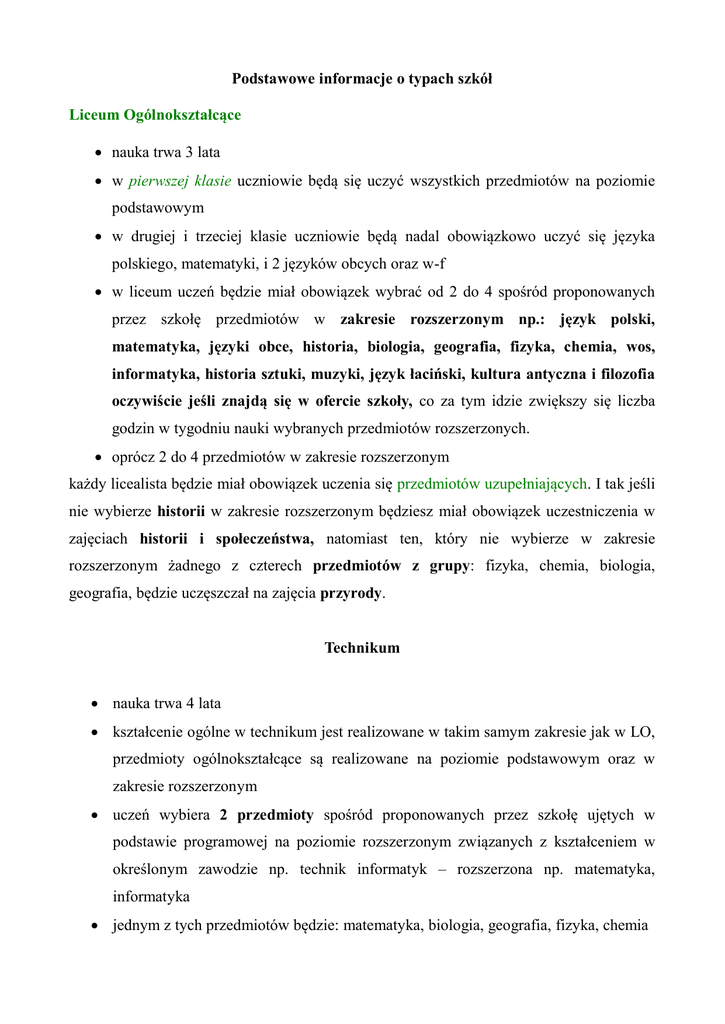 Podstawowe informacje o typach szkół Liceum Ogólnokształcące nauka trwa 3 lata w pierwszej klasie uczniowie będą się uczyć wszystkich przedmiotów na poziomie podstawowym w drugiej i trzeciej klasie uczniowie będą nadal obowiązkowo uczyć się języka polskiego, matematyki, i 2 języków obcych oraz w-f w liceum uczeń będzie miał obowiązek wybrać od 2 do 4 spośród proponowanych przez szkołę przedmiotów w zakresie rozszerzonym np.: język polski, matematyka, języki obce, historia, biologia, geografia, fizyka, chemia, wos, informatyka, historia sztuki, muzyki, język łaciński, kultura antyczna i filozofia oczywiście jeśli znajdą się w ofercie szkoły, co za tym idzie zwiększy się liczba godzin w tygodniu nauki wybranych przedmiotów rozszerzonych. oprócz 2 do 4 przedmiotów w zakresie rozszerzonym każdy licealista będzie miał obowiązek uczenia się przedmiotów uzupełniających. I tak jeśli nie wybierze historii w zakresie rozszerzonym będziesz miał obowiązek uczestniczenia w zajęciach historii i społeczeństwa, natomiast ten, który nie wybierze w zakresie rozszerzonym żadnego z czterech przedmiotów z grupy: fizyka, chemia, biologia, geografia, będzie uczęszczał na zajęcia przyrody. Technikum nauka trwa 4 lata kształcenie ogólne w technikum jest realizowane w takim samym zakresie jak w LO, przedmioty ogólnokształcące są realizowane na poziomie podstawowym oraz w zakresie rozszerzonym uczeń wybiera 2 przedmioty spośród proponowanych przez szkołę ujętych w podstawie programowej na poziomie rozszerzonym związanych z kształceniem w określonym zawodzie np. technik informatyk – rozszerzona np. matematyka, informatyka jednym z tych przedmiotów będzie: matematyka, biologia, geografia, fizyka, chemia jeśli np. będzie uczyć się w zakresie rozszerzonym matematyki i fizyki jego przedmiotem uzupełniającym będzie historia i społeczeństwo w zawodach wyodrębniono kwalifikacje – 2 lub 3 dla poszczególnych zawodów w trakcie nauki są praktyki uczeń zdaje 2 lub 3 egzaminy zawodowe w zależności na ile kwalifikacji podzielono dany zawód po każdym zdanym egzaminie uczeń otrzymuje świadectwo kwalifikacyjne, gdy zda wszystkie egzaminy otrzyma dyplom technika potwierdzający kwalifikacje zawodowe, gdy zda maturę będzie mógł kontynuować naukę na studiach wyższych swoje wykształcenie będzie mógł uzupełniać na kursach kwalifikacyjnych np. jeśli uzyskał tytuł technik ekonomista czyli potwierdził 2 kwalifikacje i ukończył technikum aby zostać technikiem rachunkowości będzie musiał potwierdzić 1 kwalifikacje (rozliczanie wynagrodzeń i danin publicznych) i będzie miał wtedy 2 zawody