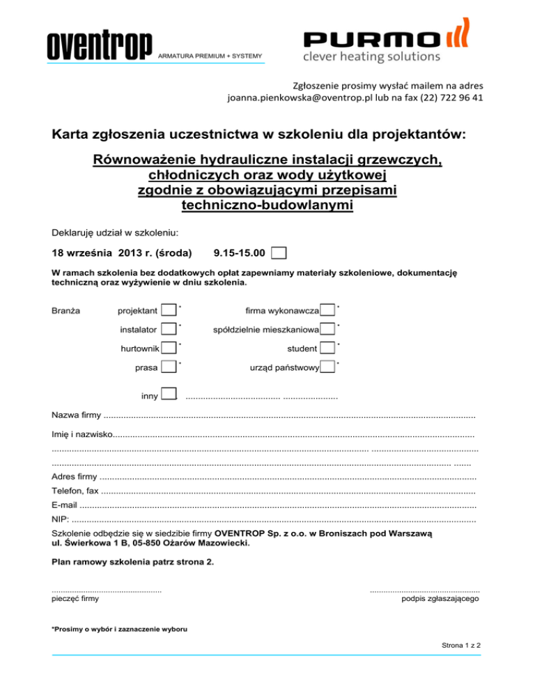 ARMATURA PREMIUM + SYSTEMY Zgłoszenie prosimy wysłać mailem na adres [email protected] lub na fax (22) 722 96 41 Karta zgłoszenia uczestnictwa w szkoleniu dla projektantów: Równoważenie hydrauliczne instalacji grzewczych, chłodniczych oraz wody użytkowej zgodnie z obowiązującymi przepisami techniczno-budowlanymi Deklaruję udział w szkoleniu: 18 września 2013 r. (środa) 9.15-15.00 W ramach szkolenia bez dodatkowych opłat zapewniamy materiały szkoleniowe, dokumentację techniczną oraz wyżywienie w dniu szkolenia. Branża projektant * firma wykonawcza * * instalator * spółdzielnie mieszkaniowa * hurtownik * prasa * inny student urząd państwowy * * * ... ...................................... ...................... Nazwa firmy ..................................................................................................................................................... Imię i nazwisko................................................................................................................................................. ............................................................................................................................... ........................................... ................................................................................................................................................................ ....... Adres firmy ....................................................................................................................................................... Telefon, fax ...................................................................................................................................................... E-mail ............................................................................................................................................................... NIP: .................................................................................................................................................................. Szkolenie odbędzie się w siedzibie firmy OVENTROP Sp. z o.o. w Broniszach pod Warszawą ul. Świerkowa 1 B, 05-850 Ożarów Mazowiecki. Plan ramowy szkolenia patrz strona 2. ................................................. pieczęć firmy ................................................. podpis zgłaszającego *Prosimy o wybór i zaznaczenie wyboru Strona 1 z 2 ARMATURA PREMIUM + SYSTEMY Równoważenie hydrauliczne instalacji grzewczych, chłodniczych oraz wody użytkowej zgodnie z obowiązującymi przepisami techniczno-budowlanymi w dniu 18.09.2013 9.15-9.30 przyjazd i rejestracja uczestników 9.30 rozpoczęcie szkolenia 9.30 - 10.50 Argumentacja – dlaczego i po co? Regulacja przepływu na odbiornikach. 10.50 przerwa na kawę 11.00-12.30 12.30- 13.00 13.00 -14.15 Zastosowanie grzejników Purmo w instalacjach c.o. Nowości w ofercie firmy Purmo. przerwa na obiad Zastosowanie stałych i dynamicznych oporów w instalacji c.o. i c.w.u. 14.15-14.45 Kilka nowości w ofercie firmy Oventrop (grupy pompowe, wymiennikowe węzły mieszkaniowe) 14.45-15.00 Pytania, rozdanie dyplomów, zakończenie szkolenia. Strona 2 z 2