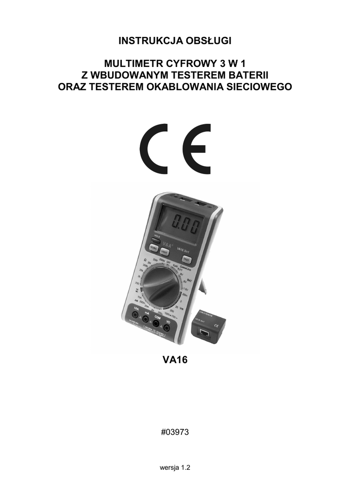 INSTRUKCJA OBSŁUGI MULTIMETR CYFROWY 3 W 1 Z WBUDOWANYM TESTEREM BATERII ORAZ TESTEREM OKABLOWANIA SIECIOWEGO VA16 #03973 wersja 1.2 Wstęp DuŜy, czytelny wyświetlacz i nowoczesny wygląd, w połączeniu z funkcjonalnością, czynią z multimetr VA16 idealnym do klasycznych pomiarów. Urządzenie posiada wbudowany tester baterii, a dzięki wyposaŜeniu urządzenia w złącza RJ-11 oraz RJ-45 moŜliwy jest równieŜ pomiar istotnych parametrów okablowania sieciowego i telefonicznego. Instrukcja obsługi dostarcza informacji dotyczących bezpieczeństwa i sposobu uŜytkowania, parametrów technicznych oraz konserwacji multimetru cyfrowego MS8265. Multimetr ten moŜe być stosowany do następujących pomiarów: - napięcia stałego (DC) i przemiennego (AC); - prądu stałego (DC) i przemiennego (AC); - testu diody; - ciągłości obwodu; - rezystancji; - test baterii; - test okablowania sieciowego (RJ-11, RJ-45). Bezpieczeństwo uŜytkowania Prezentowany przyrząd pomiarowy został zaprojektowany w trosce o bezpieczeństwo uŜytkownika i zapewnia poprawną pracę pod warunkiem przestrzegania zaleceń niniejszej instrukcji. Przyrząd spełnia wymagania dyrektyw LVD 73/23/EEC, 89/336/EEC oraz posiada deklarację zgodności CE producenta. Przed przystąpieniem do wykonywania pomiarów naleŜy zapoznać się z instrukcją obsługi, ze wszystkimi symbolami znajdującymi się na przyrządzie oraz z ich znaczeniem. W celu zapewnienia podstawowych wymogów bezpieczeństwa obsługi przyrządu naleŜy zastosować się do poniŜszych zasad: – – – – – – – – – – – 2 Przyrząd naleŜy zabezpieczyć przed dostępem dzieci i osób niepowołanych. JeŜeli przyrząd zostanie przeniesiony z miejsca o niŜszej temperaturze do miejsca o wyŜszej temperaturze, wówczas wewnątrz przyrządu moŜe się skroplić para wodna uniemoŜliwiając jego prawidłowe funkcjonowanie i dlatego naleŜy odczekać, aŜ wilgoć odparuje. Przed przystąpieniem do konserwacji przyrządu i montaŜu elementów wymienialnych przyrządu takich jak: baterie, bezpieczniki i inne, naleŜy bezwzględnie odłączyć od przyrządu wszystkie przewody łączące z innymi urządzeniami. Nie naleŜy przekraczać dopuszczalnych wartości pomiarowych mierzonej wielkości nie tylko ze względu na błędy pomiaru i moŜliwość uszkodzenia przetworników pomiarowych, ale przede wszystkim ze względów bezpieczeństwa uŜytkownika. Zabrania się uŜywania przyrządu w obszarach duŜej wilgotności, zasolenia, działania oparów toksycznych, łatwopalnych lub Ŝrących. Nie uŜywać przyrządu przy widocznych uszkodzeniach lub gdy przewody są uszkodzone lub zuŜyte. Przewody pomiarowe naleŜy wymienić na nowe o takich samych parametrach przekroju i izolacji, a przyrząd naleŜy oddać do autoryzowanego serwisu. Przy pomiarach elektrycznych nie dotykać nie wykorzystanych gniazd i końcówek przyrządu. Jeśli wartość pomiaru jest nieznana, pomiar naleŜy rozpocząć od największego zakresu pomiarowego. W celu zmiany wielkości mierzonej, przed przełączeniem przełącznika naleŜy odłączyć końcówki pomiarowe. Nie mierzyć rezystancji obwodów znajdujących się pod napięciem. W przypadku pomiaru długich linii lub pojemności pomiar moŜe być wykonany dopiero po całkowitym rozładowaniu ładunku elektrostatycznego. Symbole i oznaczenia związane z bezpieczeństwem uŜytkowania znajdujące się na obudowie miernika: OSTRZEśENIE: Przed uruchomieniem przyrządu lub wykonaniem pomiaru naleŜy zapoznać się dokładnie z instrukcją obsługi. Nie zastosowanie się do tego polecenia moŜe spowodować uszkodzenie lub zniszczenie multimetru. Oznaczenie końcówek i wejść, na których moŜe występować napięcie o niebezpiecznej wartości. Podwójna izolacja (II klasa bezpieczeństwa). CE Zgodność z dyrektywą Unii Europejskiej. 1. Zawartość opakowania - multimetr VA16, - przewody pomiarowe, - angielska wersja instrukcji obsługi, - niniejsza wersja instrukcji obsługi. Podczas dostawy naleŜy upewnić się, Ŝe opakowanie nie jest uszkodzone. W przypadku stwierdzonych uszkodzeń naleŜy niezwłocznie skontaktować się z dostawcą. Prosimy równieŜ o sprawdzenie zgodności zawartości opakowania z powyŜej zamieszczoną listą. 2. Zawartość instrukcji Instrukcja ta zawiera opis cyfrowego multimetru z procedurą instalacji, konfiguracji i uŜytkowania. Przed przystąpieniem do instalacji urządzenia naleŜy dokładnie przeczytać całość tej instrukcji a w szczególności punkty poświęcone bezpieczeństwu. Nie zastosowanie się do tego zalecenia jak i do innych uwag zawartych w niniejszej instrukcji moŜe spowodować uszkodzenie lub zniszczenie przyrządu. 3. Charakterystyka ogólna 1) Maksymalna wartość mierzonego napięcia: 700V AC lub 1000V DC. 2) Typ baterii: 9V NEDA 1604 lub 6F22. 3) Wyświetlacz: LCD. 4) Wskazanie przekroczenia zakresu pomiarowego: wyświetlany symbol “1”. 5) Zakresy temperatur: pracy: 0°C... 40°C; przechow ywania:-10°C... 50°C. 6) Wskaźnik stanu baterii: wyświetlany symbol ; 7) Waga: około 360g (z baterią). 8) Wymiary: 185x85x44mm. 3 4. Budowa urządzenia 1) Gniazdo RJ-11. 2) Gniazdo RJ-45. 3) Przycisk [HOLD]. 4) Przełącznik AC/DC. 5) Gniazdo pomiarowe „10A”. 6) Gniazdo pomiarowe „mA”. 7) Gniazdo pomiarowe „COM”. 8) Gniazdo pomiarowe „VΩ Ω ”. 9) Gniazdo RJ-45 (zdalne). 10) Obrotowy przełącznik wielkości mierzonych. 11) Przycisk [TEST]. 12) Przycisk podświetlenia. 13) Wyświetlacz LCD. 5. Wykonywanie pomiarów 5.1 Pomiar napięcia stałego (DC) i przemiennego (AC) 1) Przyłączyć czarny przewód pomiarowy do gniazda "COM", a czerwony przewód pomiarowy do gniazda „VΩ Ω ”. 2) Obrotowym przełącznikiem naleŜy wybrać zakres pomiaru. 3) Podłączyć przewody do badanego obwodu. 4) Wcisnąć przycisk [AC/DC]. 5) Odczytać wskazanie przyrządu. JeŜeli na wyświetlaczu pojawi się symbol „1”, oznacza to przekroczenie zakresu pomiarowego. 