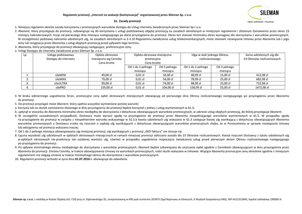 Regulamin promocji „Internet na wakacje (kontynuacja)” organizowanej przez Sileman Sp. z o.o. §1. Zasady promocji 1. Niniejszy regulamin określa zasady korzystania z promocyjnych warunków dostępu do Usług Internetu świadczonych przez Sileman Sp z o.o. 2. Abonent, który przystępuje do promocji, zobowiązuje się do korzystania z usługi podstawowej objętej promocją na zasadach określonych w niniejszym regulaminie i złożonym Zamówieniu przez okres 23 miesięcy kalendarzowych, licząc od pierwszego dnia miesiąca następującego po dacie przystąpienia do promocji. Okres ten stanowi minimalny okres wymagany dla skorzystania z warunków promocyjnych. W szczególności podstawę naliczenia udzielonych ulg, na zasadach określonych w § 4.10 Regulaminu świadczenia usług telekomunikacyjnych, może stanowić rozwiązanie Umowy przez Abonenta lub z jego winy lub rezygnacja przez Abonenta z usług objętych promocją przed upływem tego terminu. 3. Abonenta, który przystępuje do promocji obowiązują następujące, preferencyjne ceny: a. Usługi Dostępu do Internetu świadczone przez Sileman Sp. z o.o. Lp. Usługa podstawowa Opłata okresowa Opłata okresowa miesięczna Ulga w skali jednego Okresu Suma udzielonych ulg dla Dostępu do Internetu miesięczna wg Cennika promocyjna rozliczeniowego 23 Okresów rozliczeniowych Cena brutto Cena brutto Od 1 do 2 pełnego Od 3 pełnego Od 1 do 2 pełnego Od 3 pełnego miesiąca miesiąca miesiąca miesiąca 1. sileMINI 49,00 zł 0,01 zł 34,00 zł 48,99 zł 15,00 zł 412,98 zł 2. sileMAX 79,00 zł 0,01 zł 54,00 zł 78,99 zł 25,00 zł 682,98 zł 3. sileULTRA 99,00 zł 0,01 zł 74,00 zł 98,99 zł 25,00 zł 722,98 zł 4. silePRO 159,00 zł 0,01 zł 104,00 zł 158,99 zł 55,00 zł 1472,98 zł 4. W braku odmiennego uzgodnienia Stron, promocyjne ceny opłat okresowych miesięcznych obowiązują od pierwszego dnia Okresu rozliczeniowego następującego po przystąpieniu przez Abonenta do promocji. 5. Do promocji przystąpić może Abonent, który spełnia wszystkie wymienione poniżej warunki: a. korzysta lub na skutek zamówienia złożonego w dniu przystąpienia do promocji będzie korzystał z jednej z usług wymienionych w §1.3, b. upłynął w stosunku do Abonenta minimalny okres niezbędny do skorzystania z dotychczas obowiązujących warunków promocyjnych, w zakresie usług objętych promocją, do której przystępuje Abonent. 6. W szczególnie uzasadnionych przypadkach, Dostawca może wyrazić zgodę na przystąpienie do promocji przez Abonenta niespełniającego warunków wymienionych w §1.5. W przypadku zgody na przystąpienie do promocji w związku z niespełnieniem warunku wskazanego w §1.5.b kwota udzielonych ulg wskazana w §1.3 zastępuje kwotę ulg wynikającą z dotychczas obowiązujących Abonenta warunków promocyjnych a Dostawca zrzeka się roszczeń o zapłatę ulg wynikających z dotychczas obowiązujących warunków promocyjnych chyba, że w Porozumieniu w sprawie rozwiązania Umowy lub odstąpieniu od promocji wskazano inaczej. 7. Od 1 do 2 pełnego miesiąca obowiązywania ulg niniejszej promocji, ulg wynikających z promocji „EKO faktura” nie stosuje się. 8. Łączna wysokość ulg udzielonych w opłatach okresowych miesięcznych w ramach niniejszej promocji obliczona została dla 23 Okresów rozliczeniowych. Kwota roszczeń Dostawcy z tytułu udzielonych ulg w opłatach okresowych nie przekroczy tak ustalonej wartości ulg, również w przypadku uzgodnienia rozpoczęcia świadczenia usług przed pierwszym dniem Okresu rozliczeniowego następującego po przystąpieniu do promocji. 9. Po upływie minimalnego okresu niezbędnego do skorzystania z warunków promocyjnych, Abonent będzie zobowiązany do uiszczania opłat zgodnie z Cennikiem obowiązującym w dniu przystąpienia przez Abonenta do promocji. Zmiana Cennika, w trakcie obowiązywania Umowy na warunkach promocyjnych, rodzi skutki wskazane w Umowie. Wiążące Abonenta promocyjne ceny określone zgodnie z niniejszym regulaminem nie ulegają zmianie w trakcie minimalnego okresu do skorzystania z warunków promocyjnych. 10. Regulamin promocji wchodzi w życie dnia 01.07.2016 r. obowiązuje do odwołania. Sileman sp. z o.o. z siedzibą w Rudzie Śląskiej (41-710) przy ul. Dąbrowskiego 35, zarejestrowaną w KRS pod numerem 207875 (Sąd Rejonowy w Gliwicach, X Wydział Gospodarczy KRS), NIP 6412315845, kapitał zakładowy 190000 zł.