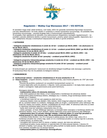 Regulamin – Walley Cup Warszawa 2017 – VII EDYCJA W zawodach mogą wziąć udział amatorzy, czyli osoby, które nie uprawiały łyżwiarstwa figurowego wyczynowo (nie były sklasyfikowane i nie brały udziału w rywalizacji w ramach łyżwiarstwa wyczynowego, nie posiadały testu łyżwiarstwa wyczynowego – powyżej drugiego testu w konkurencjach indywidualnych). W przypadku chęci zgłoszenia do zawodów, przy jednoczesnym niespełnieniu wymogów regulaminowych – na przykład z powodu zaistnienia startów w gronie wyczynowym, prosimy opisać swój przypadek. Zapoznamy się z nim i podejmiemy decyzję o ewentualnym dopuszczeniu do startu w gronie amatorów. # KATEGORIE - kategoria amatorów młodzieżowa A (wiek do 10 lat – urodzeni po 08.01.2006 – nie ukończone 11 lat do 08.01.2017) - kategoria amatorów młodzieżowa B (wiek 11-14 lat – urodzeni przed 08.01.2006 i po 08.01.2002 – nie ukończone 15 lat do 08.01.2017) - kategoria amatorów A (wiek 15-24 lata – urodzeni przed 08.01.2002 i po 08.01.1992 – nie ukończone 25 lat do 08.01.2017) - kategoria amatorów B (wiek 25 lat i powyżej – urodzeni przed 08.01.1992) - kategoria programu interpretacyjnego amatorów A (wiek do 24 lat – urodzeni po 08.01.1992 – nie ukończone 25 lat do 08.01.2017) - kategoria programu interpretacyjnego amatorów B (wiek 25 lat i powyżej – urodzeni przed 08.01.1992) W konkurencjach par sportowych i tanecznych do określonej kategorii kwalifikuje wiek starszego z partnerów. W konkurencji Show Duo nie ma podziału na kategorie wiekowe. # KONKURENCJE A - konkurencje solowe – amatorów młodzieżowa A i B oraz amatorów A i B a – klasa brązowa – program dowolny, muzyka z wokalem lub bez, czas trwania programu do 1’50” (ale może być krótszy) *Mnożnik dla punktów uzyskanych we wszystkich komponentach wynosi 1,6. *Liczone będą tylko cechy do poziomu 1 włącznie. Cechy powyżej poziomu 1 nie będą miały wpływu jeśli chodzi o wymagania i będą ignorowane przez panel techniczny. Wymagane elementy: - maksymalnie cztery (4) elementy skokowe - tylko skoki pojedyncze (bez Aksla), w tym maksymalnie 2 kombinacje lub sekwencje skoków (maksymalnie jedna kombinacja skoków, składająca się z 3 skoków, druga kombinacja skoków może składać się z 2 skoków), - w kombinacji może być ten sam pojedynczy skok lub inny, - sekwencja skoków może się składać z kilku skoków, które mogą być połączone skokami „nie z listy”, jak np. przeskok bokiem na czubkach, następując jeden po drugim, z zachowaniem rytmu sekwencji. Nie może być między nimi kroków, obrotów, przekładanek lub innych odbić. W sekwencji tylko dwa (2) skoki (z najwyższą wartością) będą liczone w ocenie technicznej. - każdy skok może być wykonany maksymalnie dwa (2) razy, - należy pamiętać, że Euler (Rittberger lądowany na krawędzi tyłem wewnątrz) w kombinacji skoków lub sekwencji skoków, wraz z innym skokiem, będzie traktowany przez panel techniczny jako Rittberger, - maksymalnie dwa (2) piruety różnego rodzaju, z których jeden (1) musi być piruetem w jednej pozycji (1), bez zmiany nogi. Nie są dozwolone skoki do piruetów. - minimalna liczba obrotów: trzy (3) w piruecie w jednej pozycji, bez zmiany nogi; cztery (4) w kombinacji piruetów bez zmiany nogi, sześć (3+3) w kombinacji piruetów ze zmianą nogi lub w piruecie, w jednej pozycji, ze zmianą nogi, - wymagane jest minimum dwa (2) obroty w każdej z pozycji, aby była ona zaliczona, - kombinacje piruetów muszą zawierać co najmniej dwie (2) różne pozycje bazowe, z dwoma (2) obrotami w każdej z tych pozycji. Aby otrzymać pełną wartość na każdy poziom, kombinacja piruetów musi zawierać wszystkie trzy (3) pozycje bazowe, - maksymalnie jedna (1) sekwencja choreograficzna - składająca się z różnego rodzaju ruchów łyżwiarskich, takich jak kroki, obroty, spirale, wypady Iny Bauer, monda, „spirale węgierskie tyłem w niskiej pozycji, skoki nie będące na liście skoków; rysunek sekwencji powinien pokryć co najmniej połowę (1/2) powierzchni tafli lodowej, - rysunek sekwencji nie jest określony, - sekwencja choreograficzna ma ustalony poziom – na poziomie bazowym i jest oceniana tylko przez sędziów oceny, poprzez jakość wykonania (GOE). b – klasa srebrna – program dowolny, muzyka z wokalem lub bez, czas trwania programu do 2’10” (ale może być krótszy) *Mnożnik dla punktów uzyskanych we wszystkich komponentach wynosi 1,6. *Liczone będą tylko cechy do poziomu 2 włącznie (dla piruetów i sekwencji kroków). Cechy powyżej poziomu 2 nie będą miały wpływu jeśli chodzi o wymagania i będą ignorowane przez panel techniczny. Wymagane elementy: - maksymalnie 5 elementów skokowych – skoki pojedyncze, wraz z Akslem, w tym maksymalnie 2 kombinacje lub sekwencje skoków (maksymalnie jedna kombinacja skoków, składająca się z 3 skoków, druga kombinacja skoków może składać się z 2 skoków), - w kombinacji może być ten sam pojedynczy skok lub inny, - sekwencja skoków może się składać z kilku skoków, które mogą być połączone skokami „nie z listy”, jak np. przeskok bokiem na czubkach, następując jeden po drugim, z zachowaniem rytmu sekwencji. Nie może być między nimi kroków, obrotów, przekładanek lub innych odbić. W sekwencji tylko dwa (2) skoki (z najwyższą wartością) będą liczone w ocenie technicznej., - każdy skok może być wykonany maksymalnie dwa (2) razy, - należy pamiętać, że Euler (Rittberger lądowany na krawędzi tyłem wewnątrz) w kombinacji skoków lub sekwencji skoków, wraz z innym skokiem, będzie traktowany przez panel techniczny jako Rittberger, - skoki „nie z listy” mogą być zawarte w układzie programu jako elementy łączące, - maksymalnie trzy (3) piruety różnego rodzaju, z których jeden (1) musi być kombinacją piruetów. - minimalna liczba obrotów: trzy (3) w skoku do piruetu bez zmiany nog