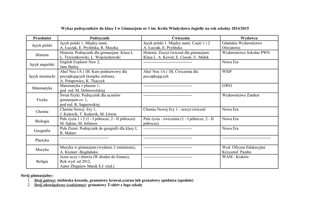Wykaz podręczników do klasy I w Gimnazjum nr 1 im. Króla Władysława Jagiełły na rok szkolny 2014/2015 Przedmiot Język polski Historia Język angielski Język niemiecki Matematyka Fizyka Chemia Biologia Geografia Plastyka Muzyka Religia Podręcznik Język polski 1. Między nami, A. Łuczak, E. Prylińska, R. Maszka Historia. Podręcznik dla gimnazjum. Klasa I, L. Trzcionkowski, L. Wojciechowski English Explorer New 2, Jane Bailey Aha! Neu 1A i 1B. Kurs podstawowy dla początkujących (książka zielona), A. Potapowicz, K. Tkaczyk Matematyka z plusem 1, pod red. M. Dobrowolskiej Świat fizyki. Podręcznik dla uczniów gimnazjum cz. 1, pod red. B. Sagnowskiej Chemia Nowej Ery 1, J. Kulawik, T. Kulawik, M. Litwin Puls życia 1 i 2 (1 - I półrocze, 2 - II półrocze) M. Sęktas, M. Jefimow Puls Ziemi. Podręcznik do geografii dla klasy I, R. Malarz ------------------------------------ Ćwiczenia Język polski 1. Między nami. Część 1 i 2 A. Łuczak, E. Prylińska Historia. Zeszyt ćwiczeń dla gimnazjum. Klasa I, A. Kowal, E. Ciosek, U. Małek ------------------------------------ Wydawca Gdańskie Wydawnictwo Oświatowe Wydawnictwo Szkolne PWN Aha! Neu 1A i 1B, Ćwiczenia dla początkujących WSiP ------------------------------------ GWO ------------------------------------ Wydawnictwo Zamkor Chemia Nowej Ery 1 - zeszyt ćwiczeń Nowa Era Puls życia - ćwiczenia (1 - I półrocze, 2 - II półrocze) ------------------------------------ Nowa Era ------------------------------------ ------------------------------------ Muzyka w gimnazjum (wydanie 2 zmienione), A. Kreiner -Bogdańska Jezus uczy i zbawia (W drodze do Emaus), Rok wyd. od 2012, Autor Zbigniew Marek S.J. (red.) ------------------------------------ Wyd. Oficyna Edukacyjna Krzysztof Pazdro WAM - Kraków ------------------------------------ Strój gimnazjalny: 1. Strój galowy: niebieska koszula, granatowy krawat,czarna lub granatowy spódnica (spodnie) 2. Strój obowiązkowy (codzienny): granatowy T-shirt z logo szkoły Nowa Era Nowa Era
