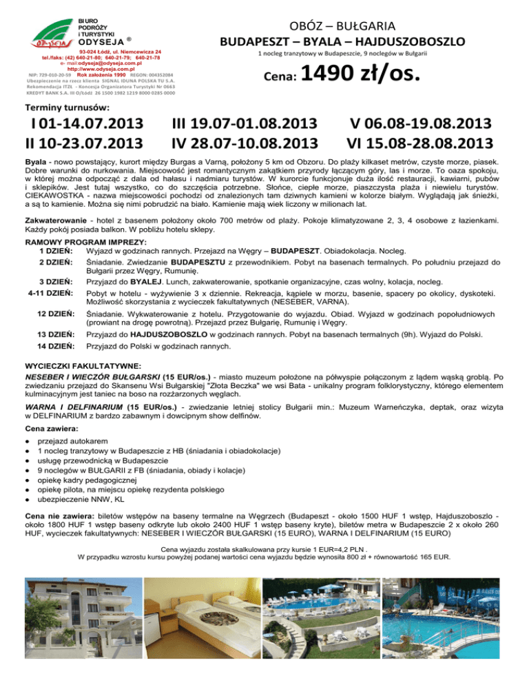 BI URO PODRÓŻY i TURYSTYKI ODYSEJA OBÓZ – BUŁGARIA BUDAPESZT – BYALA – HAJDUSZOBOSZLO ® 93-024 Łódź, ul. Niemcewicza 24 tel./faks: (42) 640-21-80; 640-21-79; 640-21-78 e- mail:[email protected] http://www.odyseja.com.pl NIP: 729-010-20-59 Rok założenia 1990 REGON: 004352084 Ubezpieczenie na rzecz klienta SIGNAL IDUNA POLSKA TU S.A. Rekomendacja ITZŁ - Koncesja Organizatora Turystyki Nr 0663 KREDYT BANK S.A. III O/Łódź 26 1500 1982 1219 8000 0285 0000 1 nocleg tranzytowy w Budapeszcie, 9 noclegów w Bułgarii Cena: 1490 zł/os. Terminy turnusów: I 01-14.07.2013 II 10-23.07.2013 III 19.07-01.08.2013 IV 28.07-10.08.2013 V 06.08-19.08.2013 VI 15.08-28.08.2013 Byala - nowo powstający, kurort między Burgas a Varną, położony 5 km od Obzoru. Do plaży kilkaset metrów, czyste morze, piasek. Dobre warunki do nurkowania. Miejscowość jest romantycznym zakątkiem przyrody łączącym góry, las i morze. To oaza spokoju, w której można odpocząć z dala od hałasu i nadmiaru turystów. W kurorcie funkcjonuje duża ilość restauracji, kawiarni, pubów i sklepików. Jest tutaj wszystko, co do szczęścia potrzebne. Słońce, ciepłe morze, piaszczysta plaża i niewielu turystów. CIEKAWOSTKA - nazwa miejscowości pochodzi od znalezionych tam dziwnych kamieni w kolorze białym. Wyglądają jak śnieżki, a są to kamienie. Można się nimi pobrudzić na biało. Kamienie mają wiek liczony w milionach lat. Zakwaterowanie - hotel z basenem położony około 700 metrów od plaży. Pokoje klimatyzowane 2, 3, 4 osobowe z łazienkami. Każdy pokój posiada balkon. W pobliżu hotelu sklepy. RAMOWY PROGRAM IMPREZY: 1 DZIEŃ: Wyjazd w godzinach rannych. Przejazd na Węgry – BUDAPESZT. Obiadokolacja. Nocleg. 2 DZIEŃ: Śniadanie. Zwiedzanie BUDAPESZTU z przewodnikiem. Pobyt na basenach termalnych. Po południu przejazd do Bułgarii przez Węgry, Rumunię. Przyjazd do BYALEJ. Lunch, zakwaterowanie, spotkanie organizacyjne, czas wolny, kolacja, nocleg. 3 DZIEŃ: 4-11 DZIEŃ: Pobyt w hotelu - wyżywienie 3 x dziennie. Rekreacja, kąpiele w morzu, basenie, spacery po okolicy, dyskoteki. Możliwość skorzystania z wycieczek fakultatywnych (NESEBER, VARNA). 12 DZIEŃ: Śniadanie. Wykwaterowanie z hotelu. Przygotowanie do wyjazdu. Obiad. Wyjazd w godzinach popołudniowych (prowiant na drogę powrotną). Przejazd przez Bułgarię, Rumunię i Węgry. 13 DZIEŃ: Przyjazd do HAJDUSZOBOSZLO w godzinach rannych. Pobyt na basenach termalnych (9h). Wyjazd do Polski. 14 DZIEŃ: Przyjazd do Polski w godzinach rannych. WYCIECZKI FAKULTATYWNE: NESEBER I WIECZÓR BUŁGARSKI (15 EUR/os.) - miasto muzeum położone na półwyspie połączonym z lądem wąską groblą. Po zwiedzaniu przejazd do Skansenu Wsi Bułgarskiej "Złota Beczka" we wsi Bata - unikalny program folklorystyczny, którego elementem kulminacyjnym jest taniec na boso na rozżarzonych węglach. WARNA I DELFINARIUM (15 EUR/os.) - zwiedzanie letniej stolicy Bułgarii min.: Muzeum Warneńczyka, deptak, oraz wizyta w DELFINARIUM z bardzo zabawnym i dowcipnym show delfinów. Cena zawiera: przejazd autokarem 1 nocleg tranzytowy w Budapeszcie z HB (śniadania i obiadokolacje) usługę przewodnicką w Budapeszcie 9 noclegów w BUŁGARII z FB (śniadania, obiady i kolacje) opiekę kadry pedagogicznej opiekę pilota, na miejscu opiekę rezydenta polskiego ubezpieczenie NNW, KL Cena nie zawiera: biletów wstępów na baseny termalne na Węgrzech (Budapeszt - około 1500 HUF 1 wstęp, Hajduszoboszlo około 1800 HUF 1 wstęp baseny odkryte lub około 2400 HUF 1 wstęp baseny kryte), biletów metra w Budapeszcie 2 x około 260 HUF, wycieczek fakultatywnych: NESEBER I WIECZÓR BUŁGARSKI (15 EURO), WARNA I DELFINARIUM (15 EURO) Cena wyjazdu została skalkulowana przy kursie 1 EUR=4,2 PLN . W przypadku wzrostu kursu powyżej podanej wartości cena wyjazdu będzie wynosiła 800 zł + równowartość 165 EUR.