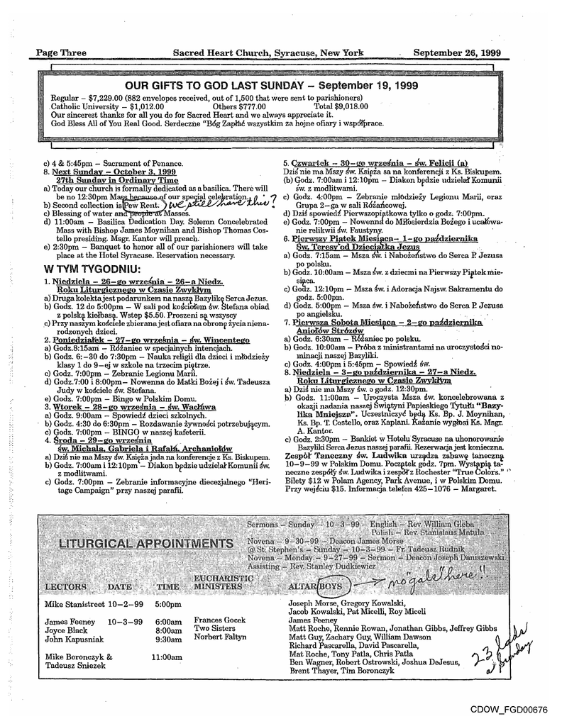 Page Three Syrac~e.; Sacred Heart Church, New York September 26, 1999 I I OUR GIFTS TO GOD LAST SUNDAY - September 19, 1999 Regular - $7,229.00 (882 envelopes received, out of 1,500 that were sent to parishioners) Others $777.00 Total $9,018.00 .Catholic University - $1,012.00 Our sincerest thanks for all you do for Sacred Heart and we always appreciate it. God Bless All of You Real Good. Serdeczne "B6g Zapl'ac wszystkim za hojne ofiary i wspDrprace. _____.____________________________~I 5. Qzwart.ek - SO-go wrzesnia - sw. Felicii (a) I~---------------------------------------------------------~--- c) 4 & 5:45pm - Sacrament of Penance. 8. Next Sunday - October 3, 1999 27th Sunday in Ordinary Time a) Today our church is formally dedicated as a basilica. There will be no 12:30pm M~ ..... " f our sp'e~~ ~e!e»ratiQn,... () • 1 b) Second collection is ew Rent;· .tve.-~~~ c) Blessing of water an asses. d) 11:00am - Basilica Dedication Day. Solemn Concelebrated Mass with Bishop James Moynihan and Bishop Thomas Costello presiding. Msgr. Kantor will preach. e) 2:30pm - Banquet to honor all of our parishioners will take place at the Hotel Syracuse. Reservation necessary. .. W TYM TVGODNIU: 1. Niedziela - 26-go wrze'nia - 26-a Niedz. . Rom Liturgicznego w Czasie Zwvldym a) Druga kolektajest podarunkem na nasz~ Bazylik~ SercaJezus. b) Godz. 12 do 5:00pm - W sali pod ko~ciorem sw. Stefana obiad z polskt kielbas~. Wstep $5.50. Proszeni sIC WSZYscy .c) Przy naszym kmiclele zbieranajest ofiara na obronr zycia nienarodzonych dzieci. 2. Poniedzia:t'ek - 27-go wrze~nia - dw. Wincentego a) Godz.8:15ani '":' Rozaniec w spec::.ialnych intencjach. b) Godz. 6:-30 do 7:30pm - Nauka religii dla dzieci i m1:'odziezy klasy 1 do 9-ej w szkole na trzecim pil(trze: c) Godz. 7:00pm - Zebranie Legionu Marn. d) Godz.7:00 i 8:00pm- Nowenna do Matki Bozej i ~w. Tadeusza Judy w ko~ciele ~w. Stefana. e) Godz. 7:00pm - Bingo w Polskirn Domu. WaclRwa 3. Wtorek - 28-go wrzesnia a) Godz. 9:00am - Spowiedz dzieci szkolnych. b) Godz. 4:30 do 6:30pm - Rozdawanie zywnoaci potrzebujllcym. c) Godz. 7:00pm - BINGO w naszej kafeterii. 4. Broda - 29- go wrzesnia .' Sw. Michala. Gabriela i Rafa1.1i. Archaniotdw a) Dzi~ nie rna Mszy dw. Ksi~zajada na konferencje z Ks. Biskupem. b) Godz. 7:00am i 12: 10prn - Diakon brdzie udzielal-Komunn sw. z rnodlitwarni. c) Godz. 7:00pm - Zebranie informacyjne diecezjalnego "Heritage Campaign" przy naszej parafii. sw. James Feeney 10-3-99 Joyce Black John Kapusniak Mike Boronczyk & Tadeusz Sniezek 6:00am 8:00am 9:30am 11:00am Frances Gocek Two Sisters Norbert Faltyn "; :' Dzis nie rna Mszy Elw. Ksiflza sa na konferencji z Ks. Biskupem. (b) Godz. 7:00am i 12:lOpm - Diakon bfdzie udziela-f Komunll sw. z modlitwami. c) Godz. 4:00pm - Zebrmue rn:ltldziezy LegiOllU Marii, oraz Grupa 2- ga w sali RoiaAcowej. d) Dzi~ spowied:l Pierwszopip-tkowa tylko 0 godz, 7:00pm. e) Godz. 7:00pm - Nowenna do Mirosierdzia Bozego i ucarowanie relikwn !!w. Faustyny. . 6. Piierws Pi tek Miesi ca- 1- 0 ~dziernika 'w. Teresy od Dzieci, ka Jezus .... ' a) Godz. 7:15am - Msza. rfw. i Naboiebstwo do Serca R Jezusa po polsku. b) G~dz. 10:00am - Msza Jw. z dziecmi na Pierwszy PirtekmieSl~Ca. . c) Goaz. 12:10pm - Msza~w. iAdoracjaNajsw. Sakramentu do godz. 5:00pm. d) Godz. 5:00pm - Msza sw. i Nabozenstwo do Serca P. Jezusa po angielsku.. '. .' 7. Pierwsza Sobota Miesi¥ca - 2-go paidziernika' AniOfow Strozdw . '. . a) Godz. 6:30am - R6ianiec po polsku. '., b) Godz. 10:00aro - Pr6ba z ministrantanrl na uroczystoffci nominacji naszej Bazyliki. c) Godz. 4:00pm i 5:45pm - Spowied~ sw. 8. Niedziela - a-go p~dziernika - 27-a Niedz. Rom Liturgicznego w Czasie ZwyklWn a) Dzid nie rna Mszy ~w. 0 godz. 12:30pm. J:» Godz. 11:00am - Uroczysta Msza ~w. koncelebrowana z okazji nadania :rlaszej 8wi1(tyni PapieskiegQ T)rtufu "B~· lika Mniejsza". Uczestruczy~ bfldlf Ks. Bp. J. Moynihan, Ks. Bp. T. CQstello, oraz Kaplani. KaZanie wyglosi Ks. Msgr. A. Kantor. .' c) Godz. 2:30pm - Bankiet w Hotelu Syracuse na uhonorowarue Bazyliki 8ercaJezus naszej parafa Rezerwacjajest konieczna Zesp6J: Taneczny ~w. Ludwika urz9-dza zabawfl taneczn! 10-9-99 w Polskim Domu. Pocze:tek godz. 7pm. Wystilpi~ taneczne zespMy sw. Ludwika i zespotz Rochester "True Colors." Bilety $12 w Polam Agency, Park Avenue, i w Polskim Domu. Przy wejlciu $15. Informacjatelefon 425-1076 - Margaret. I'· Joseph Morse, Gregory Kowalski, Jacob Kowalski, Pat Micelli, Roy Miceli James Feeney Matt Roche, Rennie Rowan, Jonathan Gibbs, Jeffrey Gibbs Matt Guy, Zachary Guy, William Dawson Richard Pascarella, David Pascarella, Mat Roche, Tony Patla, Chris Patla Ben Wagner, Robert Ostrowski, Joshua DeJesus, Brent Thayer, Tim Boronczyk CDOW_FGD00676