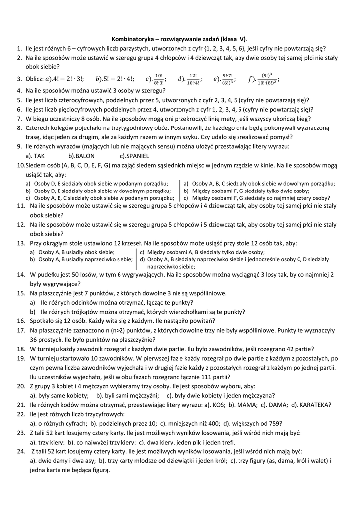 Kombinatoryka – rozwiązywanie zadań (klasa IV).