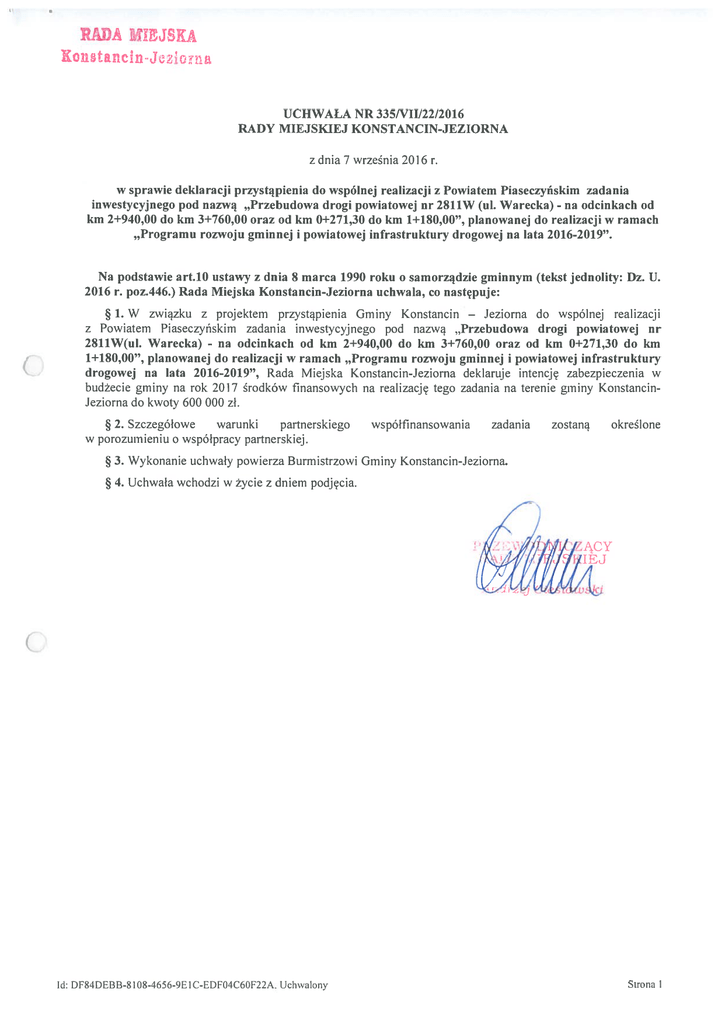 PAlM WJSK UCHWAŁA NR 335/VII/22/2016 RADY MIEJSKIEJ KONSTANCIN-JEZIORNA z dnia 7 września 2016 r. iy sprawie deklaracji przystąpienia do wspólnej realizacji z Powiatem Piaseczyńskim zadania inwestycyjnego pod nazwą „Przebudowa drogi powiatowej nr 2811W (ni. Warecka) na odcinkach od krn 2+940,00 do km 3+760,00 oraz od krn 0+271,30 do krn 1+180,00”, planowanej do realizacji w ramach „Programu rozwoju gminnej i powiatowej infrastruktury drogowej na lata 2016-2019”. - Na podstawie art.10 ustawy z dnia 8 marca 1990 roku o samorządzie gminnym (tekst jednolity: Dz. U. 2016 r. poz.446.) Rada Miejska Konstancin-Jeziorna uchwala, co następuje: 1. W związku z projektem przystąpienia Gminy Konstancin Jeziorna do wspólnej realizacji z Powiatem Piaseczyóskim zadania inwestycyjnego pod nazwą .„Przebudowa drogi powiatowej nr 2811W(uI. Warecka) na odcinkach od krn 2+940,00 do krn 3+760,00 oraz od krn 0+271,30 do krn 1+180,00”, planowanej do realizacji w ramach „Programu rozwoju gminnej i powiatowej infrastruktury drogowej na lata 2016-2019”, Rada Miejska Konstancin-Jezioma deklaruje intencję zabezpieczenia w budżecie gminy na rok 2017 środków finansowych na realizację tego zadania na terenie gminy Konstancin Jeziorna do kwoty 600 000 zł. — - 2. Szczegółowe partnerskiego warunki w porozumieniu o współpracy partnerskiej. współfinansowania zadania określone zostaną 3. Wykonanie uchwały powierza Burmistrzowi Gminy Konstancin-Jeziorna. 4. Uchwala wchodzi w Życie z dniem podjęcia. J Id: DF84DEBB-8108-4656-9EIC-EDFO4C6OF22A. Uchwalony Strona I UZASADNIENIE do UCHWAŁY NR 335/VII/22/2016 RADY KONSTANCIN MIEJSKIEJ -JEZIORNA z dnia 7 września 2016 roku w sprawie deklaracji przystąpienia do wspólnej realizacji zadania inwestycyjnego pn. „Przebudowa drogi powiatowej nr 2811W (ni. Warecka) na odcinkach od krn 2+940,00 do krn 3+760,00 oraz od krn 0+271,30 do krn 1+180,00”, planowanej do realizacji w ramach „Programu rozwoju gminnej i powiatowej infrastruktury drogowej na lata 2016-2019”. - Powiat Piaseczyński planuje w 2017 r. przebudowę drogi powiatowej Nr 2811W (Baniocha Konstancin-Jeziorna) zlokalizowanej na terenie Konstancin-Jeziorna Gminy (tj. ul. Wareckiej) oraz Gminy Góra Kalwaria, pod warunkiem otrzymania dotacji celowej z budżetu państwa w ramach „Programu Rozwoju gminnej i powiatowej infrastruktury drogowej na lata 2016 2019”. Wkład własny jakim będzie dysponował Powiat Piaseczyński jest nie wystarczający w stosunku do szacowanych kosztów inwestycji. Szanse na pozyskanie dotacji celowej zwiększają się, w przypadku partycypacji finansowej Gmin w realizacji zadania. Biorąc pod uwagę zły stan techniczny drogi oraz systematyczny wzrost natężenia w ruchu drogowym. Rada Miejska Konstancin-Jeziorna składa deklarację o zabezpieczeniu w budżecie gminy na rok 2017 środków finansowych na realizację zadania. Ulica Warecka w Konstancinie-Jeziornie stanowi ważny ciąg komunikacyjny w układzie drogowym gminy. Podjęcie niniejszej uchwaly umożliwi Powiatowi Piaseczyńskiemu złożenie kompletnego wniosku do Wojewody Mazowieckiego. Lista zakwalifikowanych o dofinansowanie wniosków zostanie ogłoszona przez Wojewodę Mazowieckiego w grudniu 2016 roku. Ostateczną decyzję o realizacji inwestycji Powiat Piaseczyński podejmie w roku 2017. — - Id: DF84DEBB-8108-4656-9EIC-EDFO4C6OF22A. IJchwalony Strona 1
