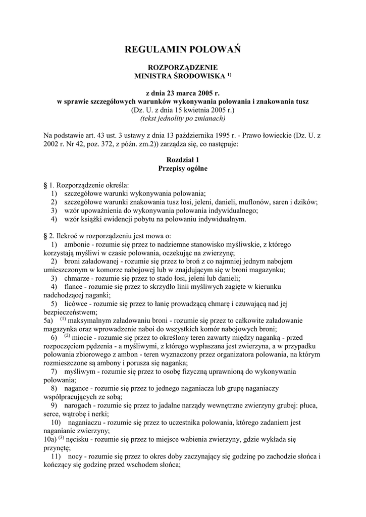 REGULAMIN POLOWAŃ ROZPORZĄDZENIE MINISTRA ŚRODOWISKA 1) z dnia 23 marca 2005 r. w sprawie szczegółowych warunków wykonywania polowania i znakowania tusz (Dz. U. z dnia 15 kwietnia 2005 r.) (tekst jednolity po zmianach) Na podstawie art. 43 ust. 3 ustawy z dnia 13 października 1995 r. - Prawo łowieckie (Dz. U. z 2002 r. Nr 42, poz. 372, z późn. zm.2)) zarządza się, co następuje: Rozdział 1 Przepisy ogólne § 1. Rozporządzenie określa: 1) szczegółowe warunki wykonywania polowania; 2) szczegółowe warunki znakowania tusz łosi, jeleni, danieli, muflonów, saren i dzików; 3) wzór upoważnienia do wykonywania polowania indywidualnego; 4) wzór książki ewidencji pobytu na polowaniu indywidualnym. § 2. Ilekroć w rozporządzeniu jest mowa o: 1) ambonie - rozumie się przez to nadziemne stanowisko myśliwskie, z którego korzystają myśliwi w czasie polowania, oczekując na zwierzynę; 2) broni załadowanej - rozumie się przez to broń z co najmniej jednym nabojem umieszczonym w komorze nabojowej lub w znajdującym się w broni magazynku; 3) chmarze - rozumie się przez to stado łosi, jeleni lub danieli; 4) flance - rozumie się przez to skrzydło linii myśliwych zagięte w kierunku nadchodzącej naganki; 5) licówce - rozumie się przez to łanię prowadzącą chmarę i czuwającą nad jej bezpieczeństwem; 5a) (1) maksymalnym załadowaniu broni - rozumie się przez to całkowite załadowanie magazynka oraz wprowadzenie naboi do wszystkich komór nabojowych broni; 6) (2) miocie - rozumie się przez to określony teren zawarty między naganką - przed rozpoczęciem pędzenia - a myśliwymi, z którego wypłaszana jest zwierzyna, a w przypadku polowania zbiorowego z ambon - teren wyznaczony przez organizatora polowania, na którym rozmieszczone są ambony i porusza się naganka; 7) myśliwym - rozumie się przez to osobę fizyczną uprawnioną do wykonywania polowania; 8) nagance - rozumie się przez to jednego naganiacza lub grupę naganiaczy współpracujących ze sobą; 9) narogach - rozumie się przez to jadalne narządy wewnętrzne zwierzyny grubej: płuca, serce, wątrobę i nerki; 10) naganiaczu - rozumie się przez to uczestnika polowania, którego zadaniem jest naganianie zwierzyny; 10a) (3) nęcisku - rozumie się przez to miejsce wabienia zwierzyny, gdzie wykłada się przynętę; 11) nocy - rozumie się przez to okres doby zaczynający się godzinę po zachodzie słońca i kończący się godzinę przed wschodem słońca; 12) otoku - rozumie się przez to linkę, na której prowadzony jest pies; 13) (4) pędzeniu - rozumie się przez to naganianie zwierzyny przez nagankę w kierunku linii myśliwych stojących na stanowiskach, a w przypadku polowania zbiorowego z ambon naganianie zwierzyny przez nagankę poruszającą się w miocie; 14) podkładaczu z psem - rozumie się przez to myśliwego pędzącego zwierzynę z psem lub psami w miocie; 14a) (5) polowaniu indywidualnym - rozumie się przez to polowanie wykonywane przez jednego myśliwego działającego niezależnie od innych myśliwych znajdujących się w tym samym obwodzie łowieckim oraz polowanie na drapieżniki przy stogach i norach, wykonywane przez więcej niż jednego myśliwego z udziałem podkładacza z psem, oraz polowanie na ptactwo, w którym współpracuje ze sobą nie więcej niż trzech myśliwych korzystających z psa; 14b) (6) polowaniu przy stogach - rozumie się przez to polowanie na drapieżniki z udziałem psów, na którym myśliwi zajmują stanowiska przy stogach i oddają strzały wyłącznie do zwierzyny odchodzącej od stogów; 14c) (7) polowaniu zbiorowym - rozumie się przez to polowanie wykonywane z udziałem co najmniej dwóch współdziałających ze sobą myśliwych albo myśliwego i naganiacza, zorganizowane przez dzierżawcę albo zarządcę obwodu łowieckiego, prowadzone przez prowadzącego polowanie; polowaniem zbiorowym nie jest poszukiwanie postrzałka, o którym mowa w § 5 ust. 1 pkt 2 i 3; 14d) (8) polowaniu zbiorowym z ambon - rozumie się przez to polowanie zbiorowe, na którym myśliwi zajmują stanowiska wyłącznie na ambonach umożliwiających oddanie strzału z wysokości co najmniej 2 m (odległość od powierzchni gruntu do podłogi w ambonie) i na którym każde pędzenie rozpoczyna się i kończy o czasie wyznaczonym przez prowadzącego polowanie; 15) postrzałku - rozumie się przez to zranioną w wyniku postrzału zwierzynę; 15a) (9) prowadzącym polowanie - rozumie się przez to osobę wyznaczoną przez dzierżawcę lub zarządcę obwodu łowieckiego do kierowania przebiegiem polowania zbiorowego; 16) przyspieszniku - rozumie się przez to urządzenie zmniejszające, przy oddawaniu strzału, siłę oporu języka spustowego; 17) przystrzelaniu broni - rozumie się przez to wyregulowanie przyrządów celowniczych, a następnie sprawdzenie na strzelnicy celności oddawanych strzałów; 18) stanowisku - rozumie się przez to miejsce, na którym myśliwy podczas polowania zbiorowego oczekuje na zwierzynę. Rozdział 2 Warunki wykonywania polowania § 3. (10) 1. Do wykonywania polowania oraz odstrzału zwierząt stanowiących nadzwyczajne zagrożenie dla życia, zdrowia lub gospodarki człowieka dopuszczona jest wyłącznie myśliwska broń palna długa centralnego zapłonu, o lufach gwintowanych lub gładkich, z wyłączeniem broni czarnoprochowej, pistoletów i rewolwerów, z której po maksymalnym załadowaniu można oddać najwyżej sześć pojedynczych strzałów, z tym że do magazynka broni samopowtarzalnej można załadować jednorazowo najwyżej dwa naboje. 2. Używana do polowania broń myśliwska o lufach gwintowanych musi posiadać kaliber minimum 5,6 mm i być przeznaczona do strzelania amunicją charakteryzującą się energią pocisku nie mniejszą niż 1000 J w odległości 100 m od wylotu lufy. 3. Polowanie na zwierzynę grubą odbywa się, z zastrzeżeniem ust. 4, wyłącznie z użyciem broni myśliwskiej, o której mowa w ust. 2, ora