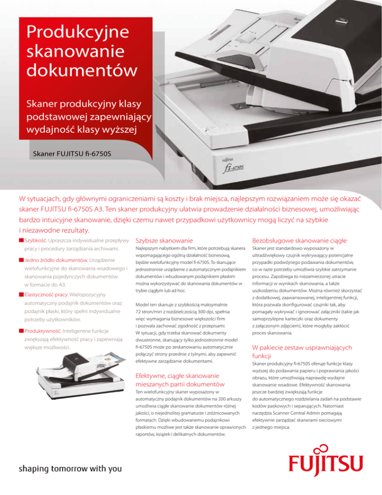 Produkcyjne skanowanie dokumentów Skaner produkcyjny klasy podstawowej zapewniający wydajność klasy wyższej Skaner FUJITSU fi-6750S W sytuacjach, gdy głównymi ograniczeniami są koszty i brak miejsca, najlepszym rozwiązaniem może się okazać skaner FUJITSU fi-6750S A3. Ten skaner produkcyjny ułatwia prowadzenie działalności biznesowej, umożliwiając bardzo intuicyjne skanowanie, dzięki czemu nawet przypadkowi użytkownicy mogą liczyć na szybkie i niezawodne rezultaty. Szybkość. Upraszcza indywidualne przepływy Szybsze skanowanie Bezobsługowe skanowanie ciągłe pracy i procedury zarządzania archiwami. Najlepszym nabytkiem dla firm, które potrzebują skanera wspomagającego ogólną działalność biznesową, będzie wielofunkcyjny model fi-6750S. To skanujące jednostronnie urządzenie z automatycznym podajnikiem dokumentów i wbudowanym podajnikiem płaskim można wykorzystywać do skanowania dokumentów w trybie ciągłym lub ad hoc. Skaner jest standardowo wyposażony w ultradźwiękowy czujnik wykrywający potencjalne przypadki podwójnego podawania dokumentów, co w razie potrzeby umożliwia szybkie zatrzymanie procesu. Zapobiega to niezamierzonej utracie informacji w wynikach skanowania, a także uszkodzeniu dokumentów. Można również skorzystać z dodatkowej, zaawansowanej, inteligentnej funkcji, która pozwala skonfigurować czujniki tak, aby pomagały wykrywać i ignorować załączniki (takie jak samoprzylepne karteczki oraz dokumenty z załączonym zdjęciem), które mogłyby zakłócić proces skanowania. Jedno źródło dokumentów. Urządzenie wielofunkcyjne do skanowania wsadowego i skanowania pojedynczych dokumentów w formacie do A3. Elastyczność pracy. Wielopozycyjny automatyczny podajnik dokumentów oraz podajnik płaski, który spełni indywidualne potrzeby użytkowników. Produktywność. Inteligentne funkcje zwiększają efektywność pracy i zapewniają większe możliwości. Model ten skanuje z szybkością maksymalnie 72 stron/min z rozdzielczością 300 dpi, spełnia więc wymagania biznesowe większości firm i pozwala zachować zgodność z przepisami. W sytuacji, gdy trzeba skanować dokumenty dwustronne, skanujący tylko jednostronnie model fi-6750S może po zeskanowaniu automatycznie połączyć strony przednie z tylnymi, aby zapewnić efektywne zarządzanie dokumentami. Efektywne, ciągłe skanowanie mieszanych partii dokumentów Ten wielofunkcyjny skaner wyposażony w automatyczny podajnik dokumentów na 200 arkuszy umożliwia ciągłe skanowanie dokumentów różnej jakości, o niejednolitej gramaturze i zróżnicowanych formatach. Dzięki wbudowanemu podajnikowi płaskiemu możliwe jest także skanowanie oprawionych raportów, książek i delikatnych dokumentów. W pakiecie zestaw usprawniających funkcji Skaner produkcyjny fi-6750S oferuje funkcje klasy wyższej do podawania papieru i poprawiania jakości obrazu, które umożliwiają naprawdę wydajne skanowanie wsadowe. Efektywność skanowania jeszcze bardziej zwiększają funkcje do automatycznego rozdzielania zadań na podstawie kodów paskowych i separujących. Natomiast narzędzia Scanner Central Admin pomagają efektywnie zarządzać skanerami sieciowymi z jednego miejsca. Oprogramowanie oferowane w pakiecie Firma Fujitsu opracowała najlepszy w swojej klasie sterownik skanera oraz oprogramowanie do skanowania i przetwarzania obrazu Oprogramowanie PaperStream IP — zaawansowane udoskonalanie jakości obrazu Oprogramowanie PaperStream Capture — rozszerzone funkcje skanowania PaperStream IP to sterownik do skanera fi-6750S. Sterownik ten jest w pełni Oprogramowanie PaperStream Capture to łatwe zgodny z interfejsami TWAIN i ISIS, stanowiącymi standard branżowy. Ponadto w obsłudze narzędzie do skanowania, które pozwala zawiera w konfiguracji standardowej zaawansowane funkcje przetwarzania użytkownikom łatwo konfigurować procedury obrazu, które automatycznie usuwają szumy i wzór tła oraz powiększają znaki, skanowania, obejmujące wszystkie ustawienia i parametry umożliwiając generowanie wyjątkowo wyraźnych, wysokiej jakości obrazów, konfiguracyjne niezbędne do sterowania tym procesem, które użytkownik może bezpośrednio zaimportować do przepływu pracy. od samego skanowania po przekazanie obrazu do przepływu pracy zdefiniowanego przez użytkownika Sterownik PaperStream IP jest wyposażony w intuicyjny, łatwy w obsłudze interfejs, lub firmę. który można przełączać między trybem administratora i użytkownika, aby uprościć proces skanowania i ograniczyć błędy popełniane przez użytkownika. Utworzone profile można później uruchamiać jednym kliknięciem, a te najczęściej używane podłączyć do W sterowniku PaperStream IP wprowadzono także nowy tryb Assisted przycisku skanowania umieszczonego na panelu przednim Scanning, w którym — zamiast ręcznie dostrajać kolejne parametry skanera fi-6750S, aby uprościć cały proces. skanowania — użytkownik może wzrokowo wybrać spośród obrazów widocznych na stronie ten o najlepszej jakości. Specyfikacje Model Obsługiwane systemy operacyjne Typ skanera Tryby skanowania Typ czujnika obrazu Źródło światła fi-6750S Więcej informacji na stronie http://emea.fujitsu.com/fiscannerfaqs/ Automatyczny podajnik dokumentów (ADF) i podajnik płaski Jednostronne, w kolorze / w skali szarości / mono 2 matryce Colour CCD 4 lampy wyładowcze z białą zimną katodą ADF — minimalnie: A8 w trybie portretowym (52 x 74 mm)/maksymalnie: A3 (297 x 420 mm) Rozmiar dokumentu Skanowanie długich dokumentów: 3048 mm*1 Podajnik płaski — maksymalnie: A3 (297 x 420 mm) Zalecana gramatura papieru 31–209 g/m2 Szybkość skanowania (A4 w trybie pejzażowym)*2 Jednostronne: 72 strony/min (200, 300 dpi) W kolorze*3 / w skali szarości*3 / mono Podajnik płaski: 0,6 s (200 dpi), 0,7 s (300 dpi) Jednostronne: 55 stron/min (200, 300 dpi) Szybkość skanowania (A4 w trybie portretowym)*2 W kolor